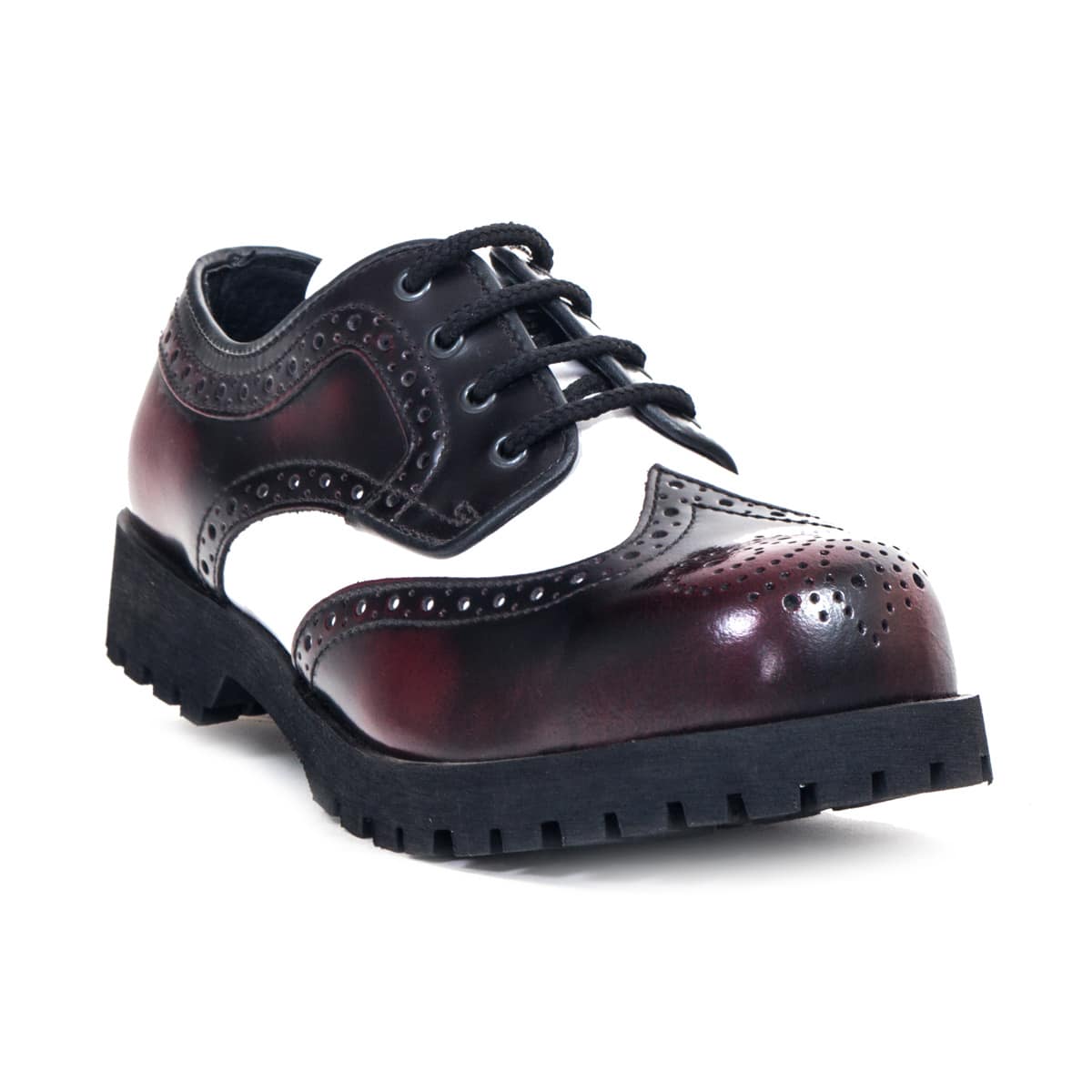 4 – Loch Halbschuh mit Stahlkappe, Gummilippe und Quernaht. Mit Fullbrogue – Lochverzierung, 2 – farbigem Glasttleder, poliert, glänzend. Für das Modell mit Burgundy rub – off Leder wird ein Leder mit einer speziellen Wachsbeschichtung verwendet. Die typische Farbgebung entsteht durch eine spezielle Bürsttechnik, Jeder Schuh wird am Ende der Produktionskette von Hand individuell gebürstet. Die widerstandsfähige Gummisohle ist mit Zierschrauben bestückt.