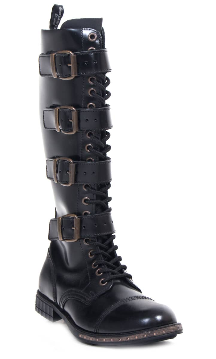20-Loch Stiefel im Steampunk-Style mit vier Schnallen, messingfarbenen Schließen und Ösen. Gefertigt ohne Stahlkappe, jedoch mit Quernaht und flachen Leisten.