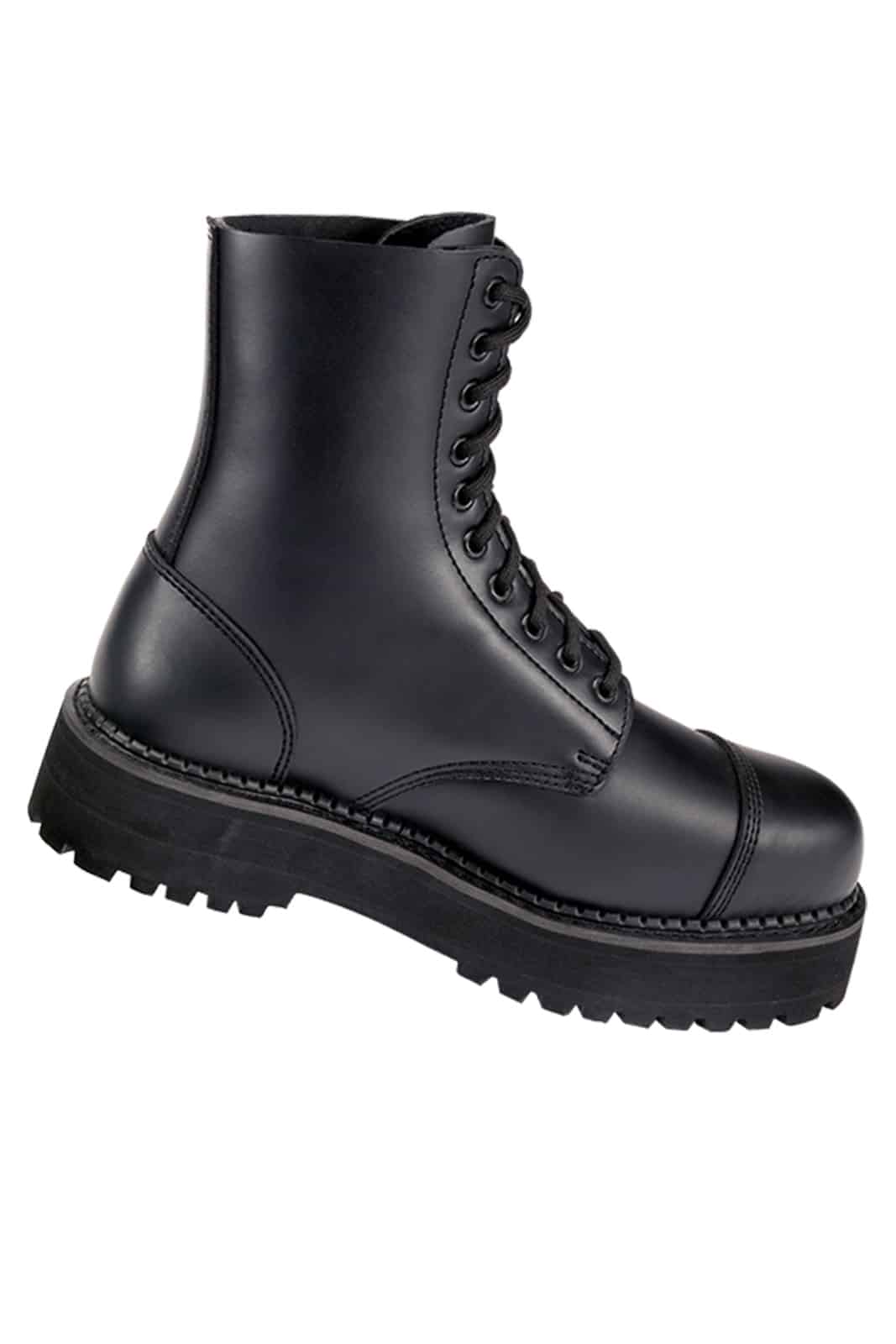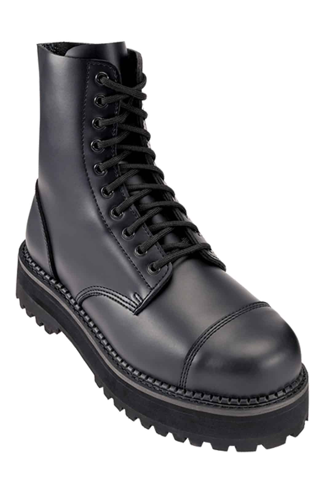 Diese markanten Plateau-Stiefel stehen für kompromisslosen Style und robuste Qualität. Das glatte, hochwertige Echtleder verleiht ihnen eine klare, kraftvolle Optik, während die 10-Loch-Schnürung für sicheren Halt und eine klassische Silhouette sorgt. Die geklebte und genähte Plateau-Profilsohle bietet Stabilität und Trittsicherheit, ergänzt durch eine integrierte Stahlkappe für zusätzliche Strapazierfähigkeit – perfekt für Szene-Looks mit Haltung.