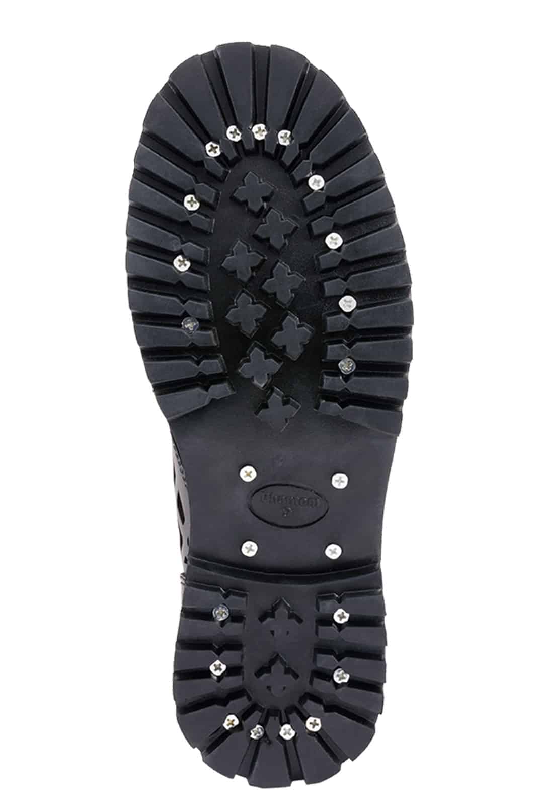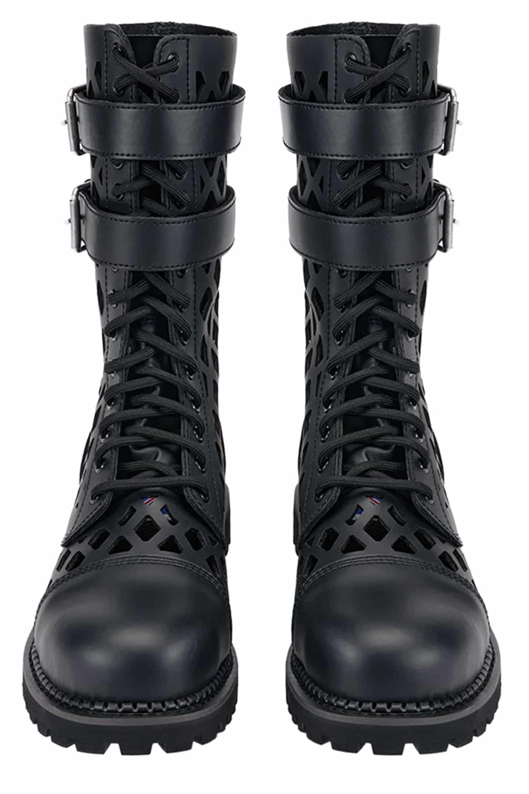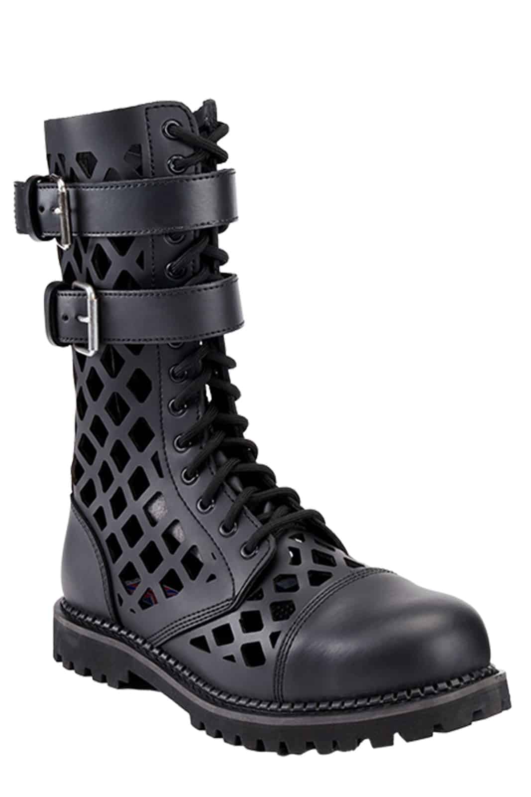 Diese außergewöhnlichen Stiefel vereinen markantes Design mit robuster Funktionalität. Mit einer klassischen 14-Loch-Schnürung und zwei verstellbaren Lederschnallen am Schaft bieten sie sicheren Halt und individuellen Sitz. Die auffälligen Ausstanzungen über den gesamten Schaft sorgen nicht nur für eine extravagante Optik, sondern auch für ein luftiges Tragegefühl – ideal für wärmere Tage oder als stylisches Statement. Die stabile Stahlkappe schützt zuverlässig die Zehen, während die geschraubte und zusätzlich geklebte Sohle für besondere Langlebigkeit und Strapazierfähigkeit sorgt. Ein Stiefel für alle, die kompromisslosen Stil mit Funktion verbinden wollen.
