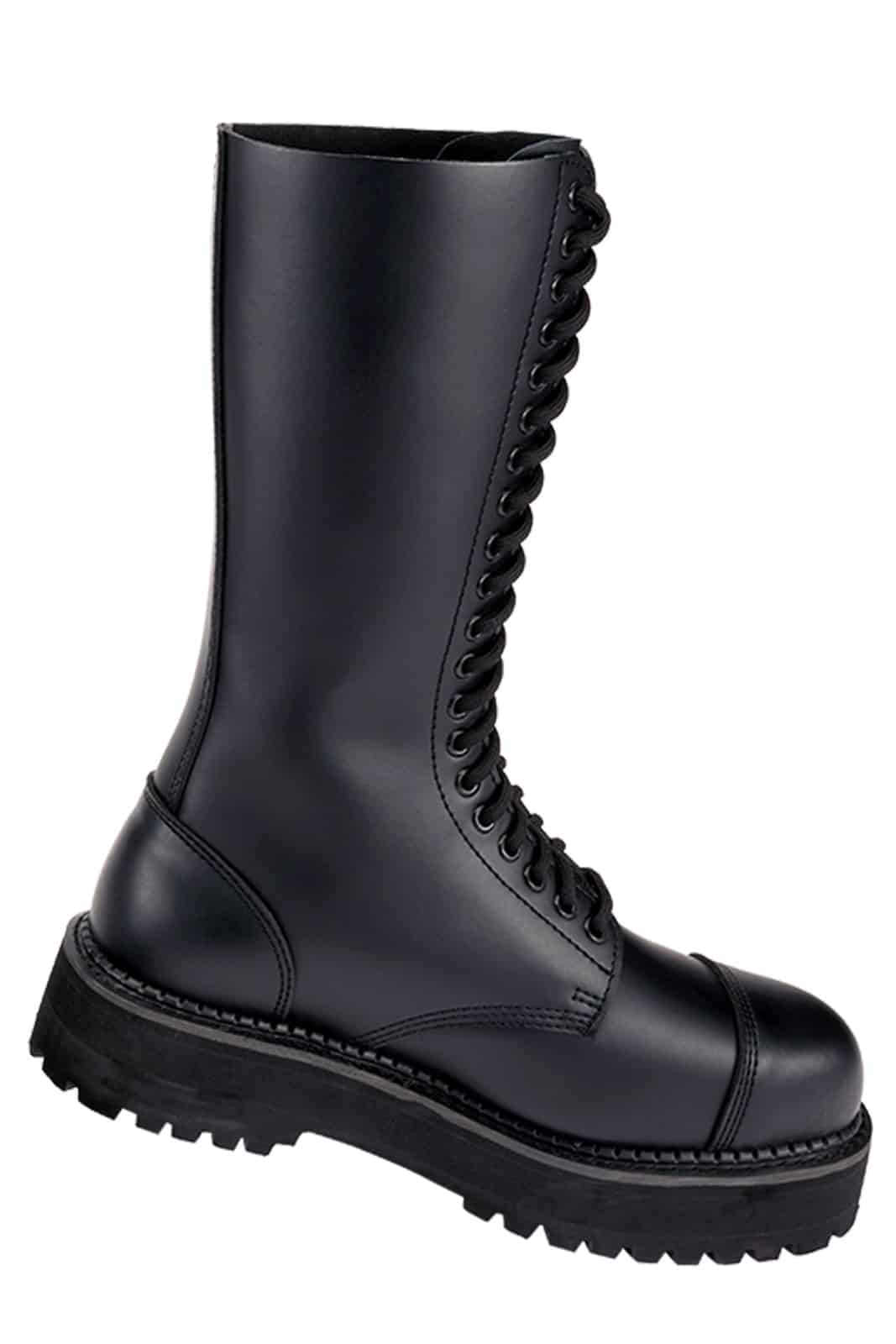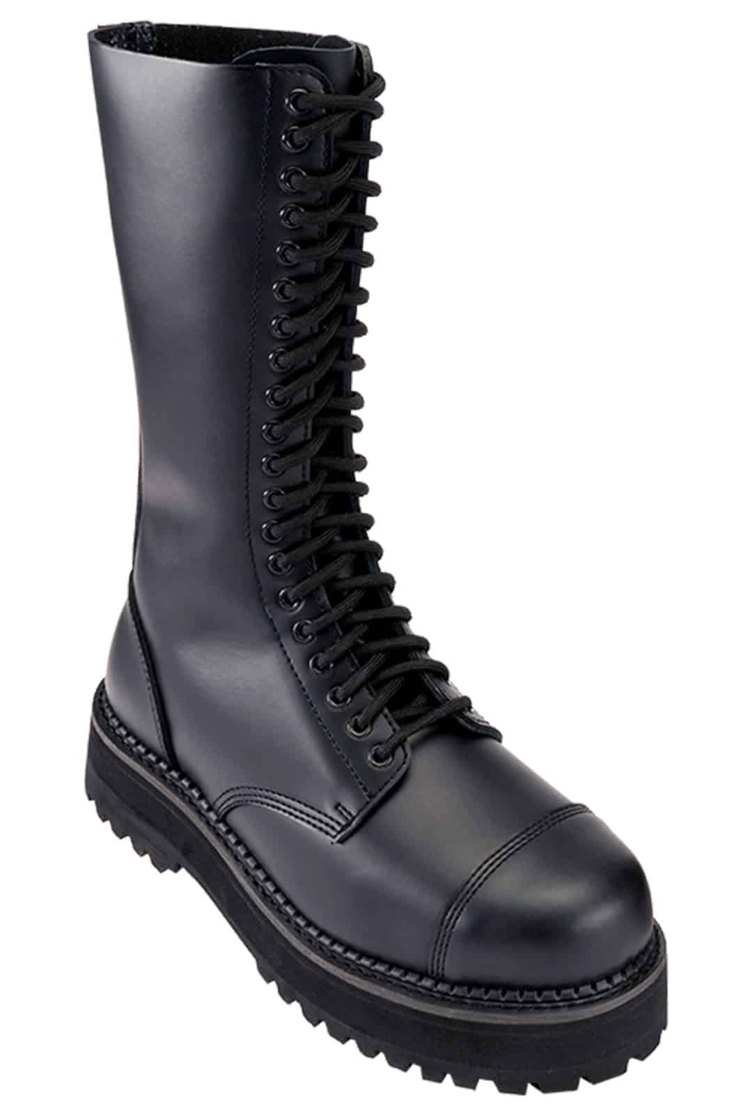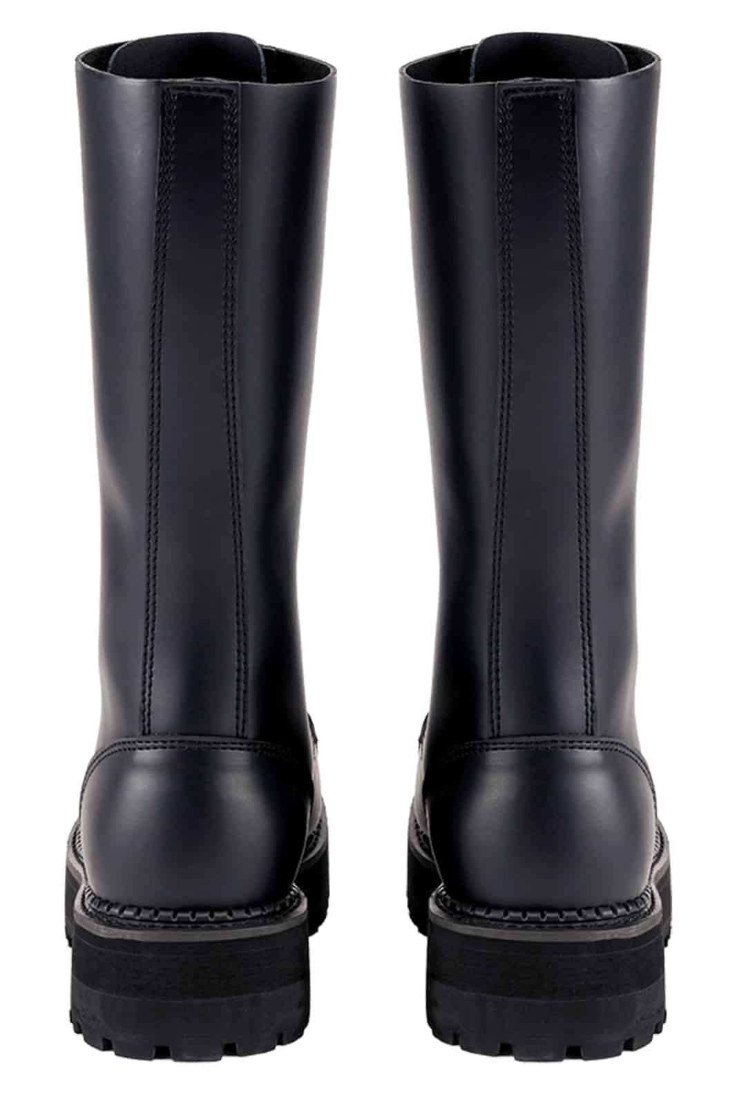 Diese extrem markanten Plateau-Stiefel stehen für maximale Präsenz und kompromisslosen Style. Das hochwertige, glatte Echtleder trifft auf eine kraftvolle 20-Loch-Schnürung, die dem Schaft Höhe und Dominanz verleiht. Die geklebte und genähte Plateau-Profilsohle sorgt für Stabilität und sicheren Stand, während die integrierte Stahlkappe Robustheit und Langlebigkeit garantiert – gemacht für starke Statements und konsequente Looks.
