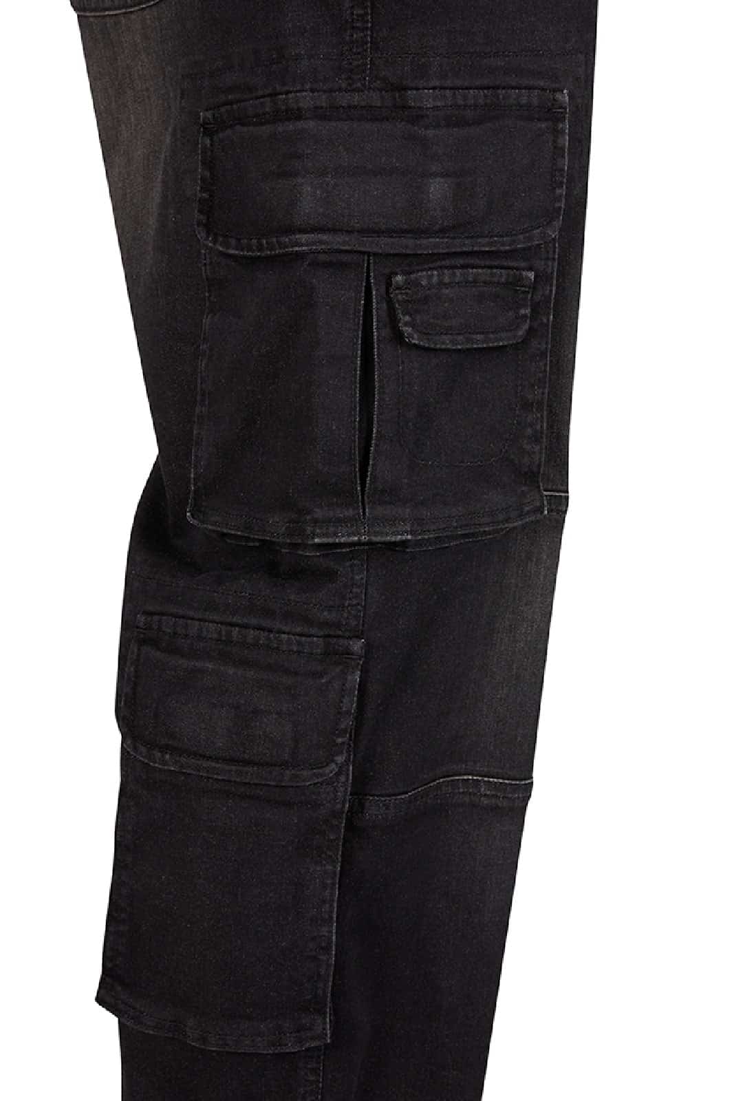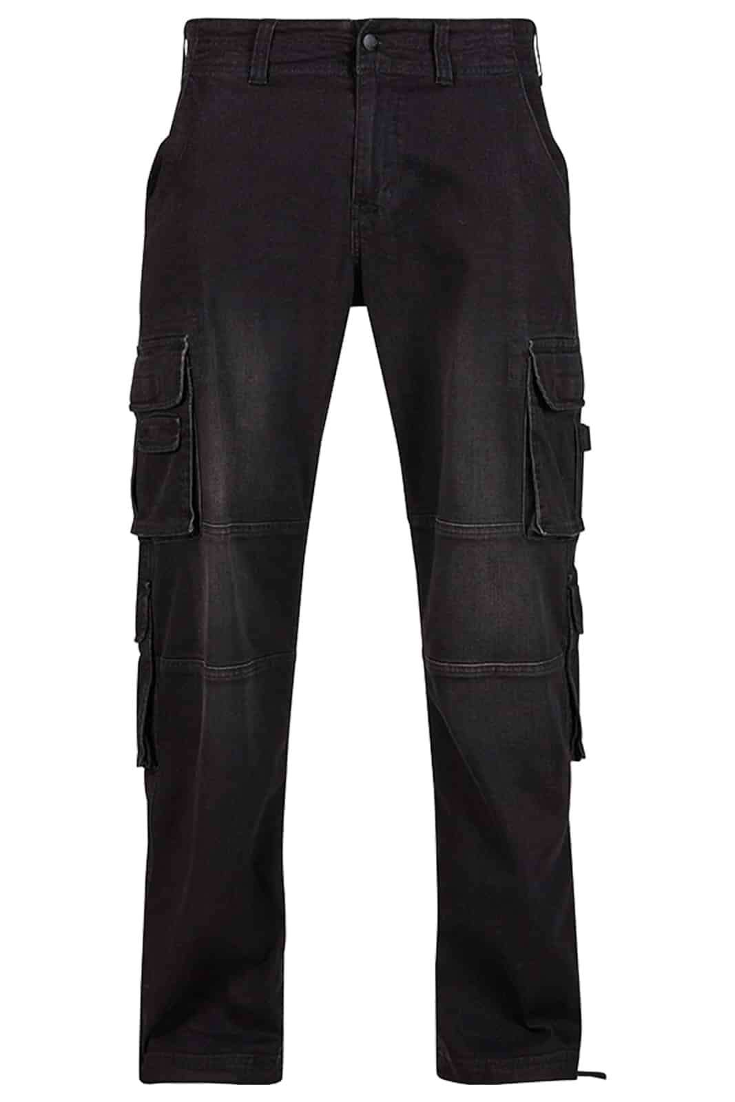 Robuste schwarze Cargo-Jeans mit lässigem Straight-Fit und dezentem Wasch-Effekt. Die Hose kombiniert klassischen Denim mit funktionalen Taschen und verstellbarem Tunnelzug am Beinende – perfekt für Alltag, Streetwear und Alternative-Styles.