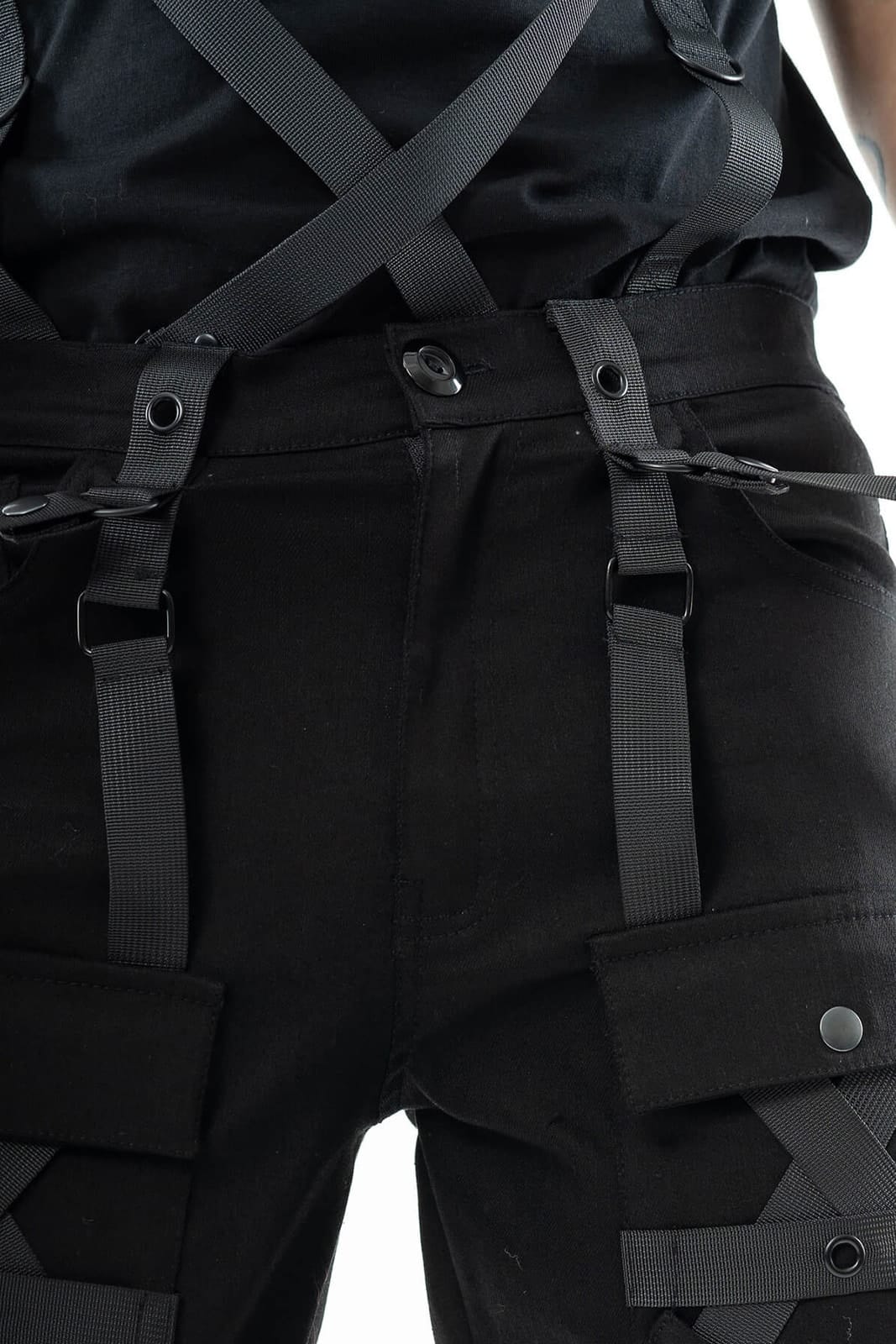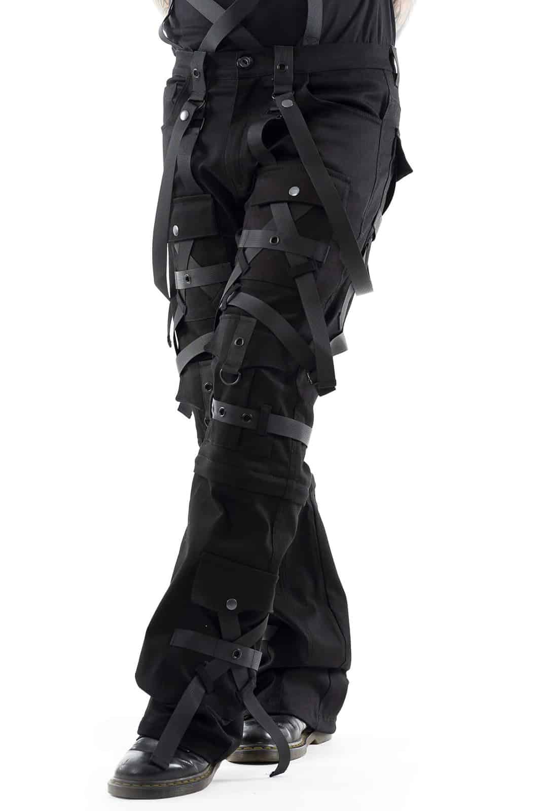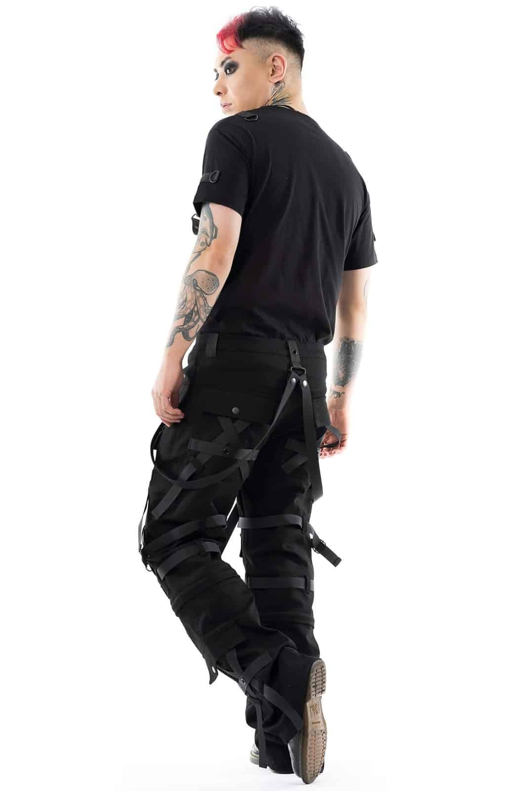 Die Hose Cairo ist ein kompromissloses Statement urbaner Dunkelheit – perfekt für Industrial-, Cyber- und Gothic-Looks. Gefertigt aus einem robusten Stretch-Mix, bietet sie hohen Tragekomfort bei maximalem Stylefaktor. Die zahlreichen Riemen, Ösen, D-Ringe und abnehmbaren Gurte erzeugen ein komplexes Layering aus Strukturen und Symbolik. Große Cargotaschen, verstärkte Kniepartien und die aufwendige Kreuzgurt-Optik verleihen der Silhouette eine martialische Präzision.