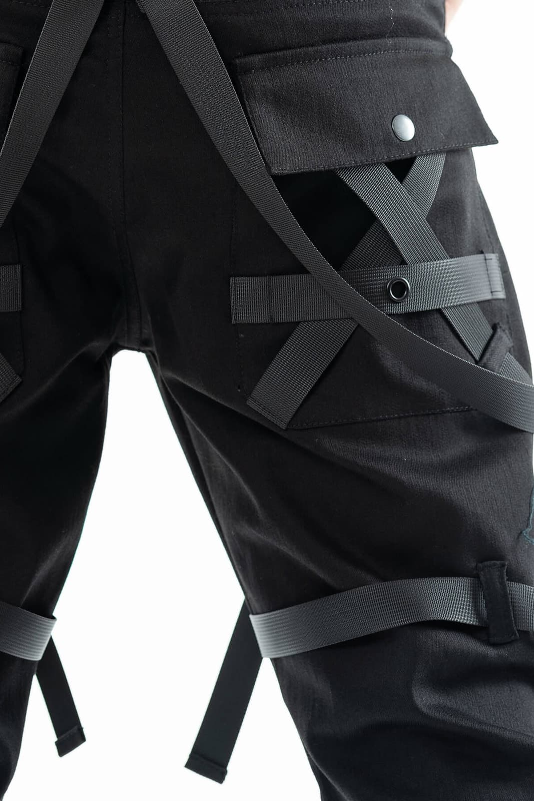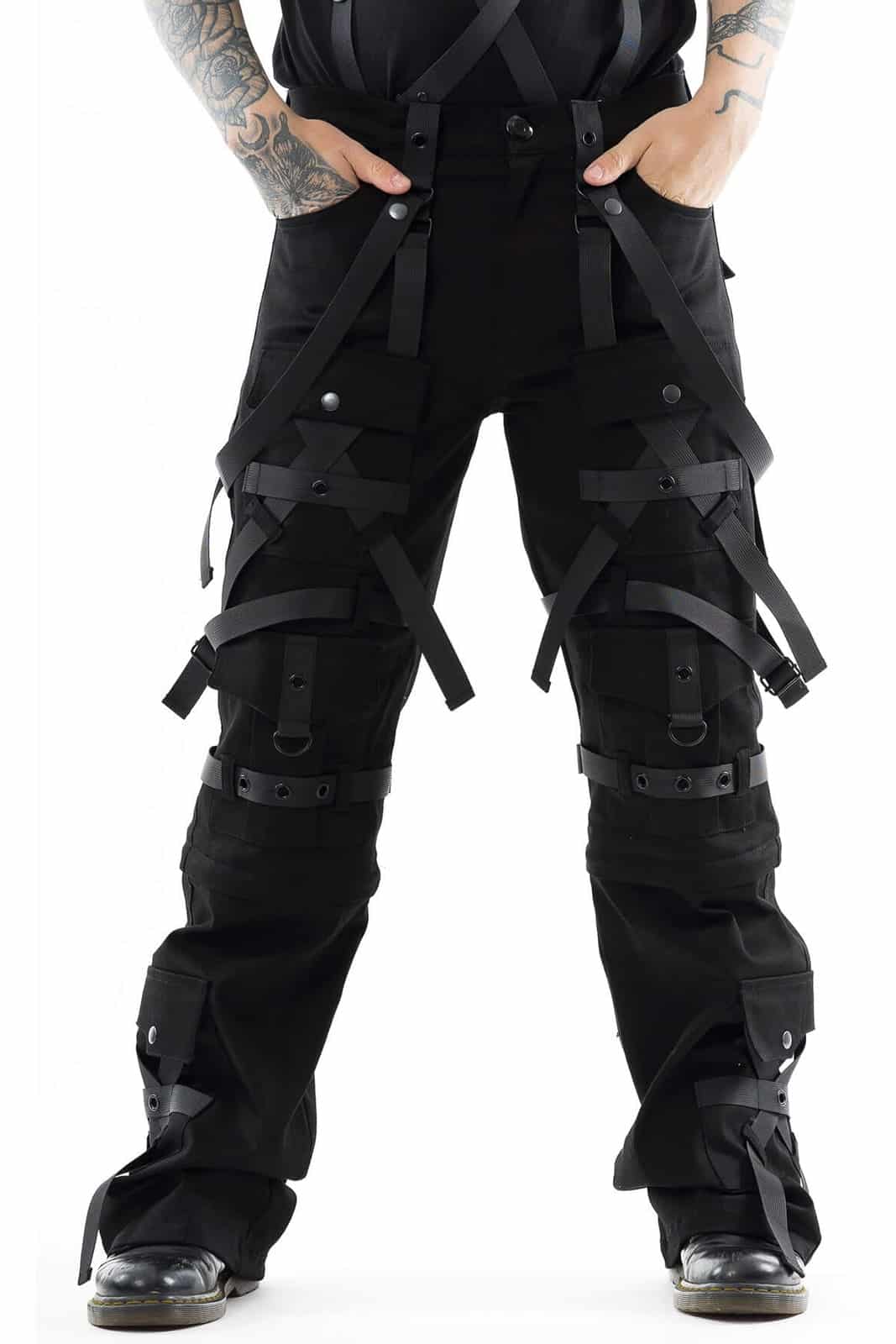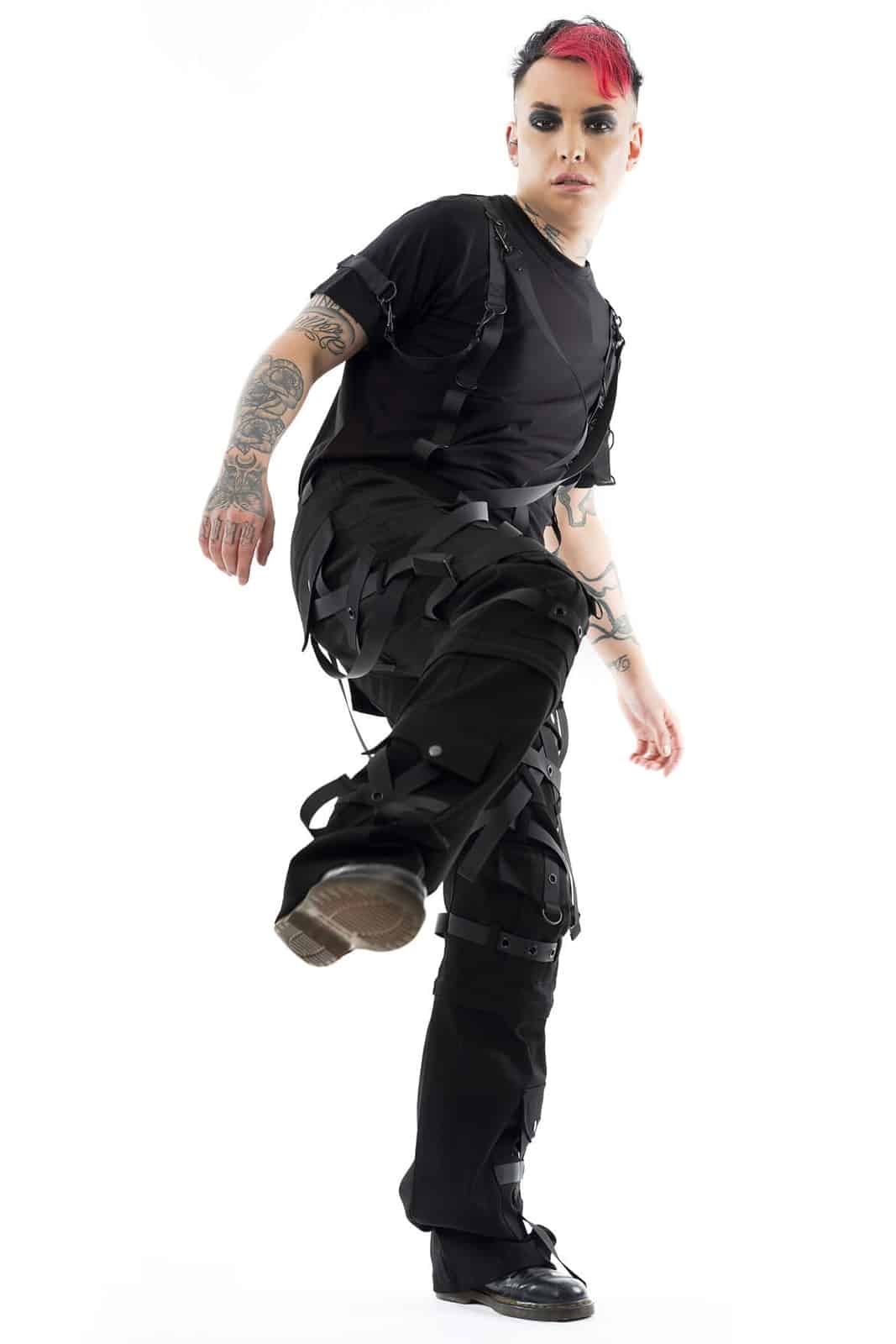 Die Hose Cairo ist ein kompromissloses Statement urbaner Dunkelheit – perfekt für Industrial-, Cyber- und Gothic-Looks. Gefertigt aus einem robusten Stretch-Mix, bietet sie hohen Tragekomfort bei maximalem Stylefaktor. Die zahlreichen Riemen, Ösen, D-Ringe und abnehmbaren Gurte erzeugen ein komplexes Layering aus Strukturen und Symbolik. Große Cargotaschen, verstärkte Kniepartien und die aufwendige Kreuzgurt-Optik verleihen der Silhouette eine martialische Präzision.