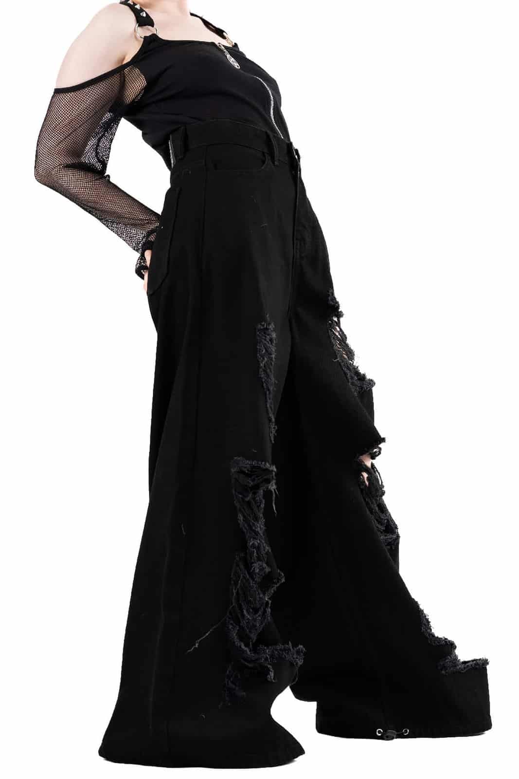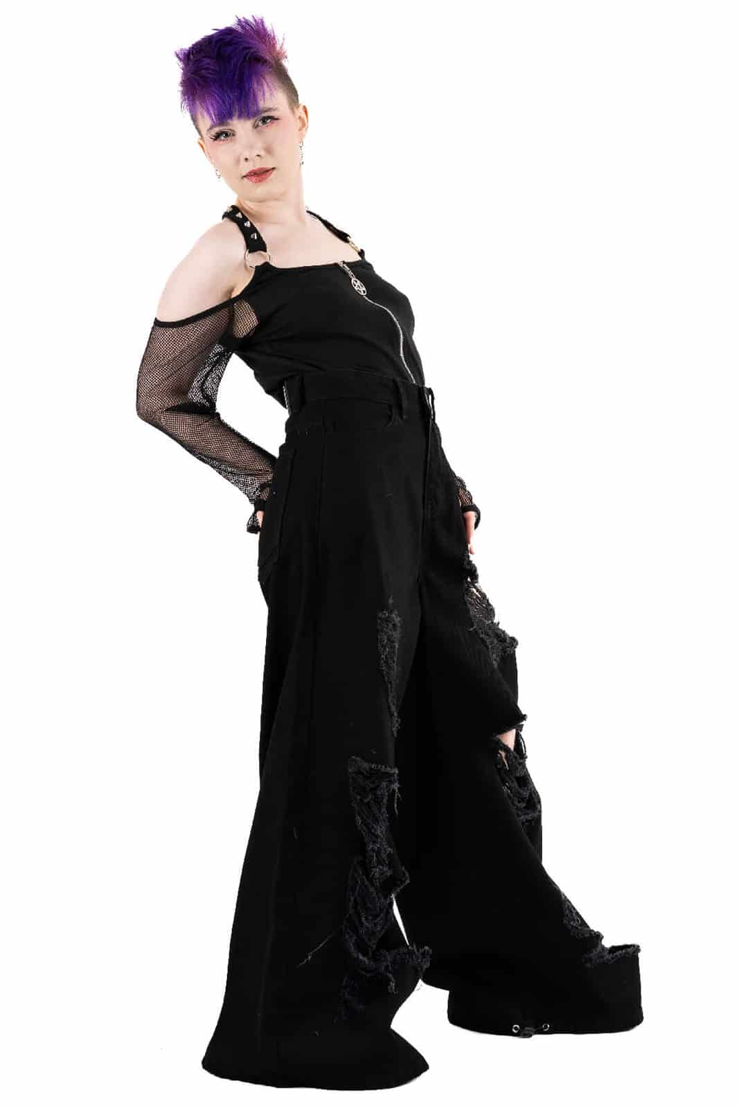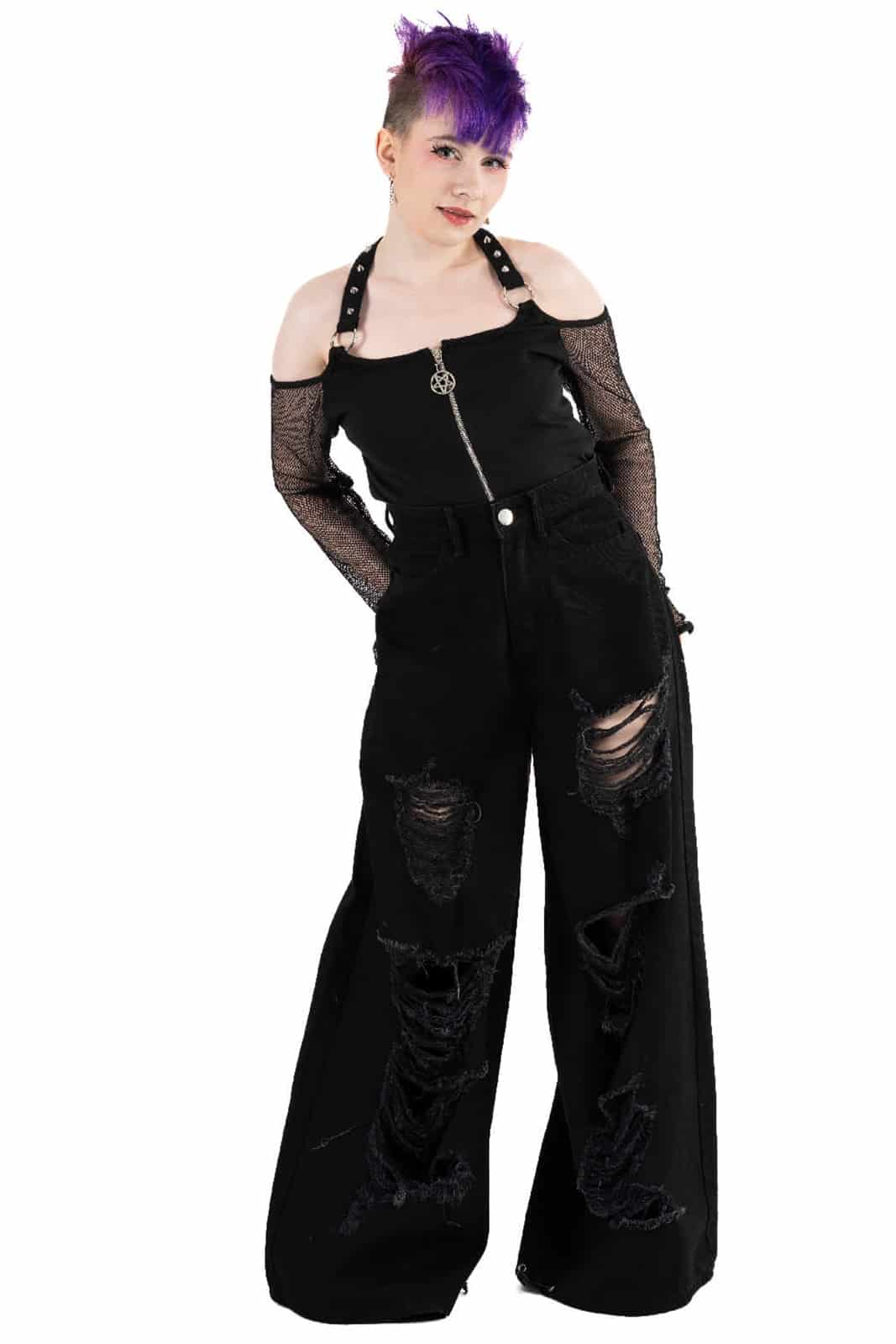 Diese Damenhose im Jeans-Schnitt von Chemical Black überzeugt mit einem markanten Gothic-Look und maximaler Lässigkeit Gefertigt aus 100% Baumwolle bietet sie angenehmen Tragekomfort und Strapazierfähigkeit Der weite Schnitt sorgt für einen dramatischen Style während die starken Destroyed-Details an den Beinen den rebellischen Charakter unterstreichen Ein absolutes Must-Have für alternative Outfits
