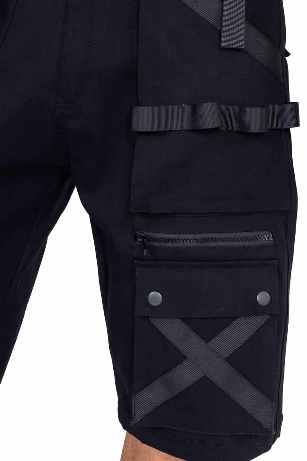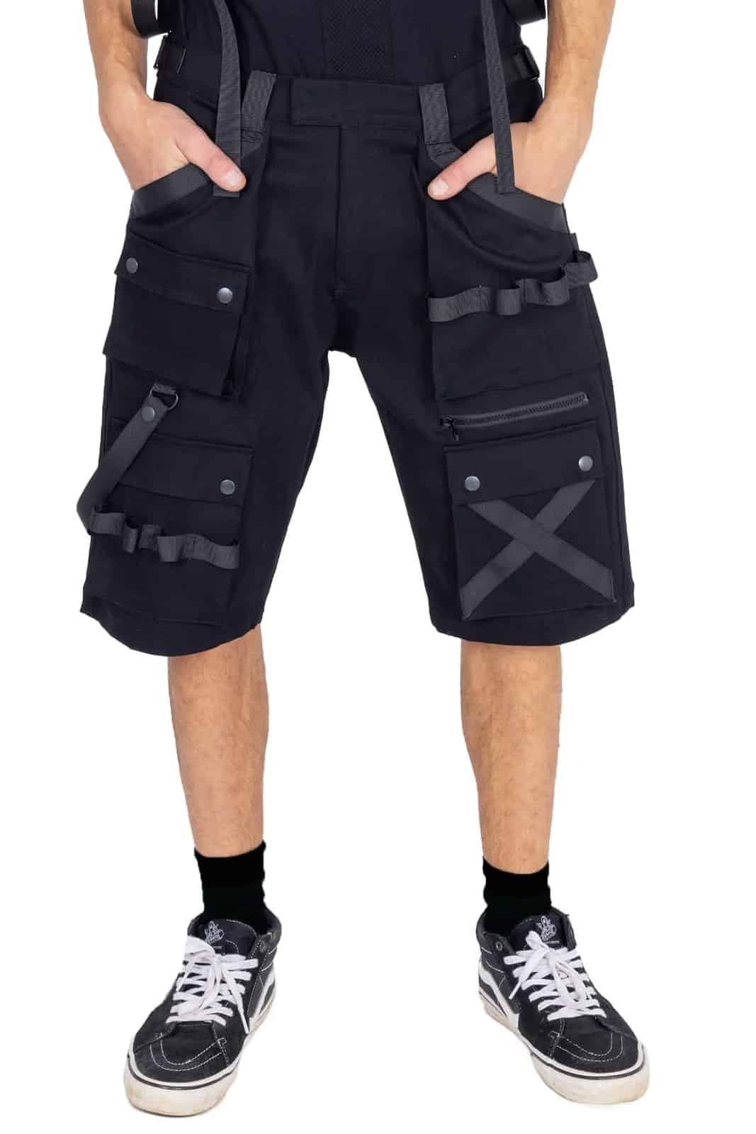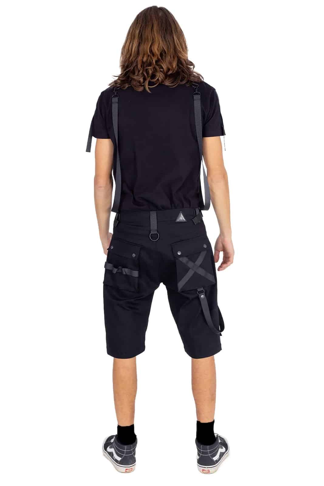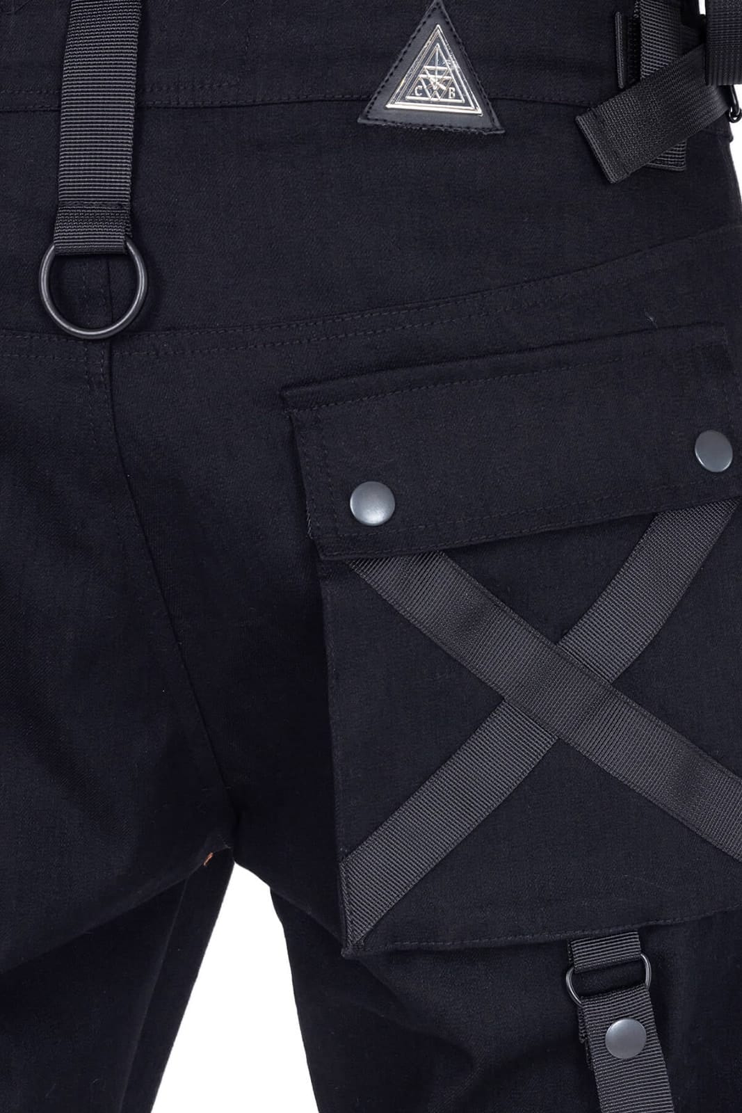 Zusätzlich sind auf den Schenkeln drei weitere Taschen aufgesetzt. Alle mit Druckknopfverschluß. Verziert mit aufgenähten Riemen in verschiedenen Formen.