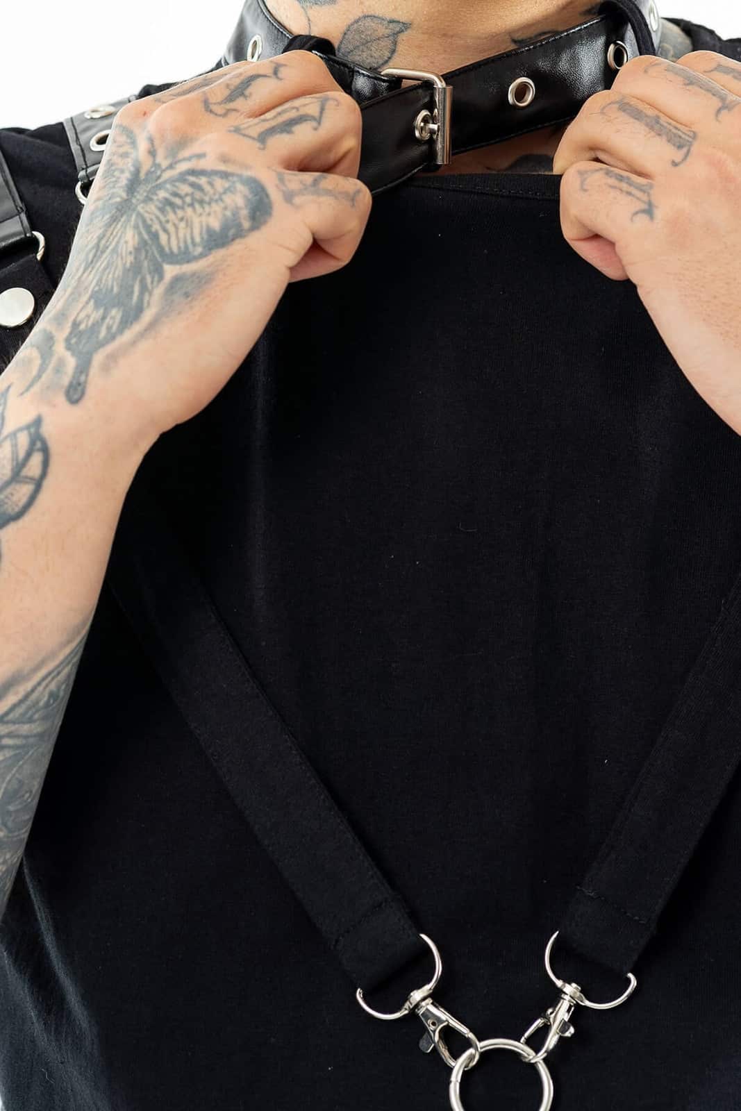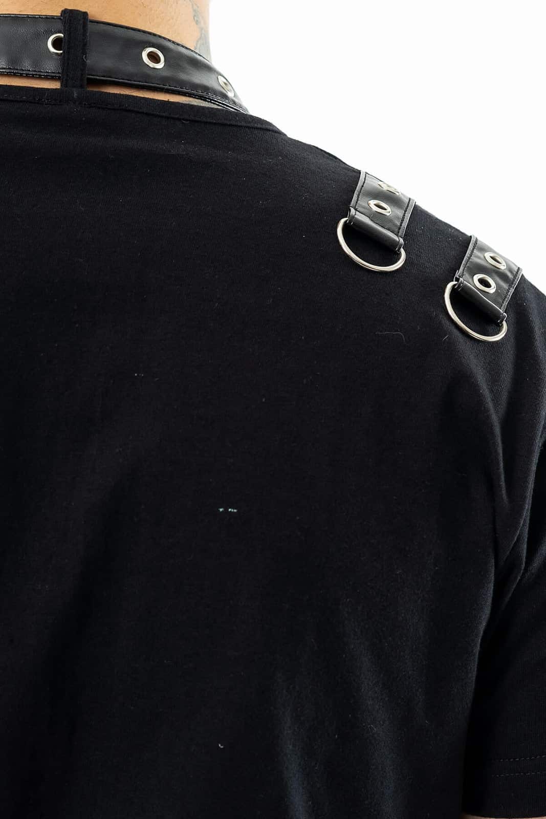 Minimalismus trifft auf Subversion: Dieses Shirt überzeugt durch seine klare Form und überraschende Details. Auffällige D-Ringe und aufgesetzte Riemen mit Metallkarabinern setzen markante Akzente auf Schultern und Brust – ideal zum Kombinieren mit Harnesses oder Layering-Pieces. Der figurbetonte Schnitt sorgt für einen cleanen Look, der trotz aller Zurückhaltung eine starke visuelle Präsenz entfaltet. Ein Must-have für alle, die Basics mit Haltung tragen wollen – unaufdringlich rebellisch, aber niemals langweilig.