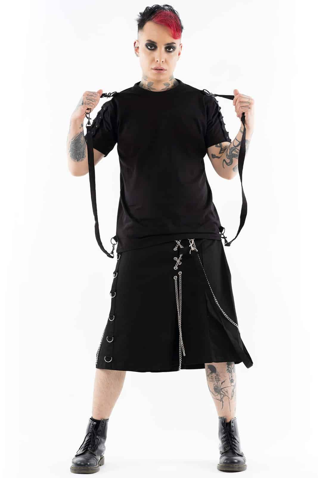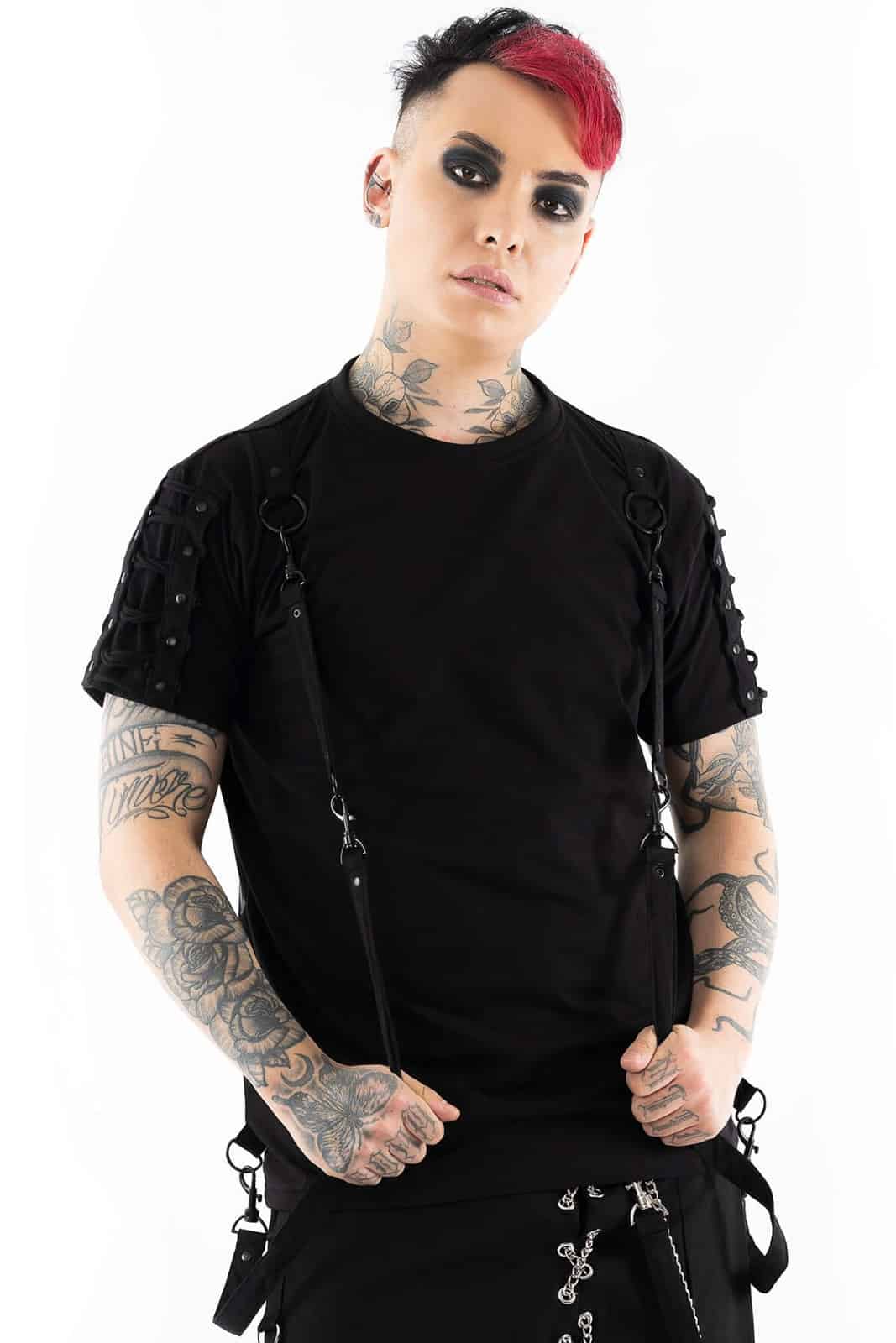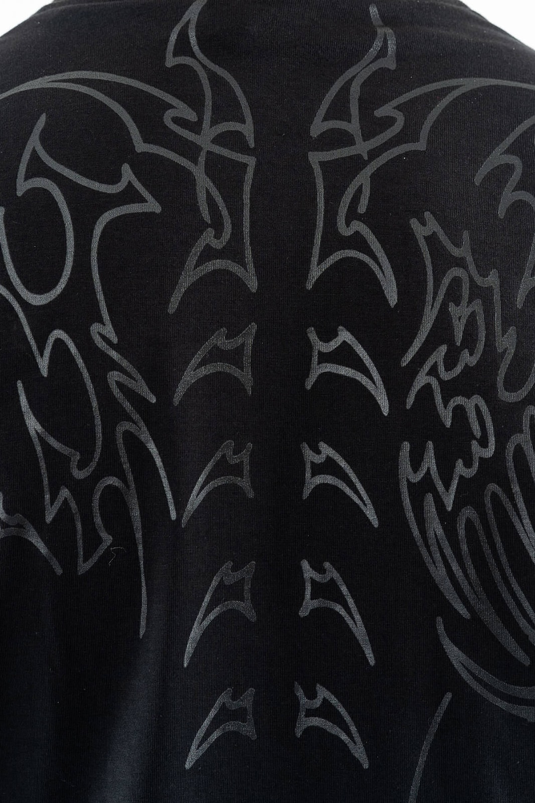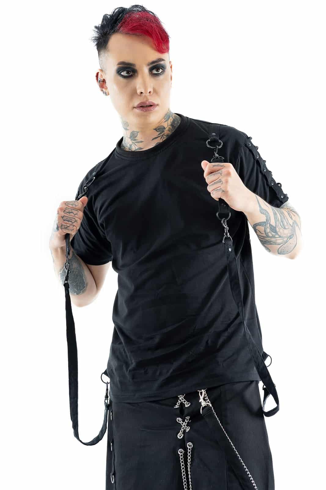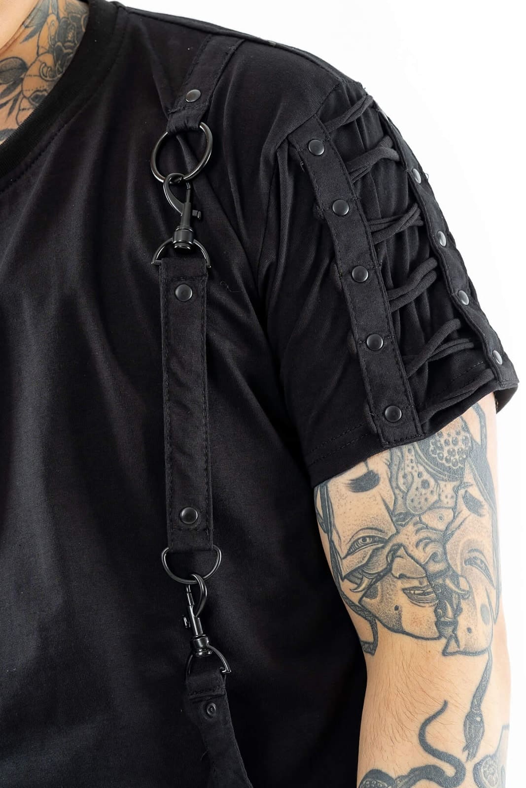 Dieses schwarze T-Shirt aus reiner Baumwolle verbindet klassischen Tragekomfort mit einem ausdrucksstarken Design. Die Rückseite ist mit einem detailreichen Tribal-Print versehen, der wie ein dunkles Totemtier die Wirbelsäule entlangläuft und dem Shirt eine markant mystische Note verleiht. An den Schultern und Ärmeln verlaufen dekorative Schnürungen, eingefasst von robusten Druckknöpfen, die eine strukturelle, beinahe militärisch wirkende Oberfläche schaffen. Zwei längenverstellbare Träger mit Karabinerhaken, befestigt an D-Ringen, ergänzen das Design um eine funktionale, individuell anpassbare Komponente. Das Shirt lässt sich sowohl solo als auch in komplexeren Layering-Looks inszenieren und eignet sich ideal für alle, die auch bei Basics nicht auf düstere Raffinesse verzichten wollen.