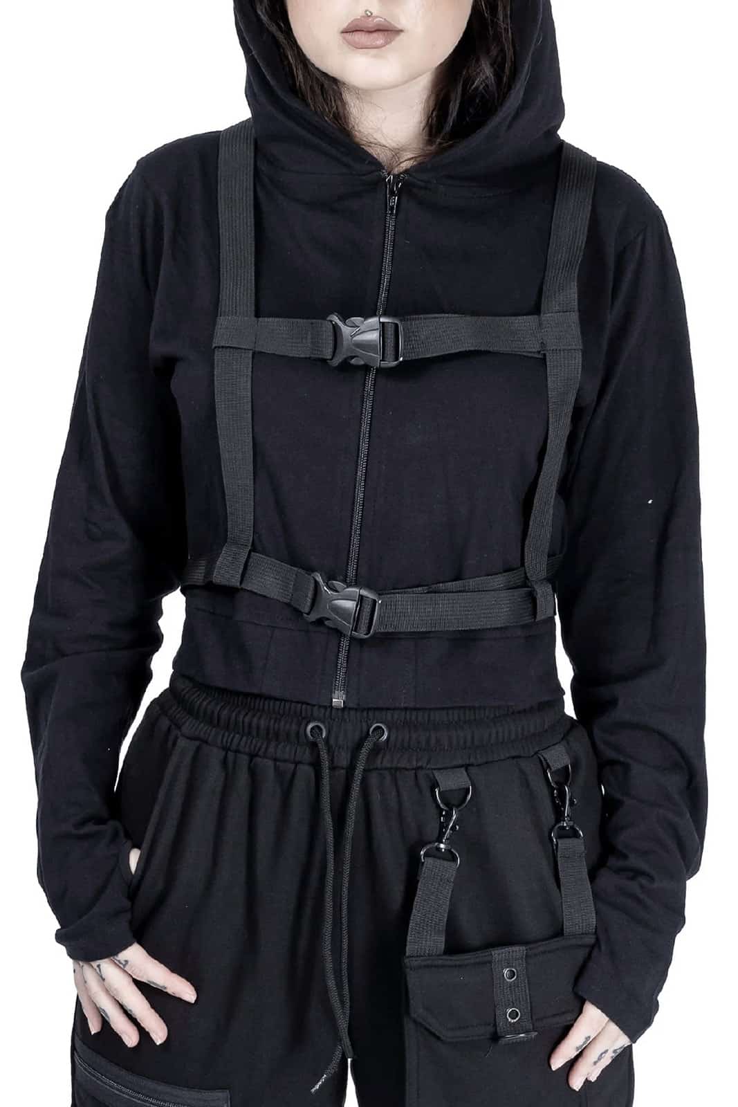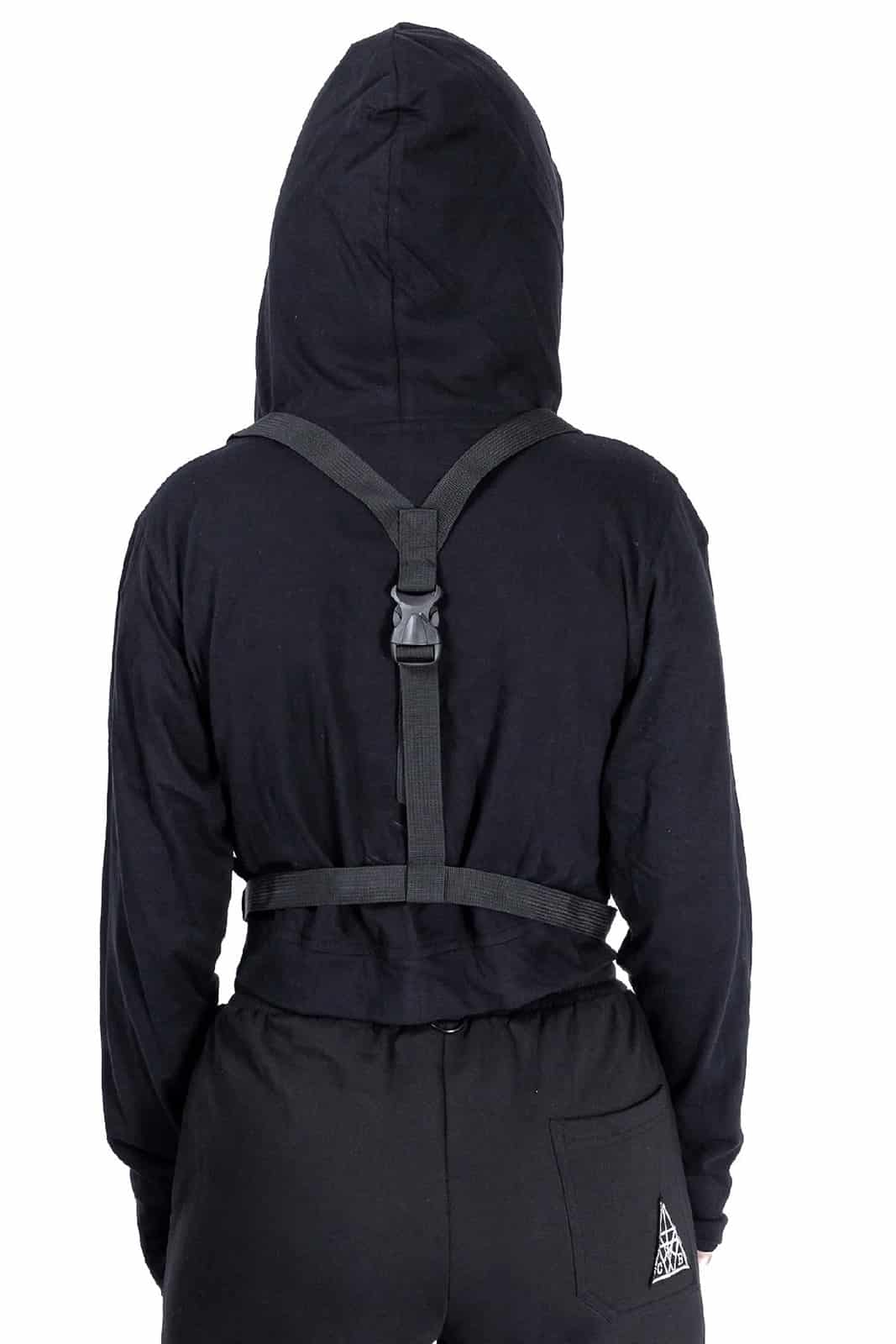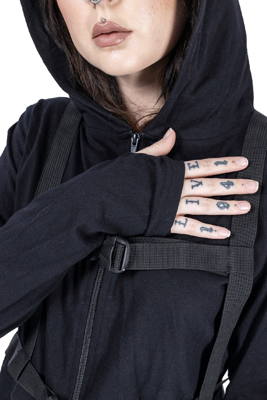 Einfach und genial. Kapuzenjacke aus reiner Baumwolle besetzt mit weichen Bändern aus Polyester. Ein durchgehender Frontreißverschluß überlagert von zwei schwarzen Klickschnallen dient einfachem An- und Ausziehen. Die langen Ärmel sind mit Daumenlöchern ausgestattet.