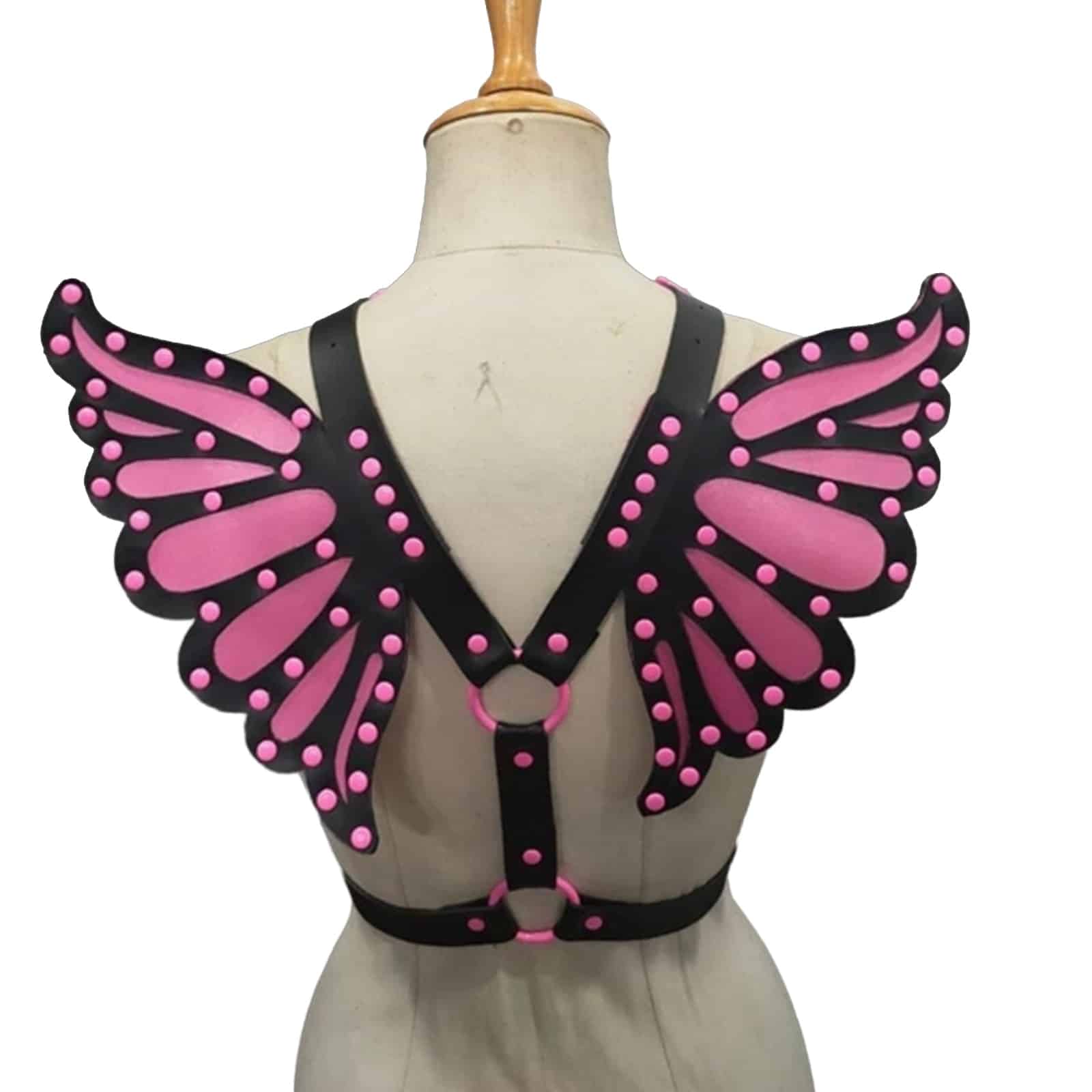 Ein auffälliger Harness aus Kunstleder, der mit seinen ausladenden Flügeln sofort ins Auge fällt. Die kontrastierenden pinken Details verleihen dem Design eine verspielte, fast magische Note und machen dieses Piece zu einem echten Statement für Festivals, Partys oder extravagante Outfits. Durch die verstellbaren Riemen passt sich der Harness flexibel an und sitzt sicher am Körper.
