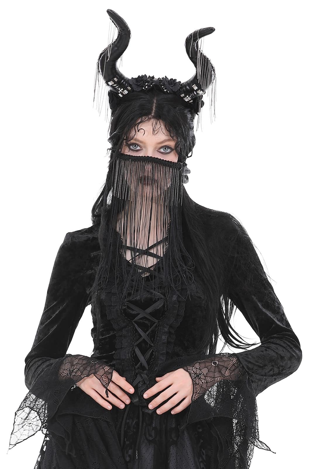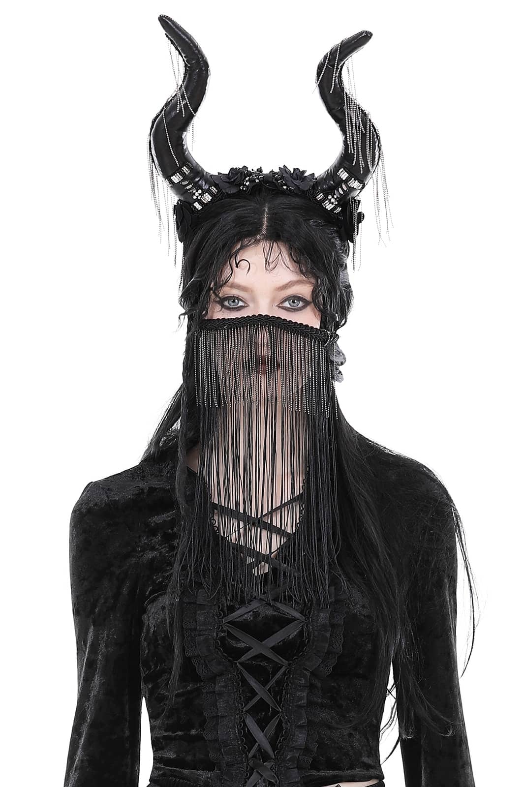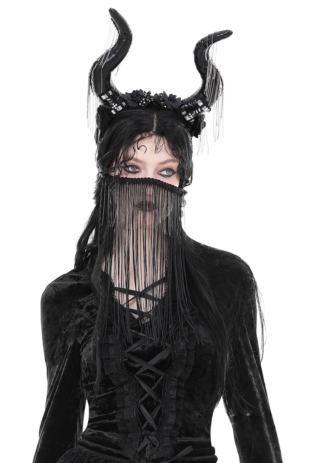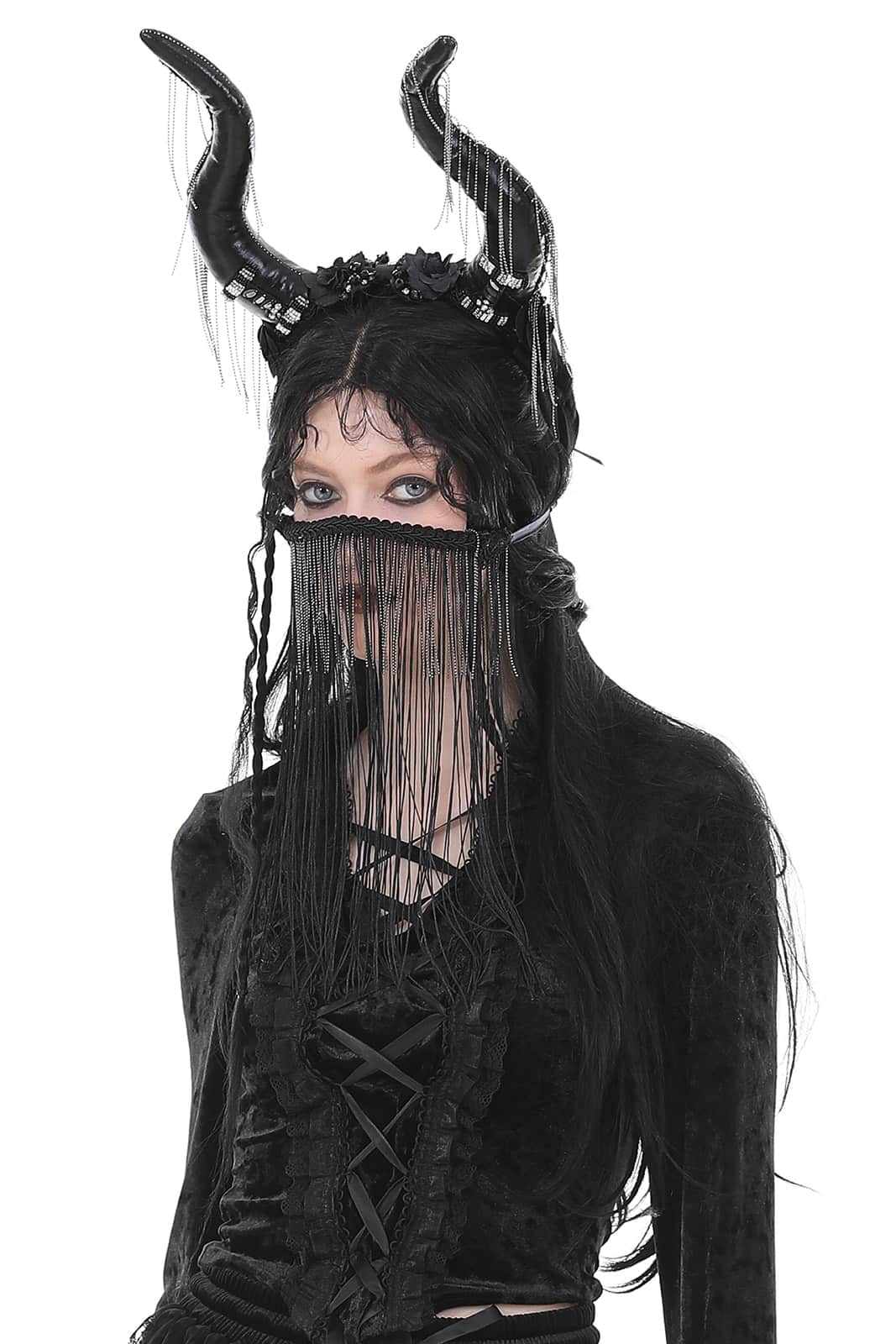 Der Haarreif ist mit einem Paar Stoffhörner besetzt und mit Stoffblumenschleifen sowie Perlendetails und hängende Perlenketten verziert. Die Gesichtsbedeckung besteht aus Schnur- und Perlenkettenfransen. Zierbesatz und Bandverschluß.