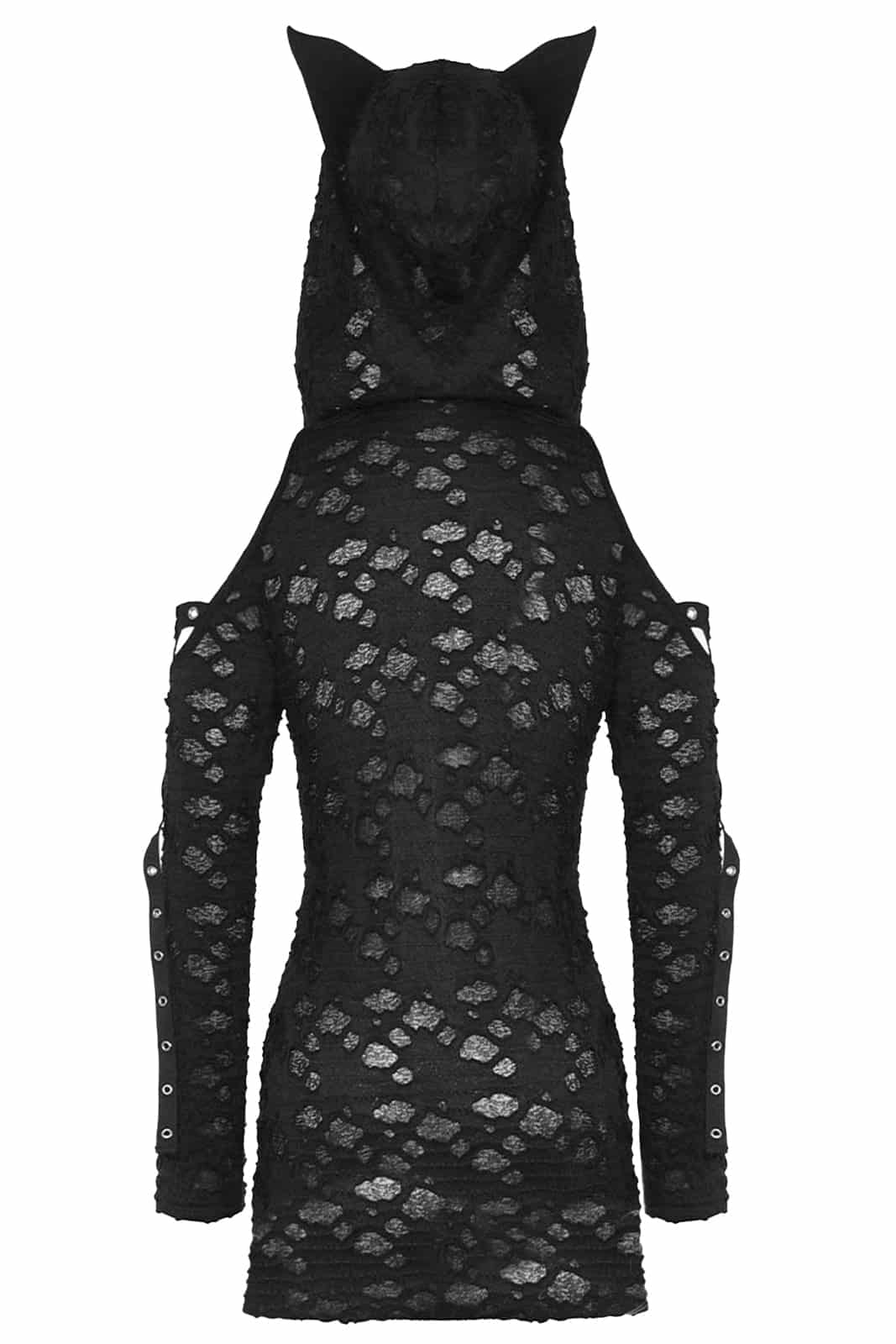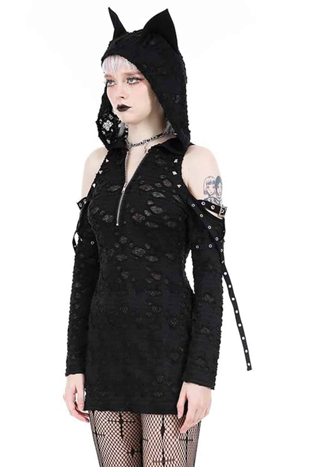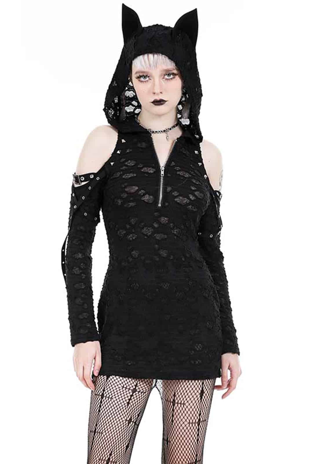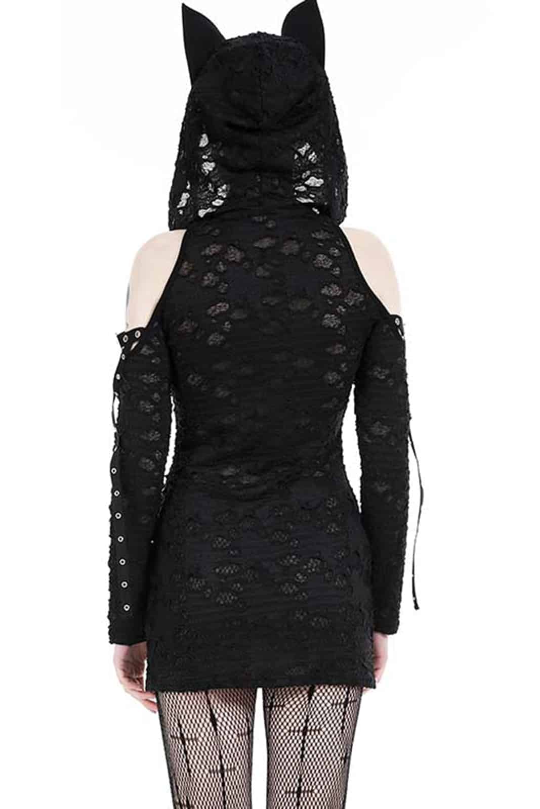 Dunkles Punk-Minikleid im Distressed-Look in Schwarz mit langen, schulterfreien Ärmeln und einer Kapuze mit Katzenohren.
