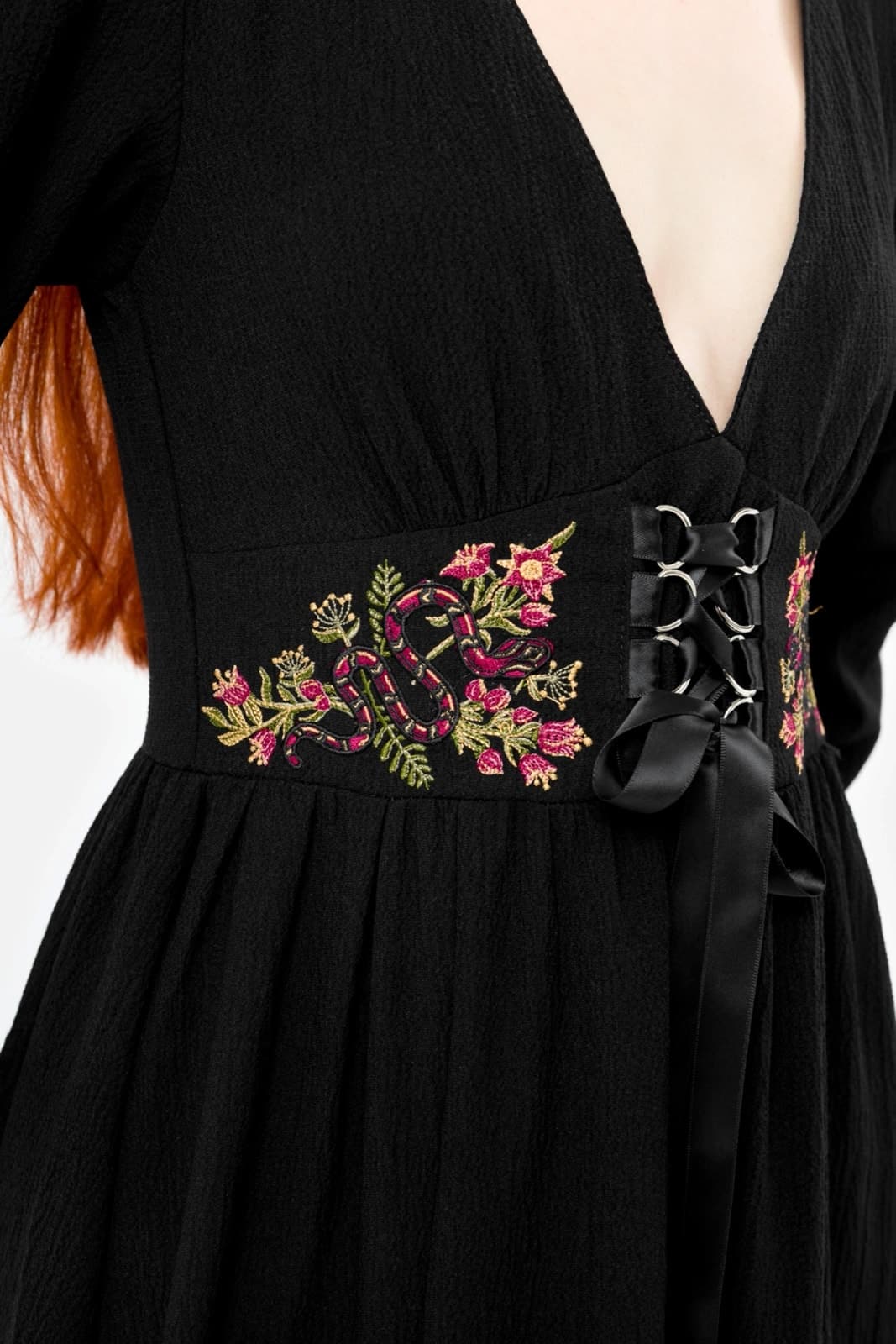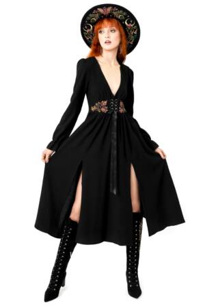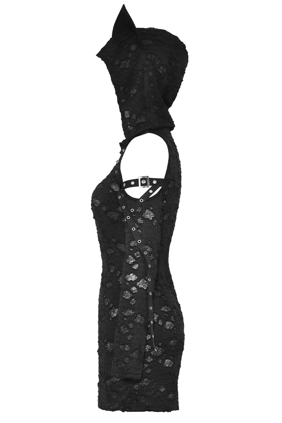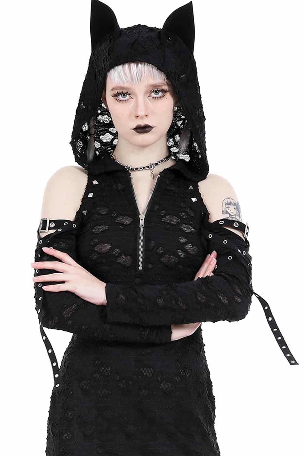 Dunkles Punk-Minikleid im Distressed-Look in Schwarz mit langen, schulterfreien Ärmeln und einer Kapuze mit Katzenohren.