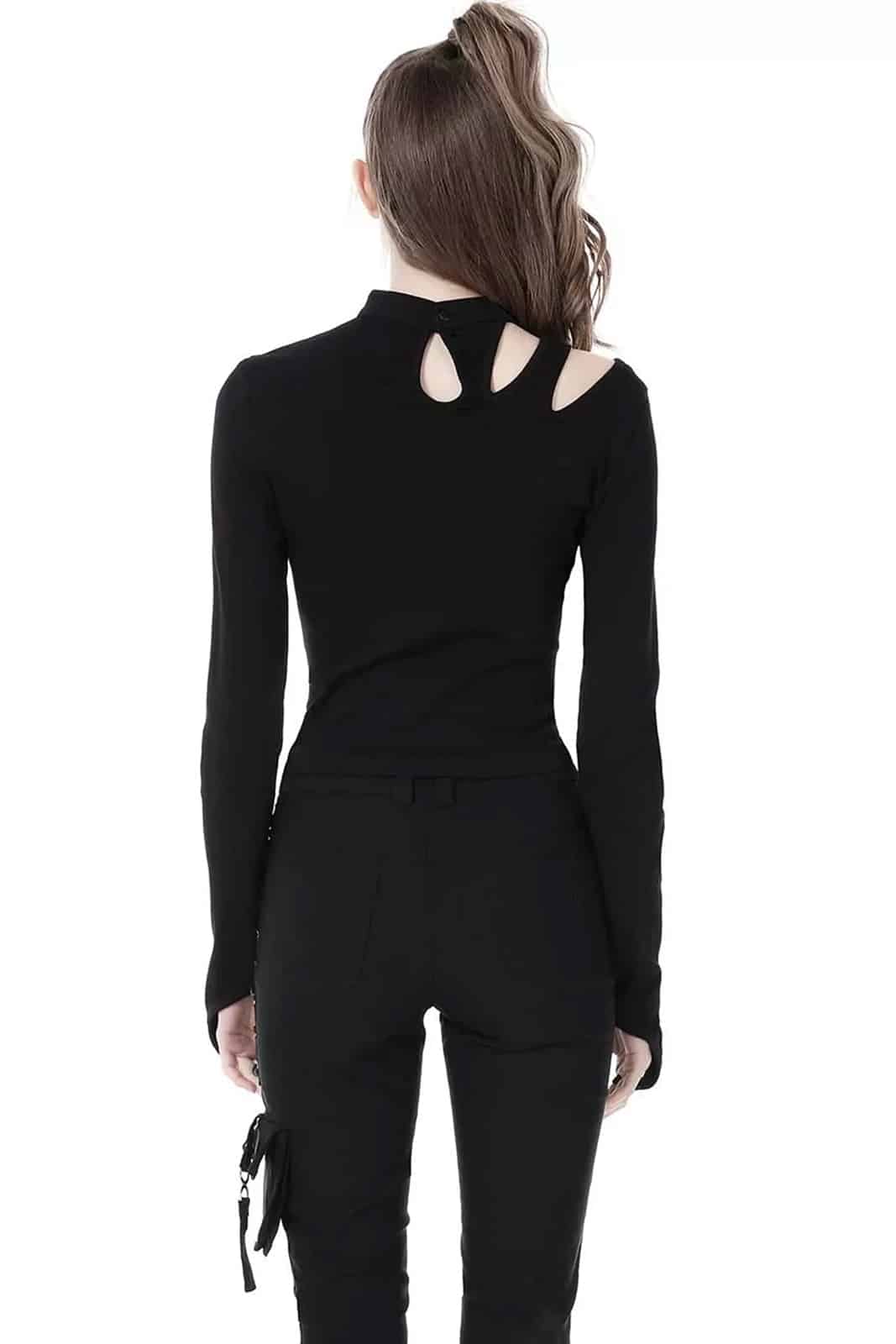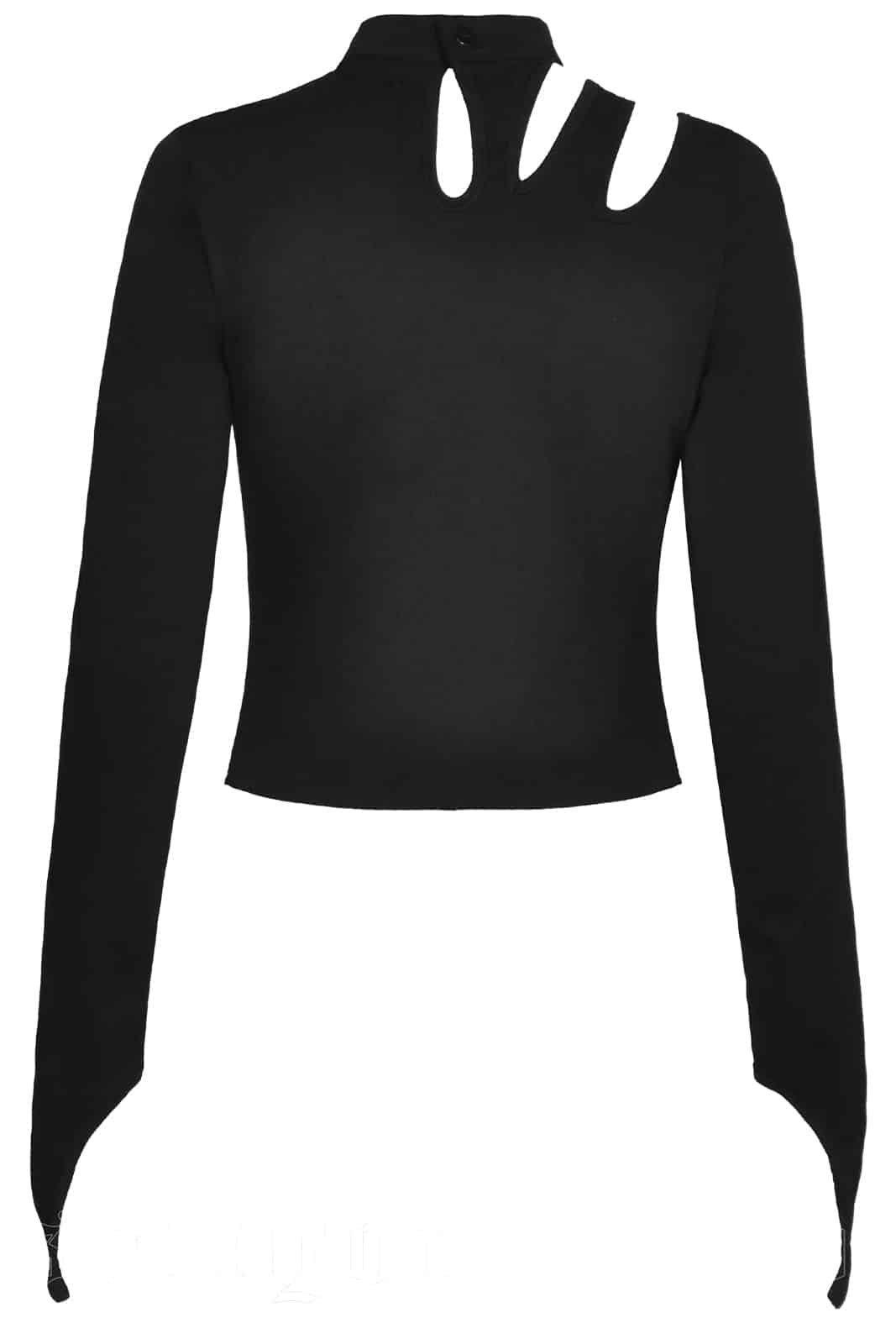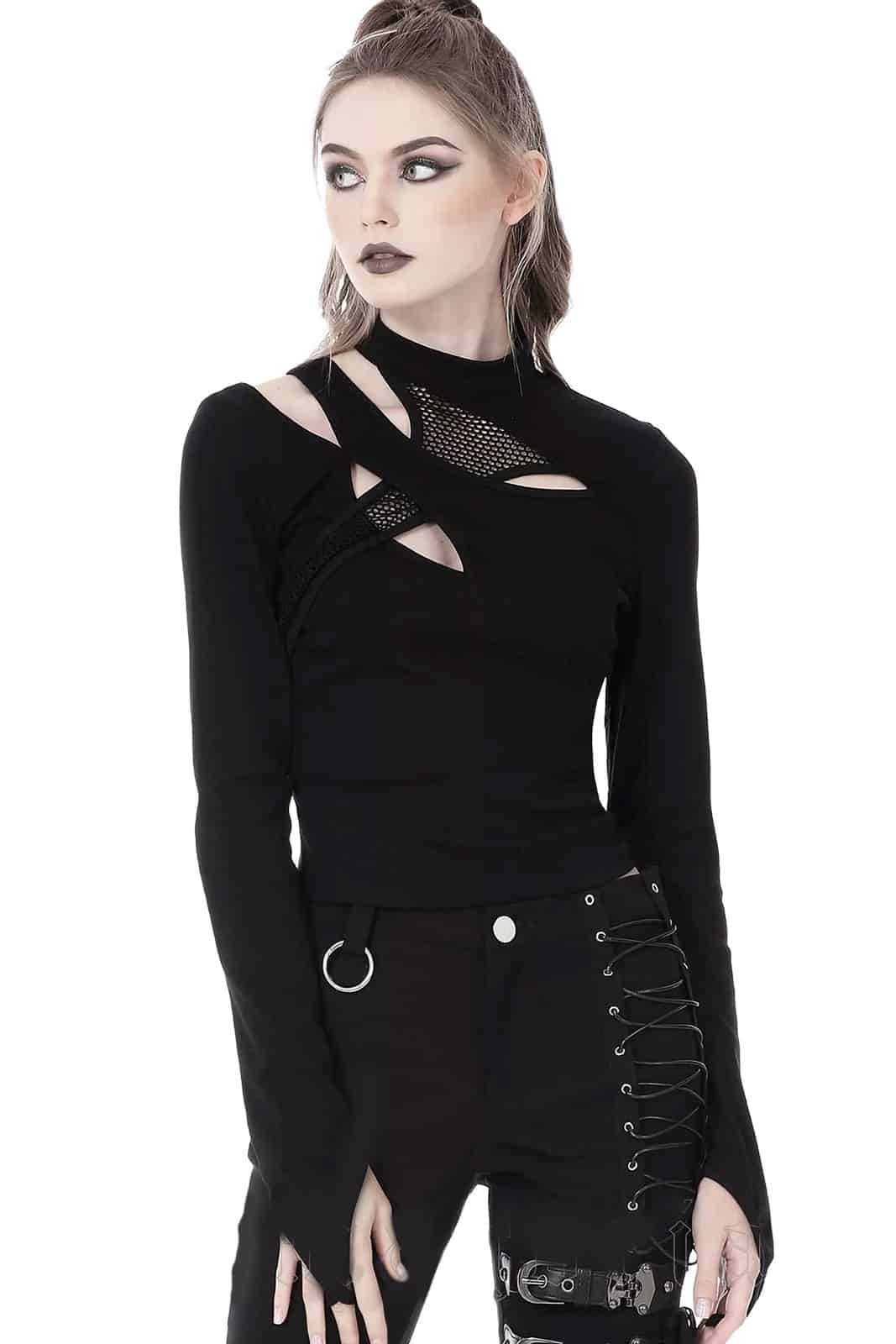 Dieses Top vereint moderne Schlichtheit mit markanter Gothic-Ästhetik und ist damit ein vielseitiges Essential für jeden düsteren Kleiderschrank. Gefertigt aus weichem elastischem Jersey schmiegt es sich figurbetont an und sorgt für hohen Tragekomfort. Der hohe Halsausschnitt verleiht dem Design eine elegante Note während die asymmetrischen Cut-Outs mit Mesh-Einsatz für einen provokativen Blickfang sorgen. Lange spitz zulaufende Ärmel mit Fingerloops runden den Look ab und setzen ein klares Statement. Perfekt kombinierbar mit Hosen Röcken oder als Highlight unter einer Jacke ist dieses Oberteil ein Must-Have für urbane Gothic Styles.