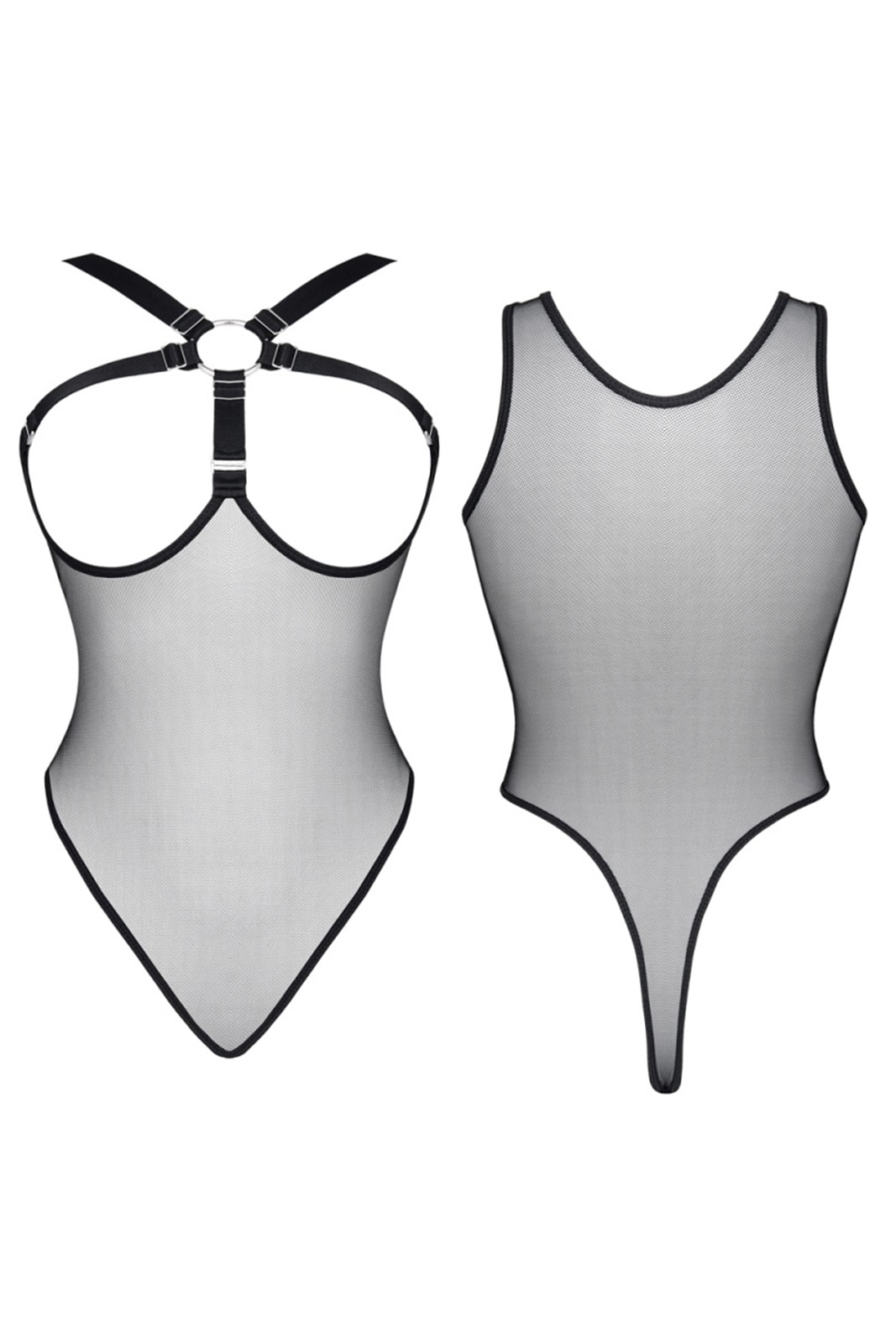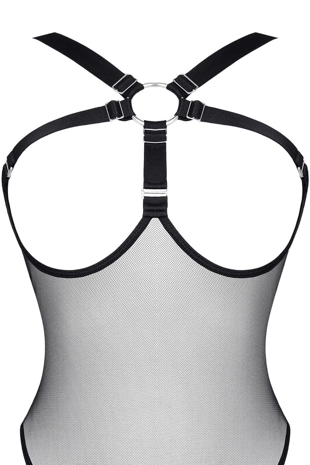 Body aus weichem, flexiblem, transparentem Netz. Auf der Vorderseite eine auffällige Komposition aus schwarzen Gummibändern kombiniert mit einer silbernen Metallniete und dekorativen Verstellern. Gummibänder haben eine angenehme Haptik und einen metallischen Glanz.