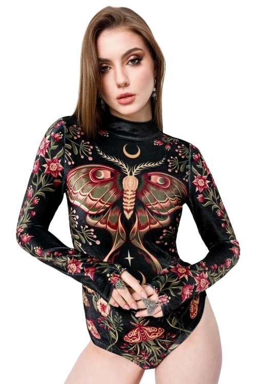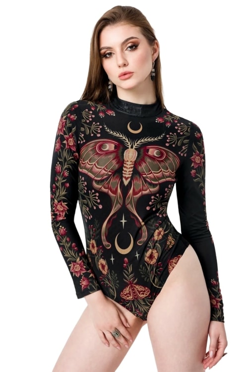 Body aus weichem, elastischem Mesh. Unterhalb der Brüste mit einem horizontalen, breiten schwarzen Gummiband mit Ziernähten verstärkt. Vertikale Nähte unter der Brust machen die Figur optisch schlanker.