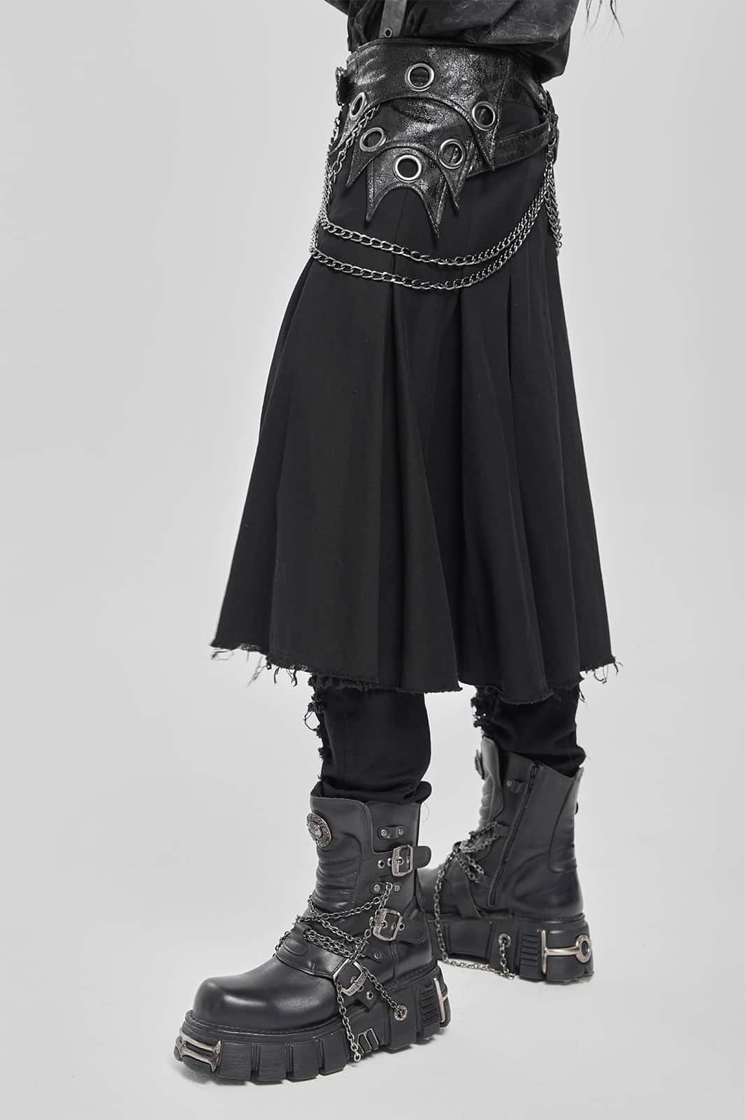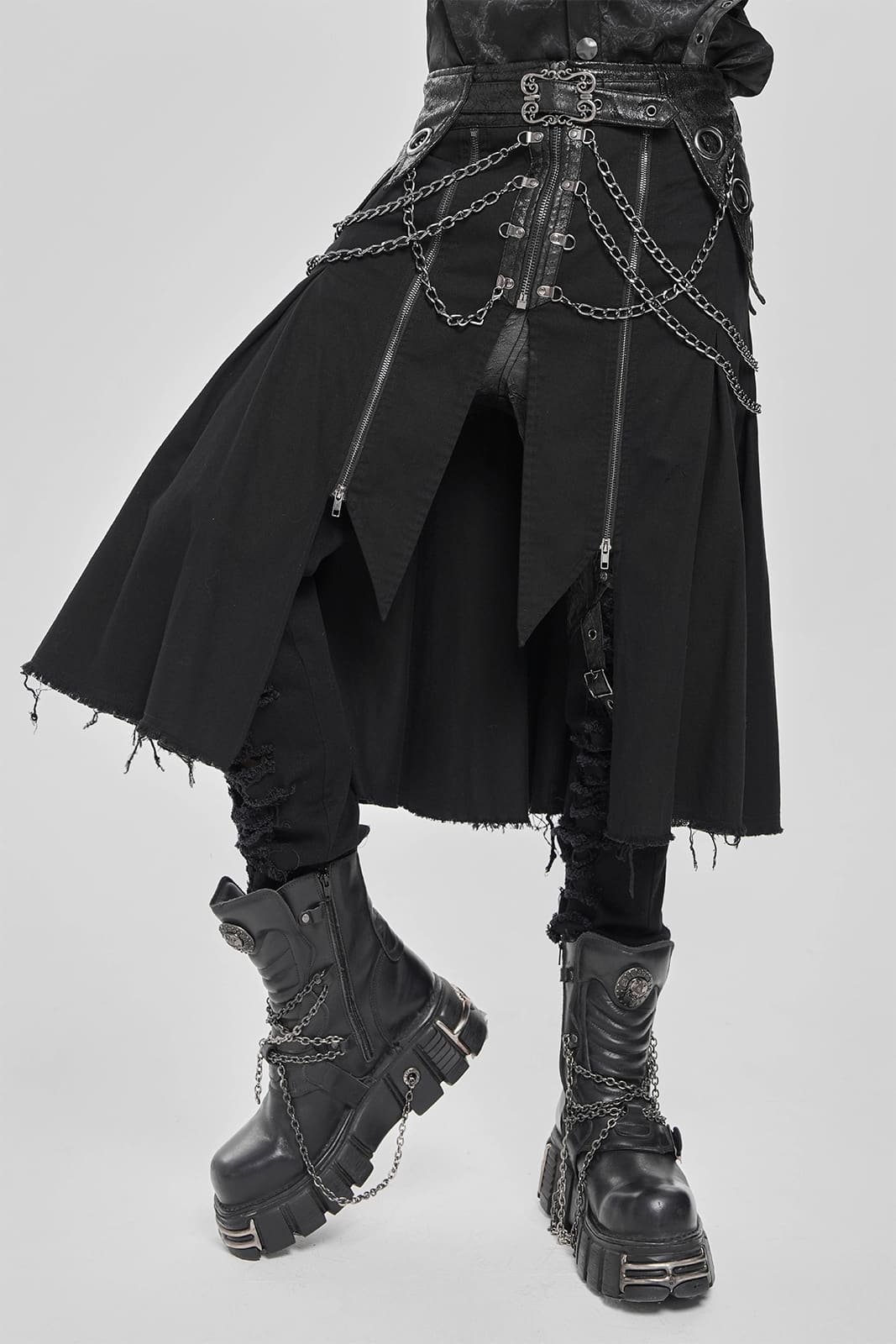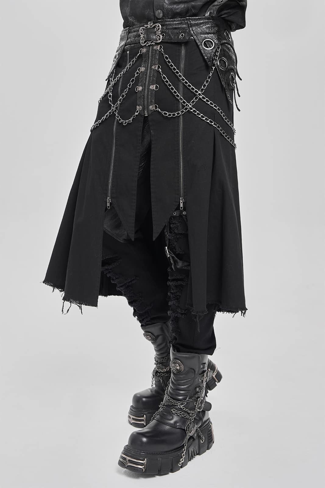Düster, kompromisslos und voller Attitude – dieser knielange Herrenrock kombiniert weite Falten mit markantem Harness-Design. Ketten, Ösen und offene Kanten verleihen dem Look eine rohe Industrial-Ästhetik – perfekt für Gothic, Post-Apocalyptic und Dark Street Styles.