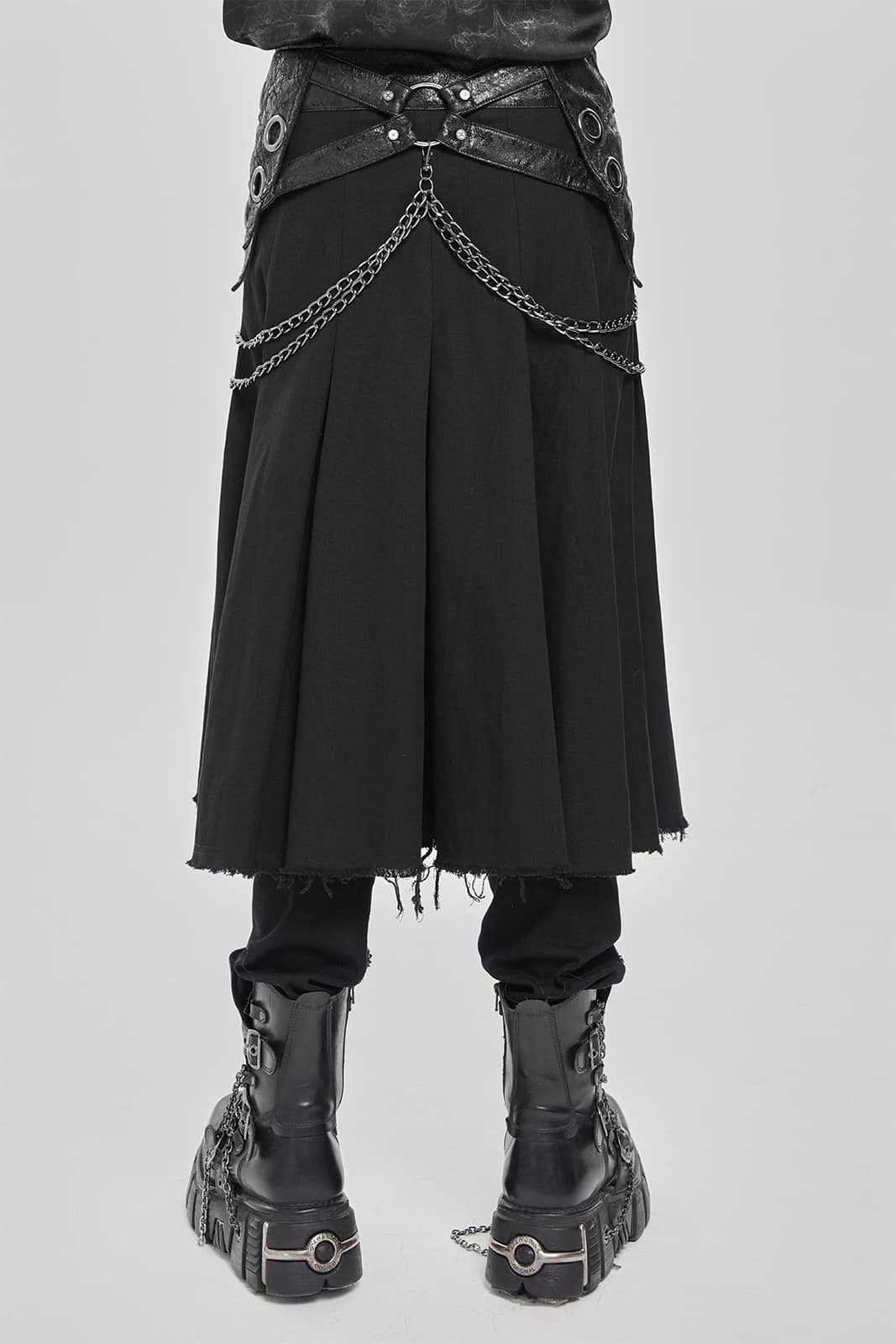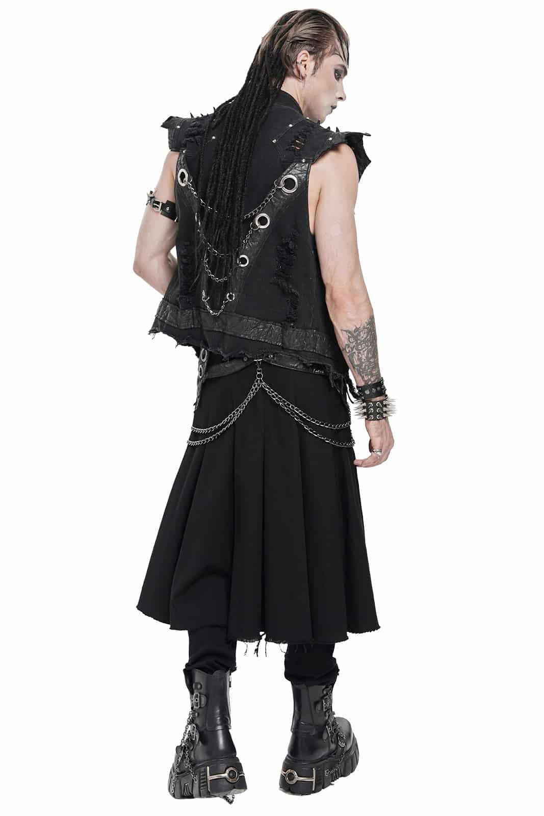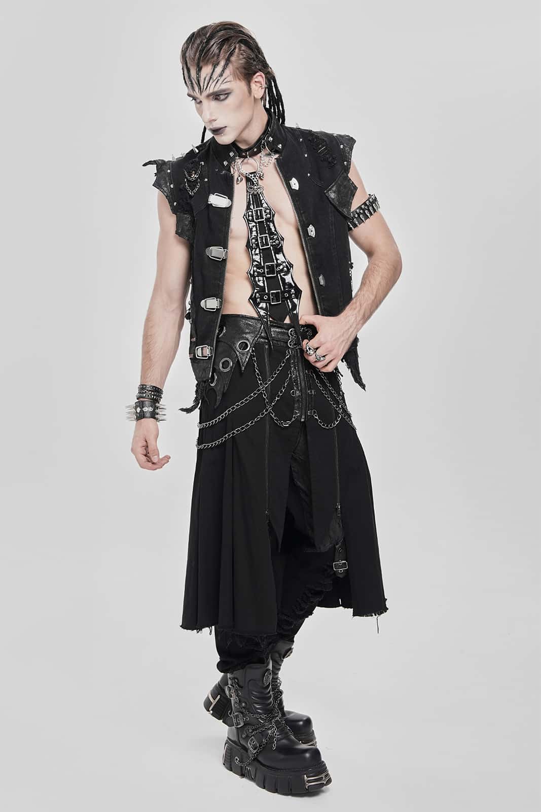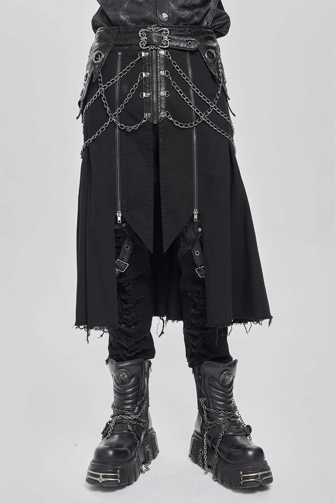 Düster, kompromisslos und voller Attitude – dieser knielange Herrenrock kombiniert weite Falten mit markantem Harness-Design. Ketten, Ösen und offene Kanten verleihen dem Look eine rohe Industrial-Ästhetik – perfekt für Gothic, Post-Apocalyptic und Dark Street Styles.