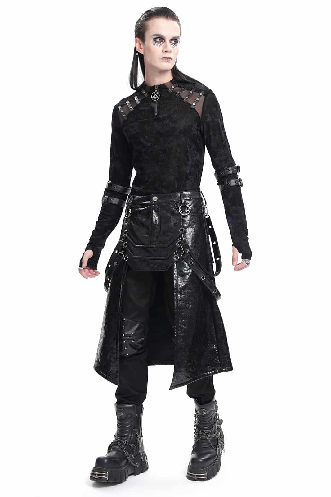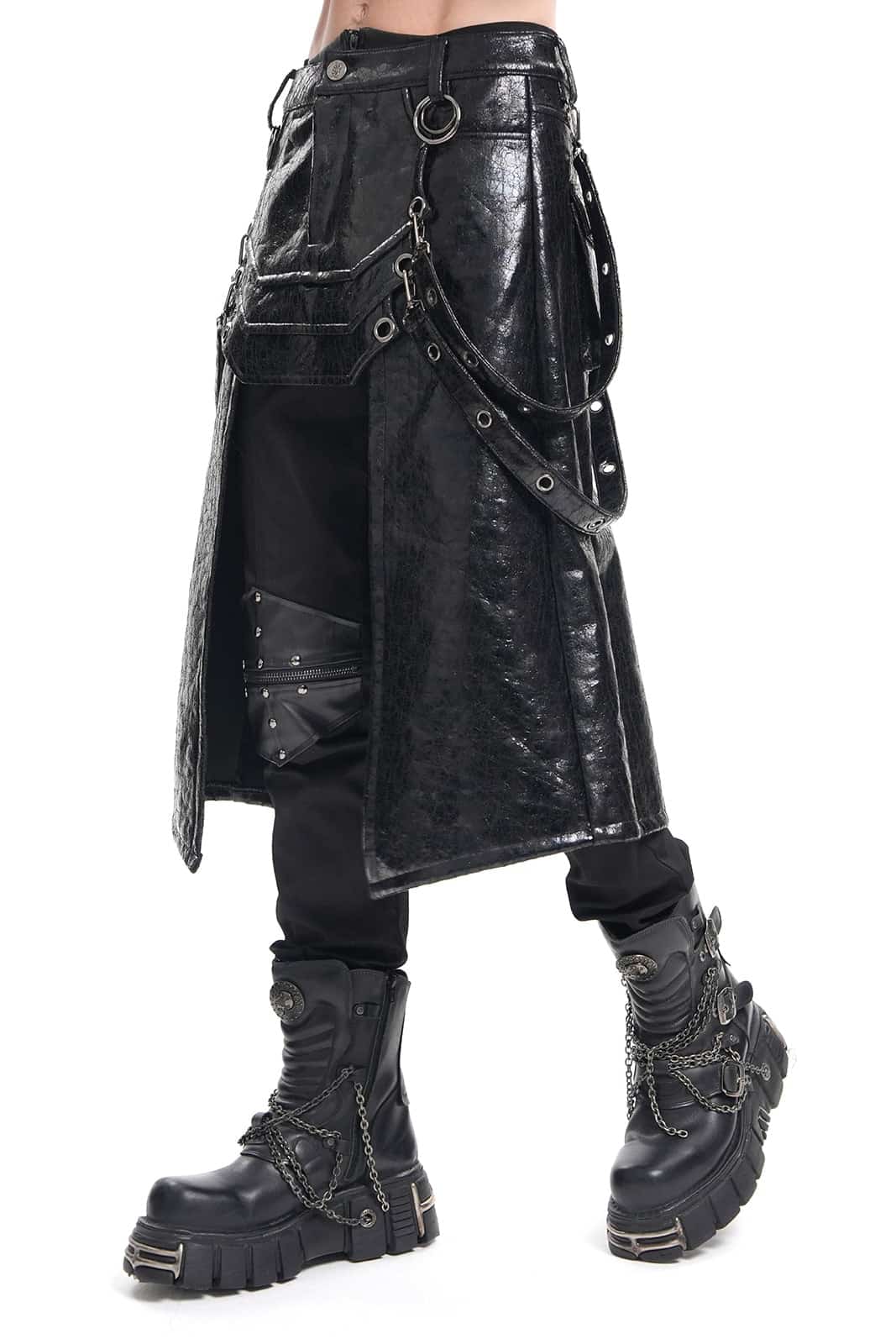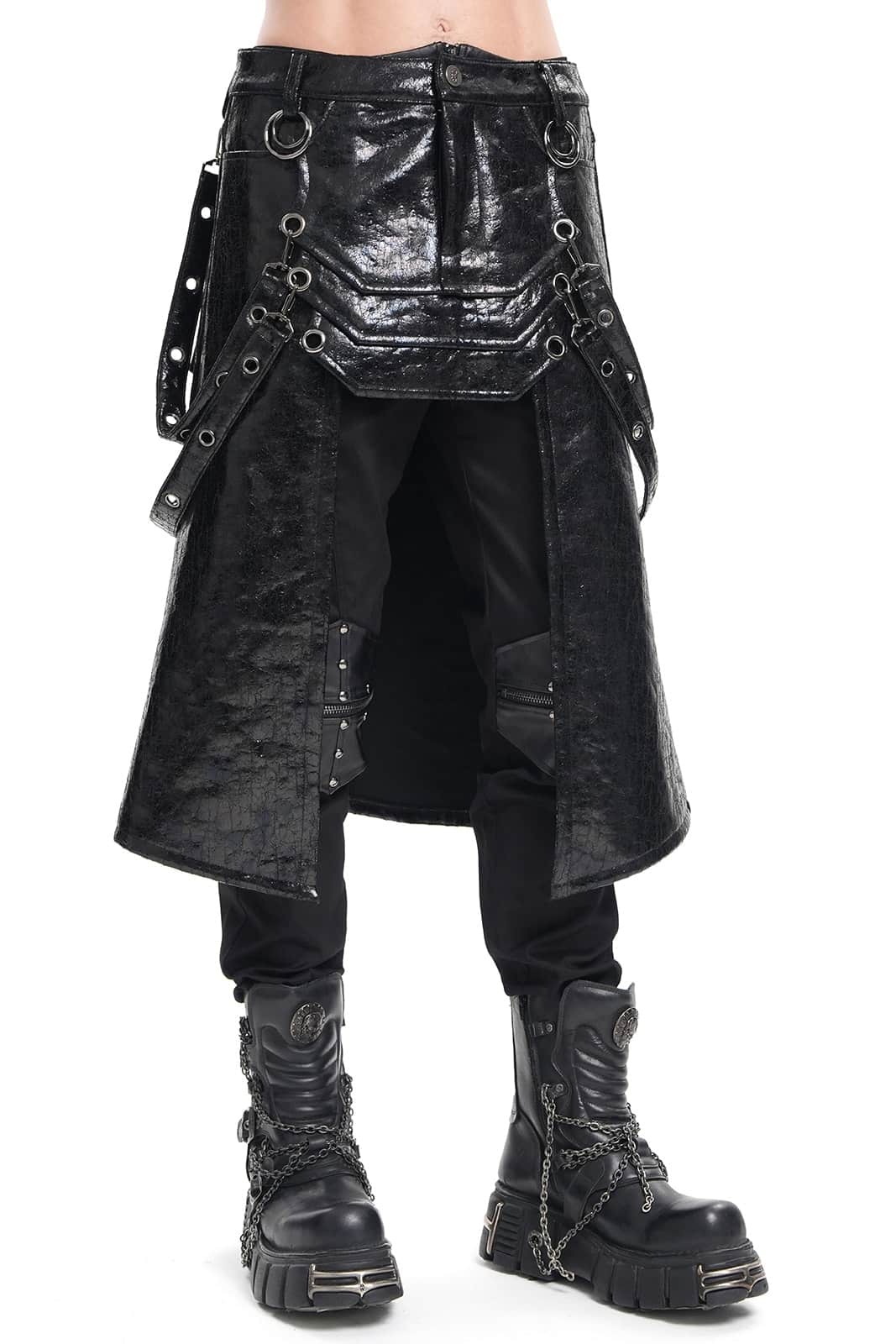 Knielanger Gothic-Herrenrock in schwarzem Rissleder-Finish mit Paneel- und Riemendetails. Mit Knopf und Reißverschluß sowie Gürtelschlaufen. Vorn mit offener Front ab Mitte der Schenkel.