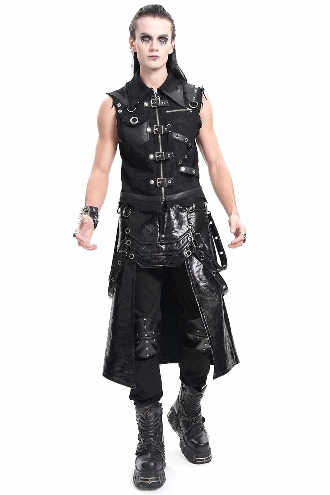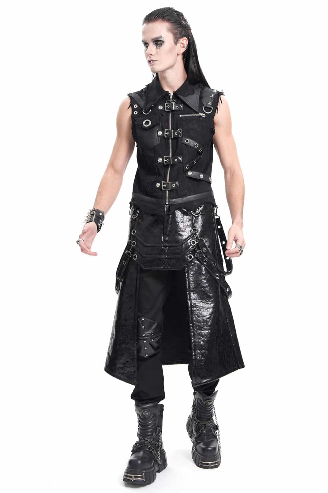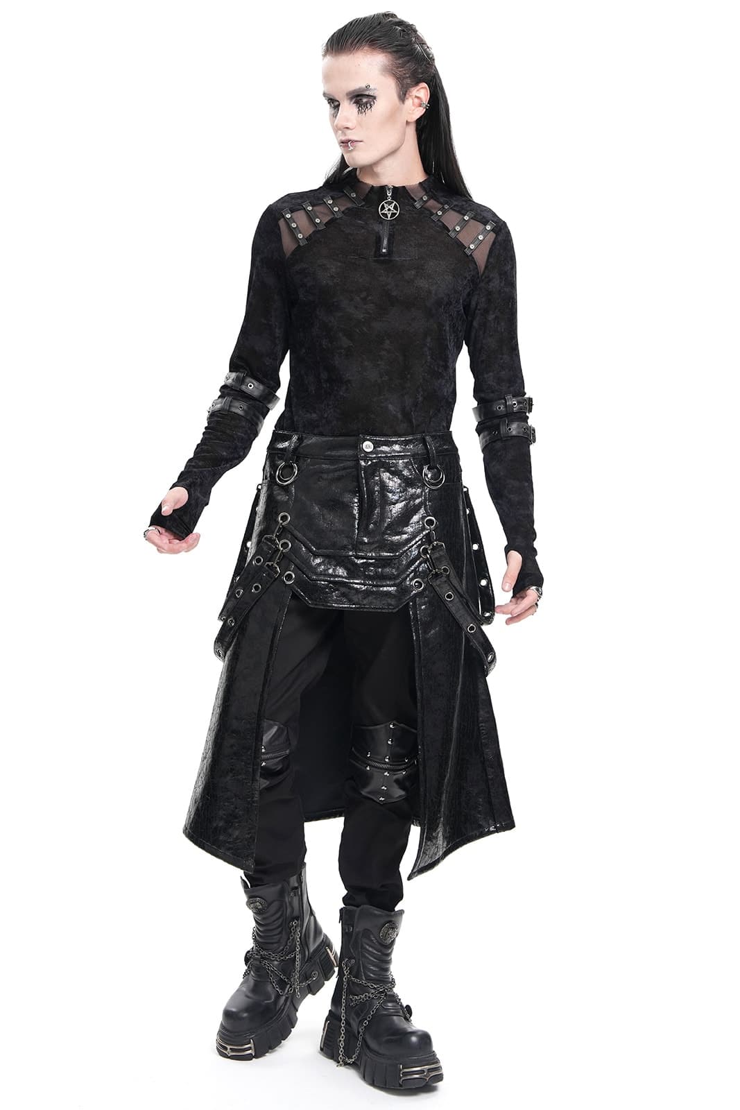 Knielanger Gothic-Herrenrock in schwarzem Rissleder-Finish mit Paneel- und Riemendetails. Mit Knopf und Reißverschluß sowie Gürtelschlaufen. Vorn mit offener Front ab Mitte der Schenkel.