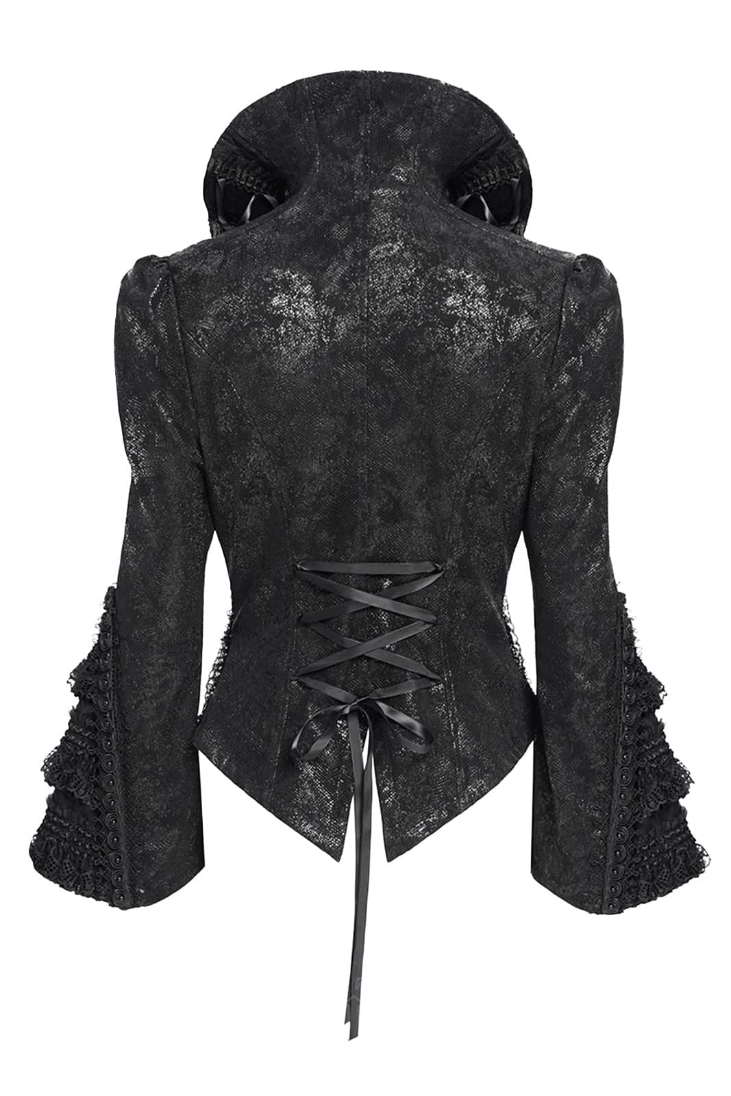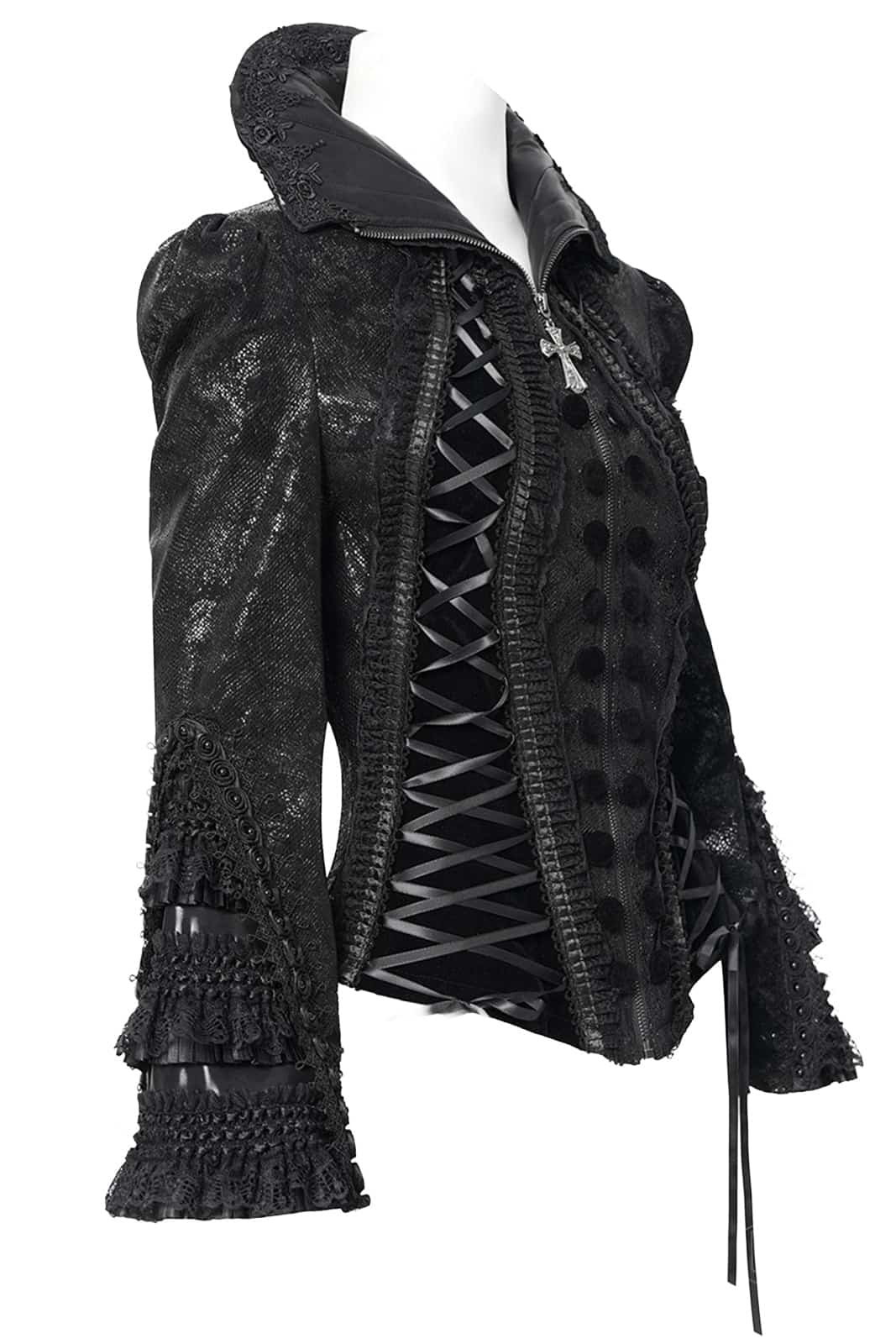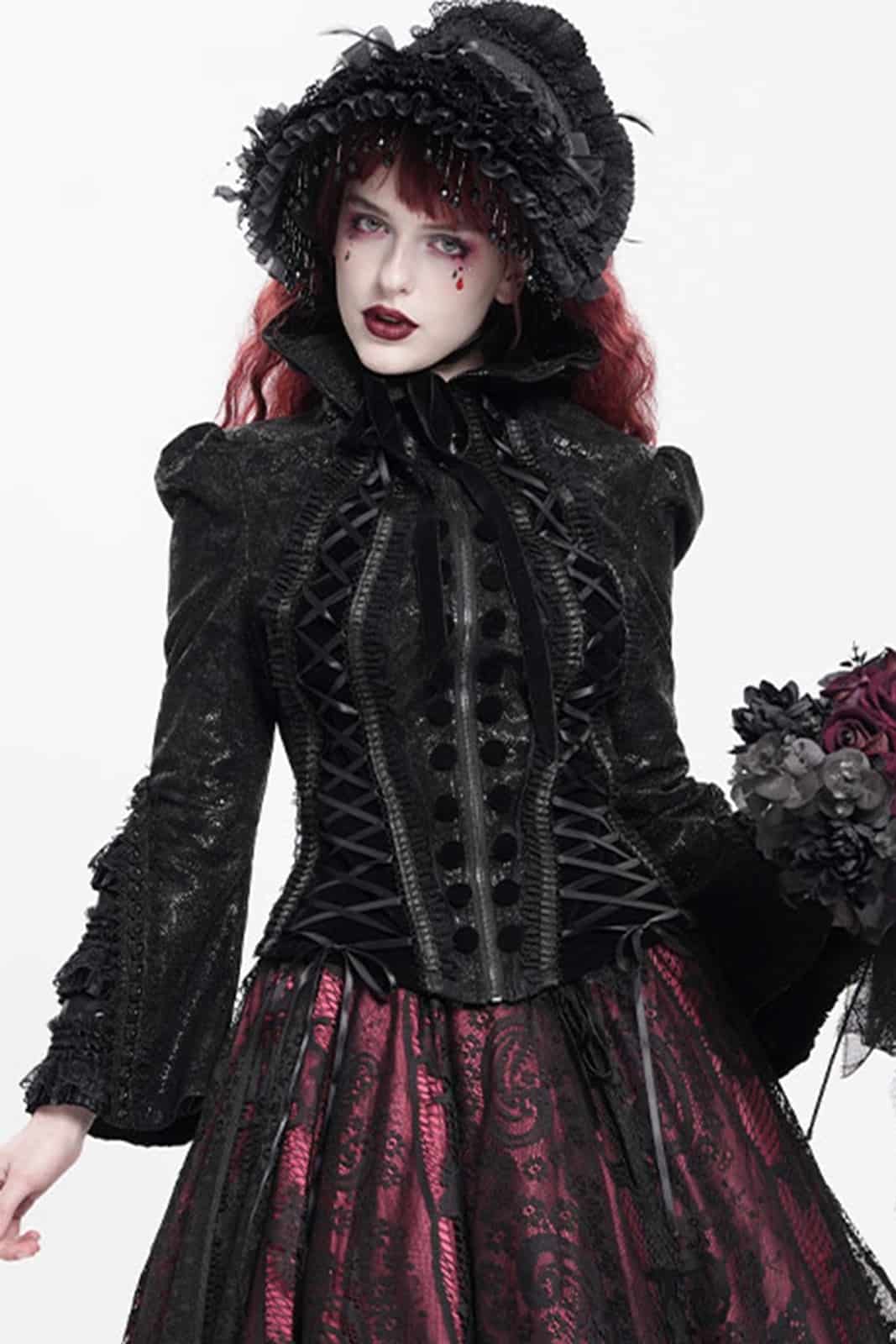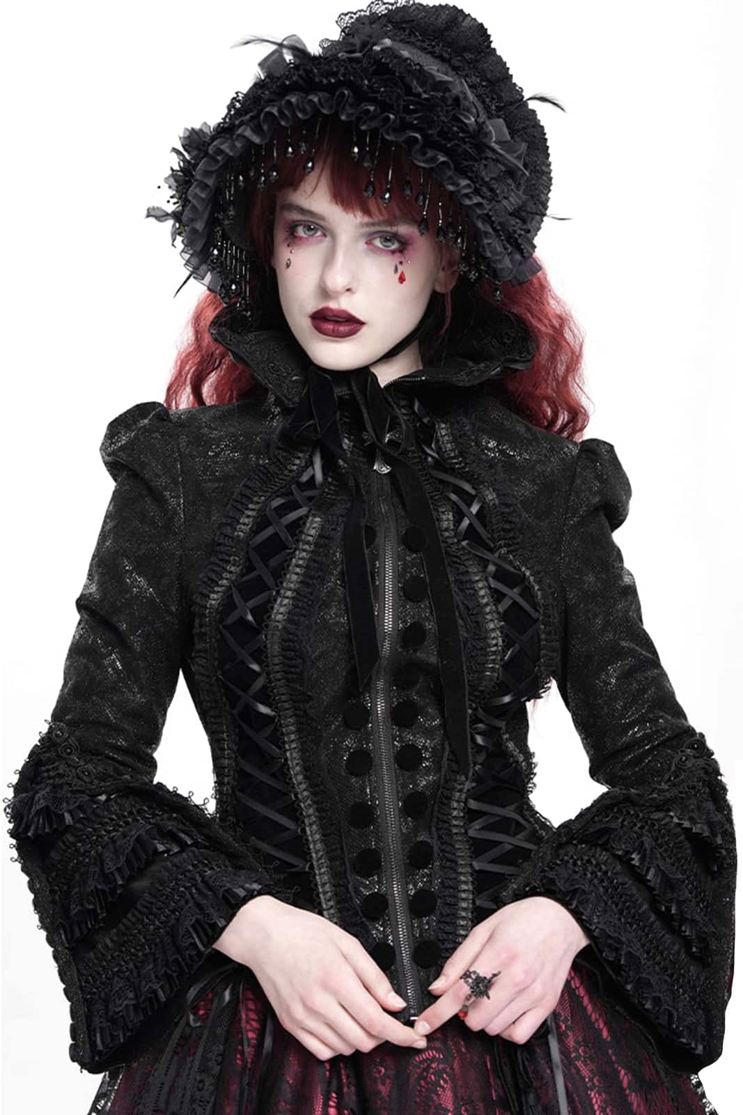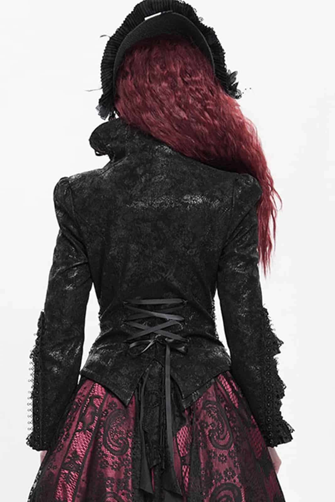 Dolly Darling ist eine romantisch-gothische Kurzjacke mit opulentem Design und starkem Vintage-Charakter. Das strukturierte Material in schwarzer Schlangenleder-Optik verleiht der Jacke eine luxuriöse Tiefe, während aufwendige Schnürungen, Zierknöpfe und ausgestellte Ärmel den Look dramatisch und feminin wirken lassen. Ideal für Gothic-, Victorian- und Romantic-Gothic-Outfits, ob als Statement-Piece oder elegant kombiniert.