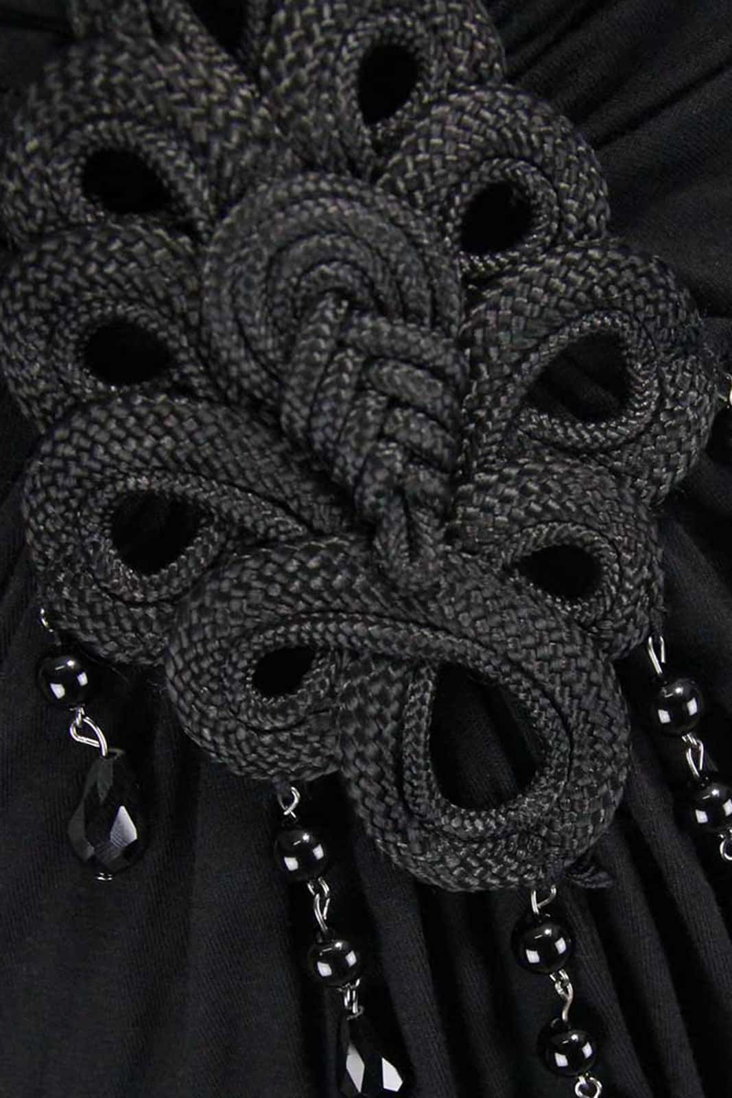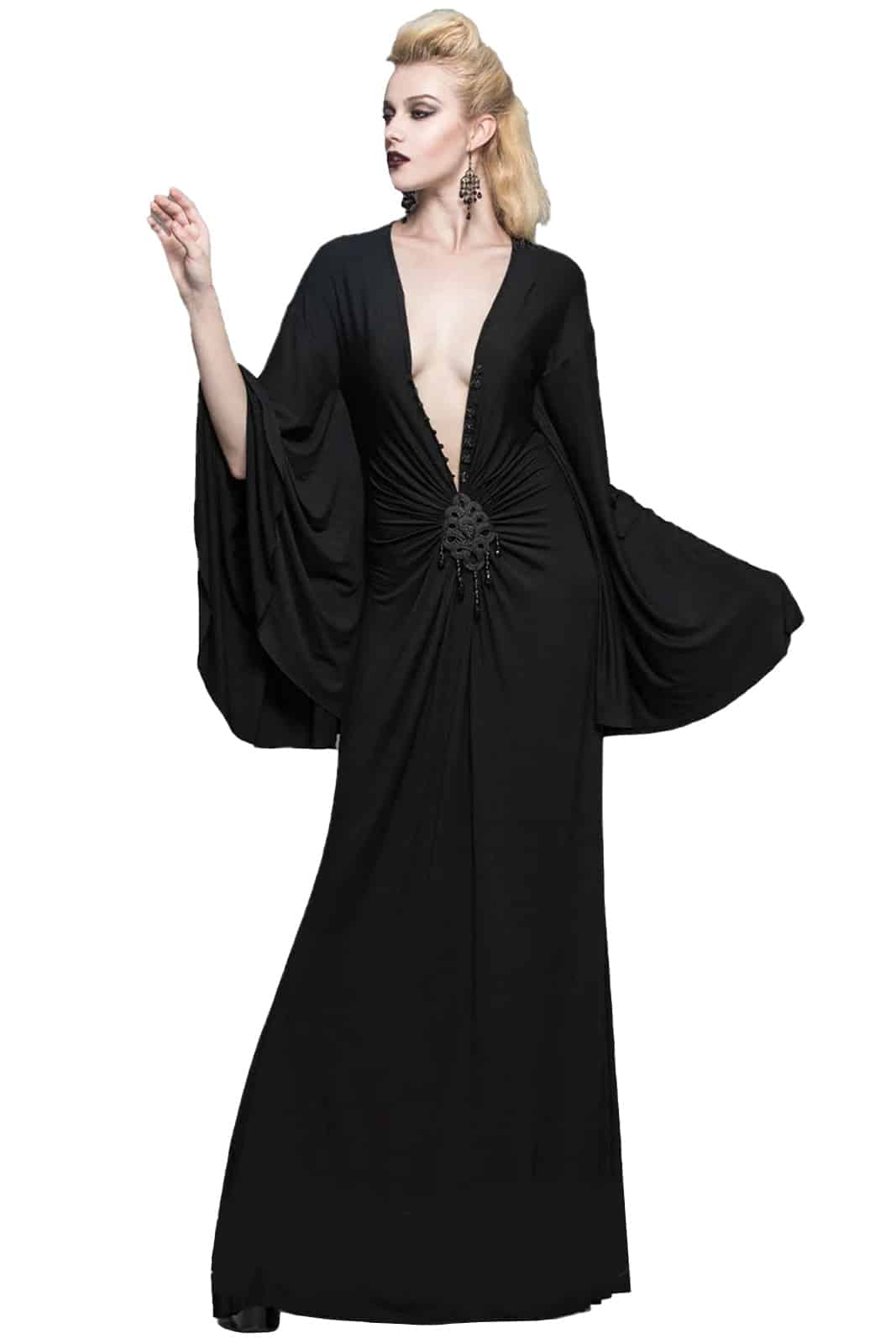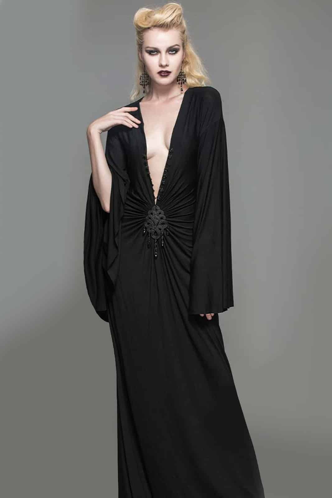 Romantisches Langkleid aus schwarzem Jersey mit tiefem V-Ausschnitt und dramatischen weiten Ärmeln. Der tiefe Ausschnitt ist mit 3D-Rosenknöpfen besetzt und mit Rüschen und einem Knotenmotiv verziert.