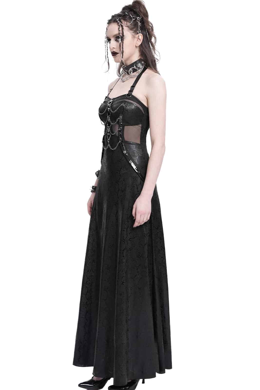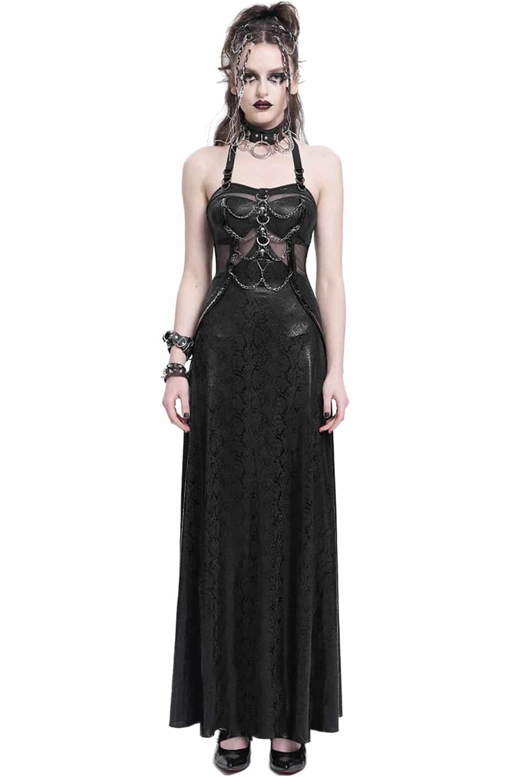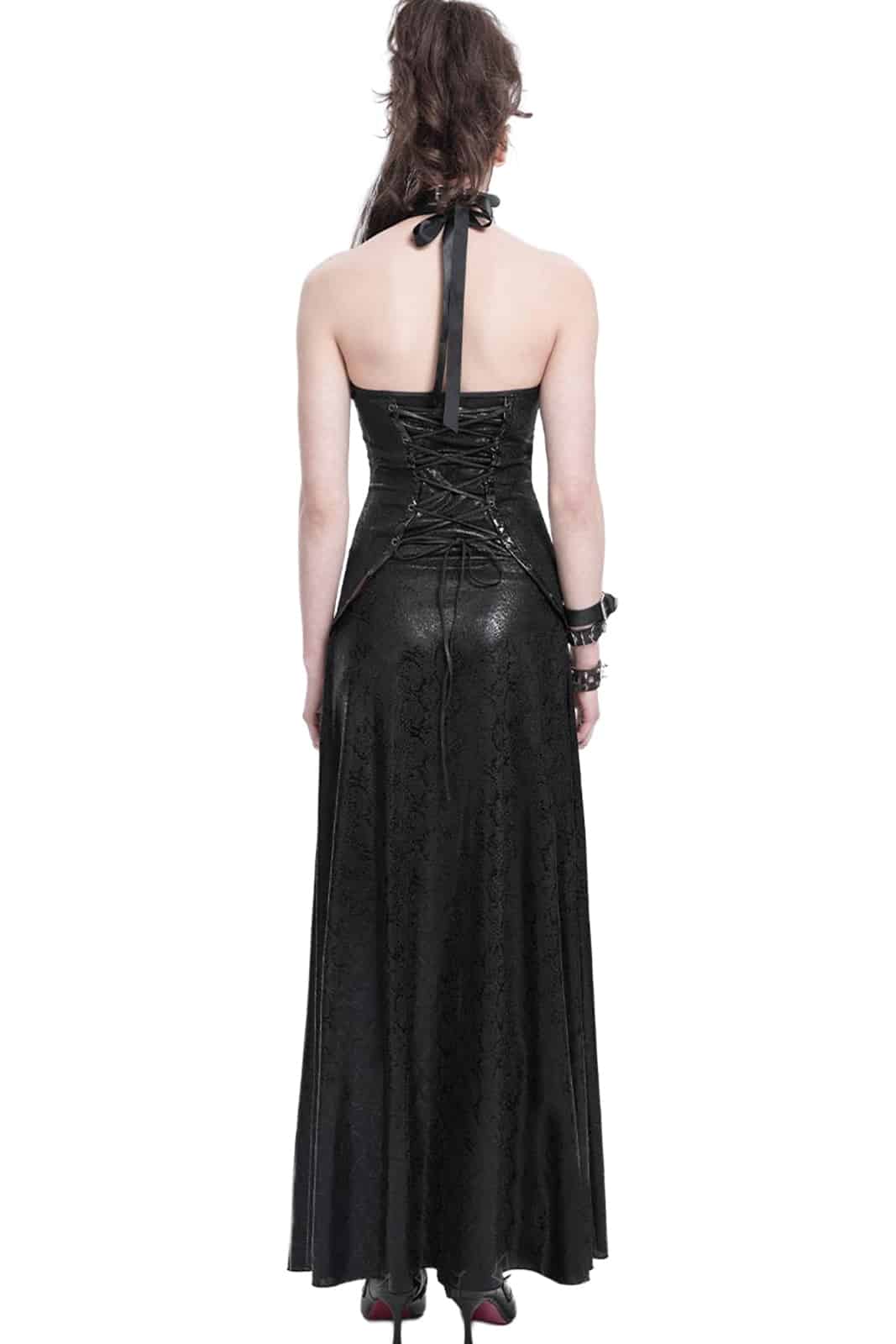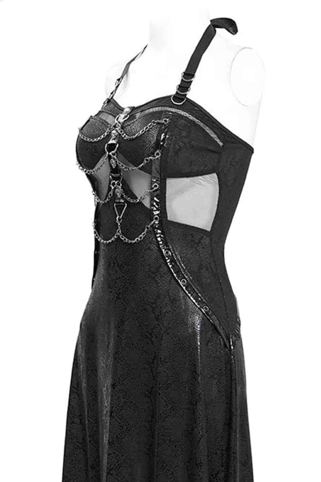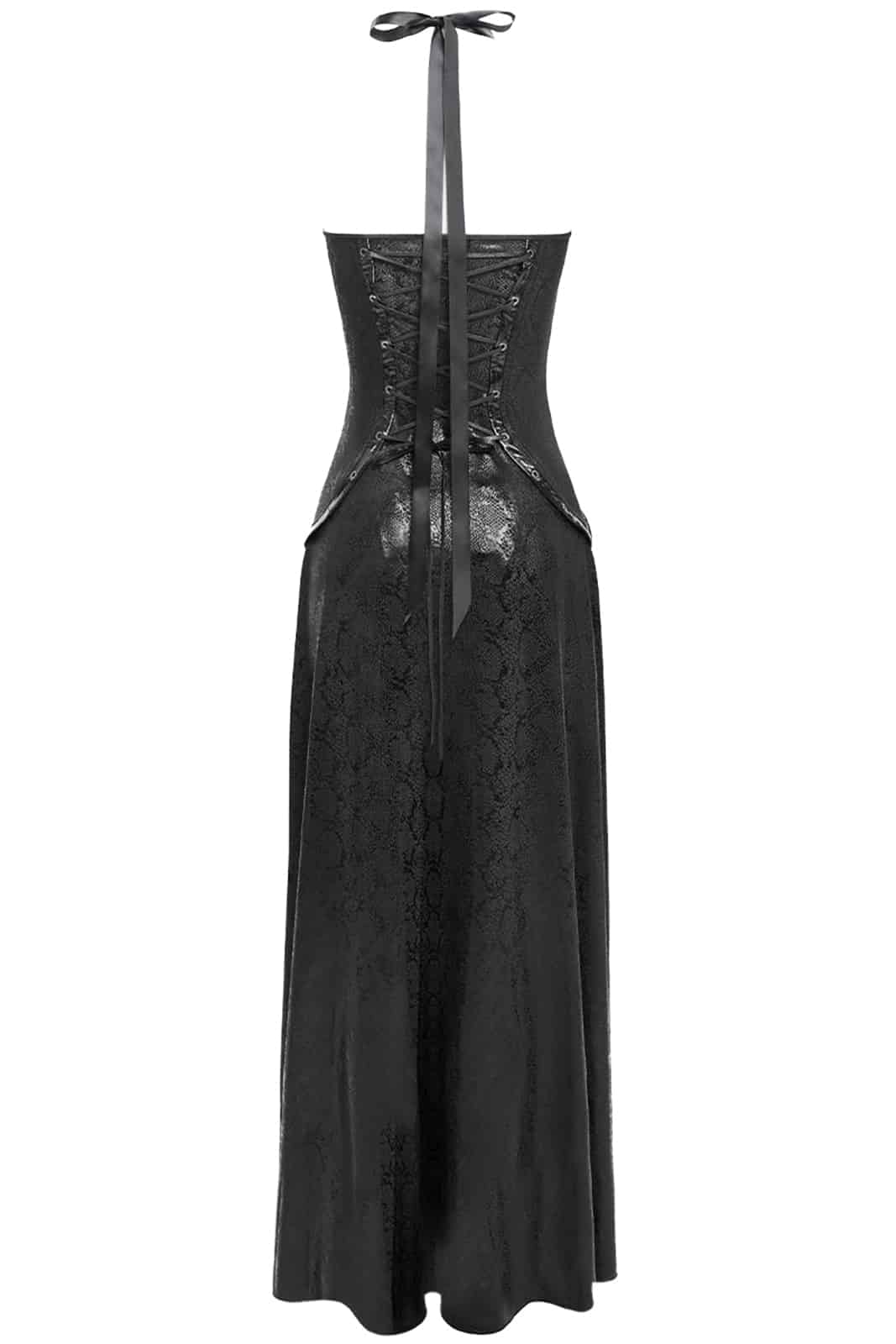 Das Snake Bite-Maxikleid ist eine verführerische Kombination aus Gothic-Eleganz und Reptilienästhetik. Gefertigt aus glänzendem Stoff mit Schlangenhaut-Print, schmiegt sich das Kleid figurbetont an den Körper und fällt in einer leicht ausgestellten A-Linie bis zum Boden. Das Dekollete ist in ein Sweetheart-Halterneck-Design gefasst und wird im Nacken mit einem Band gebunden.