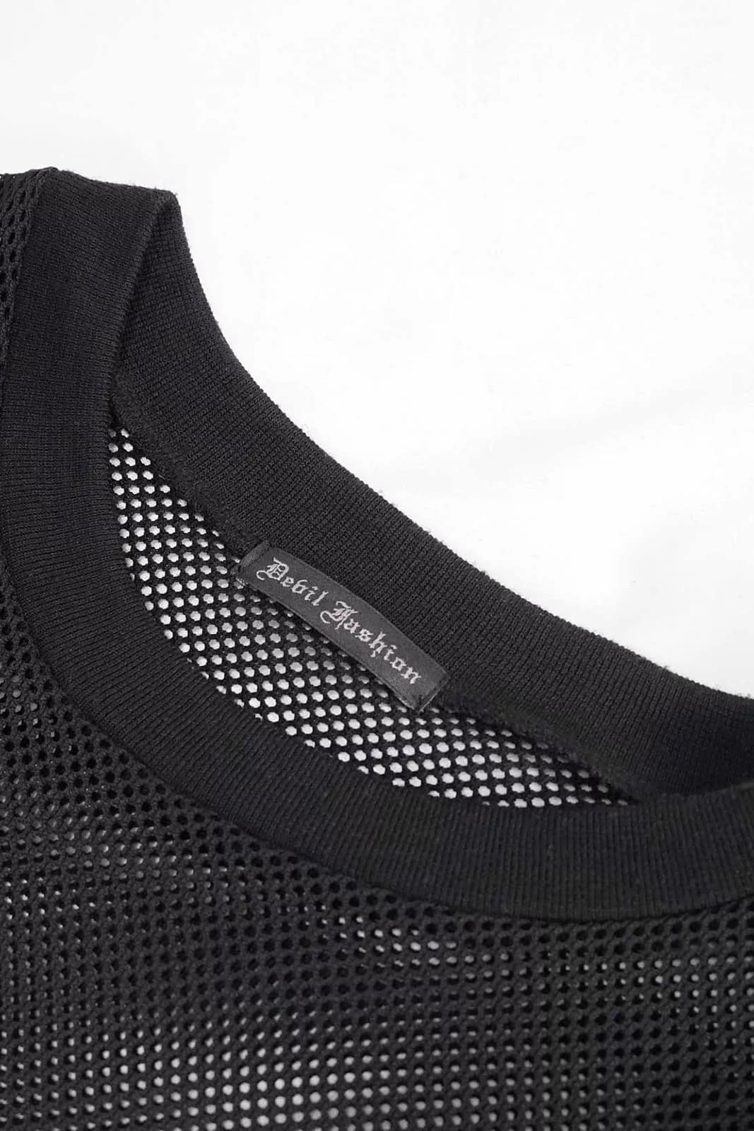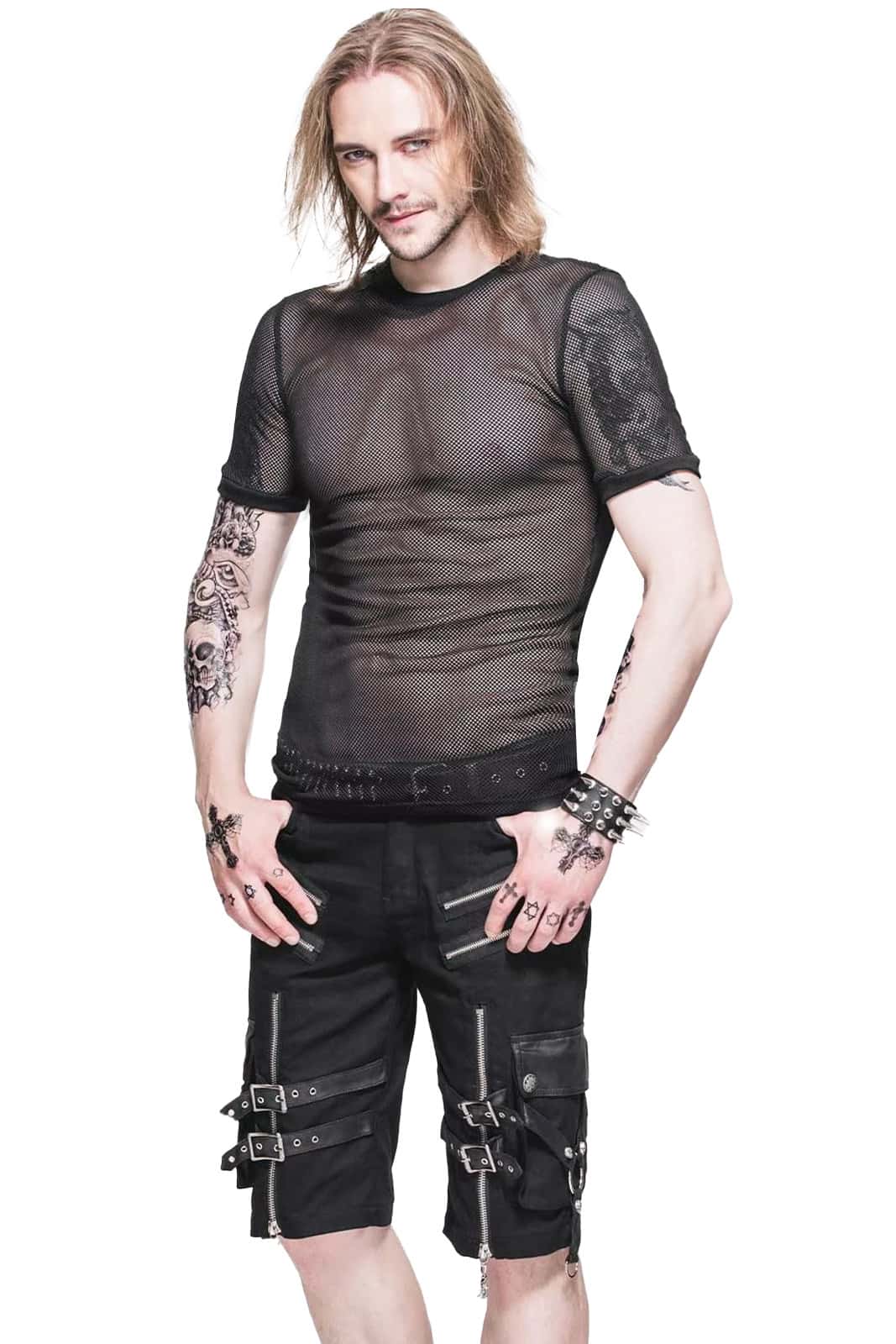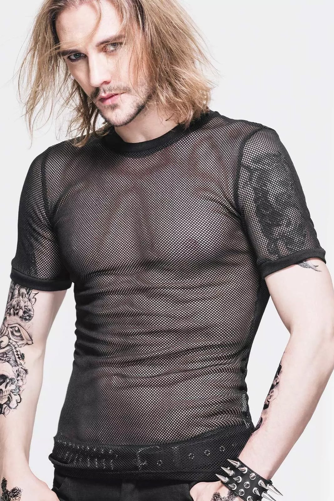 Kurzäremliges schwarzes Netz-Top für Herren das Solo oder in Kombination zum Schichten getragen werden kann. Mit seinen kurzen Ärmeln und dem Rundhalsausschnitt passt es zu allem und Jedem.