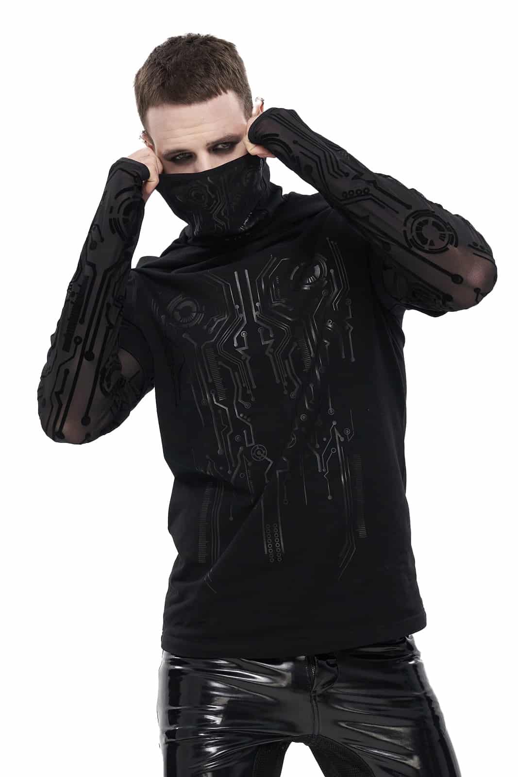 Das schwarze, elastische Jersey-Oberteil kontrastriert perfekt mit den Mesh-Ärmeln und dem Cyberpunk-Druck. Der hohe Stehkragen kann auch als Maske getragen werden. Die langen Mesh-Ärmel sind mit Daumenlöchern bestückt.