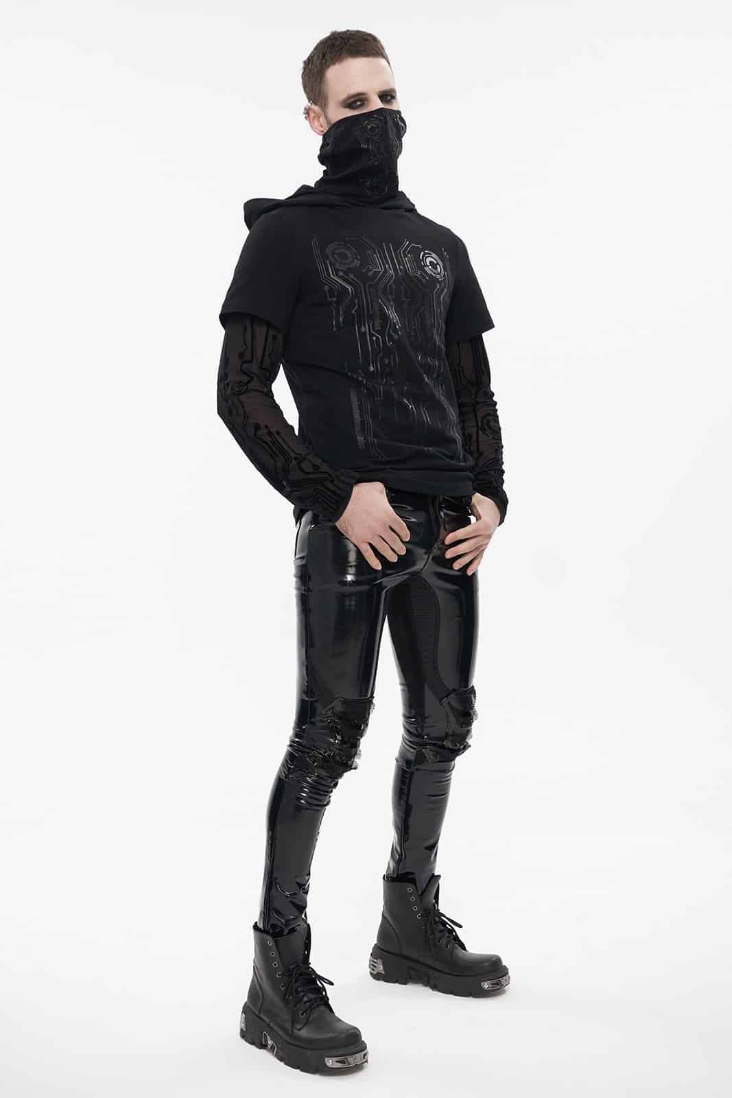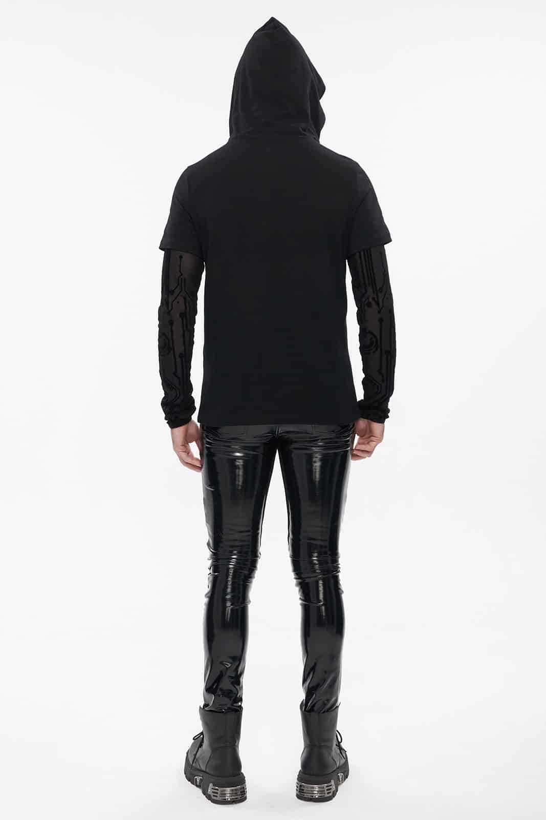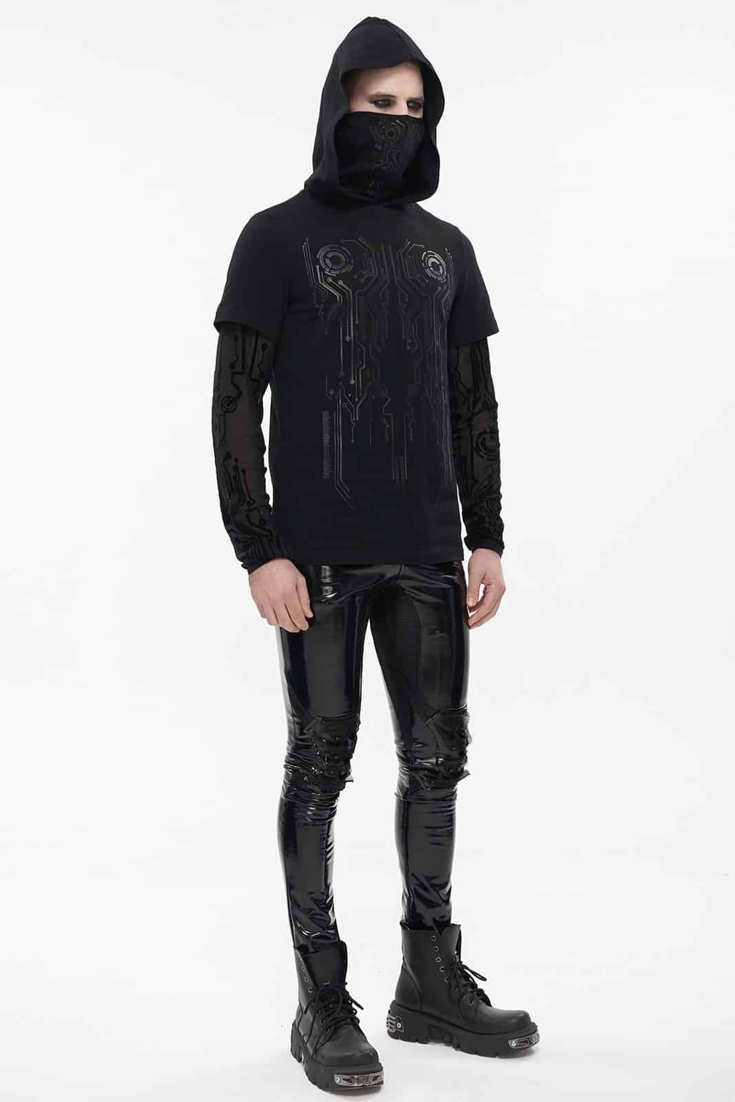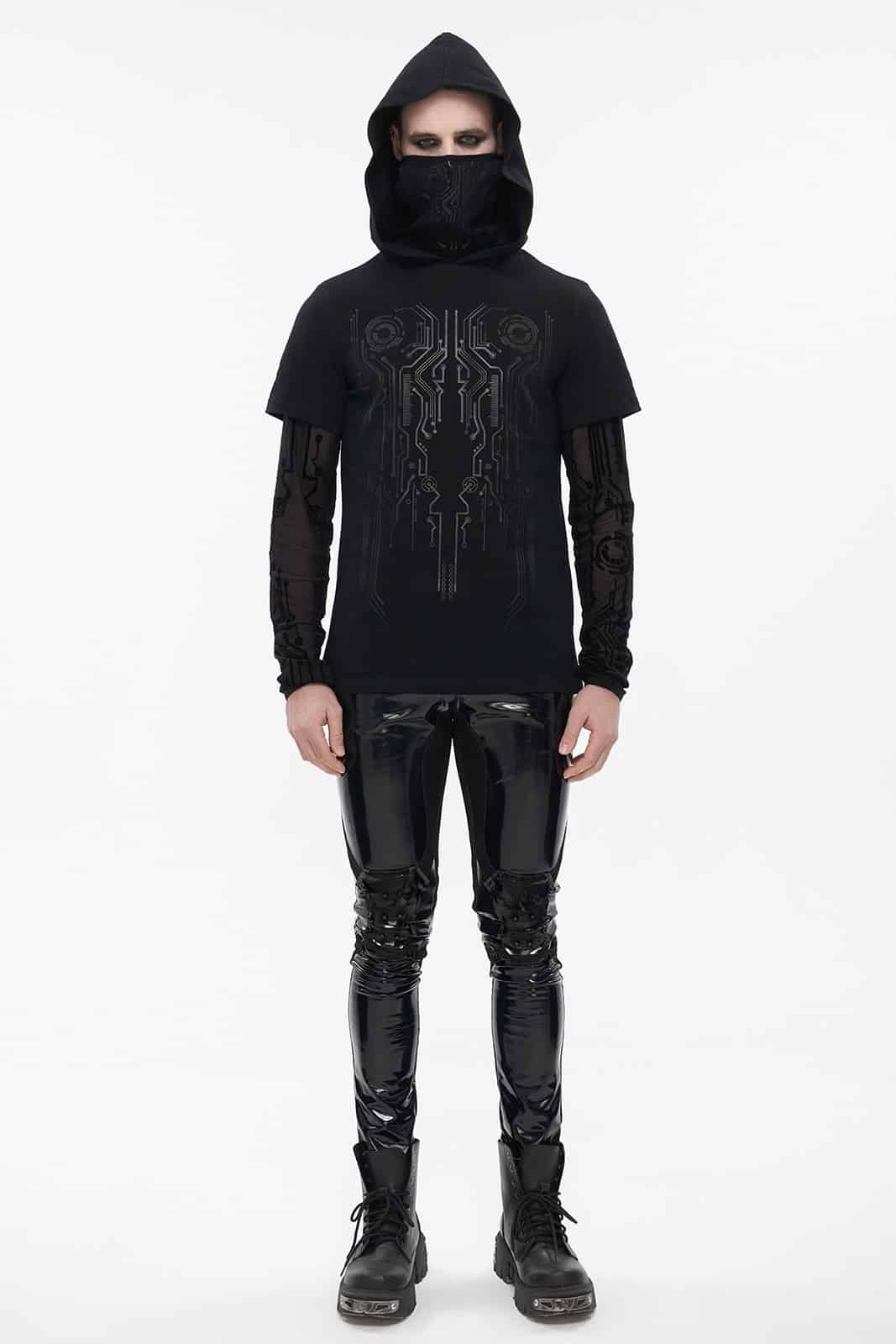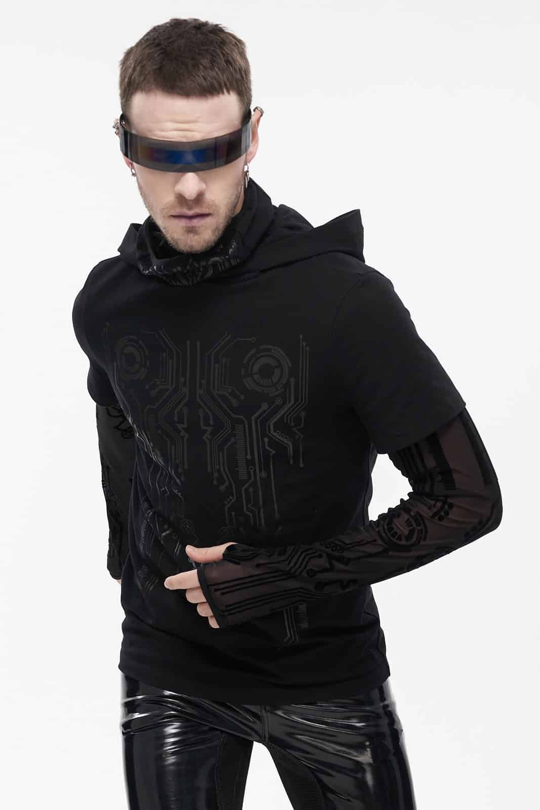Schwarzes Lagentop im Cyberpunk-Stil mit Kapuze im zweigeteilten Imitations-Look.