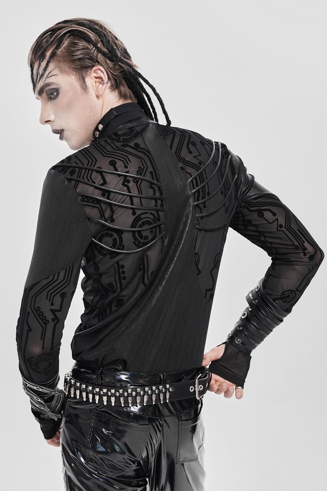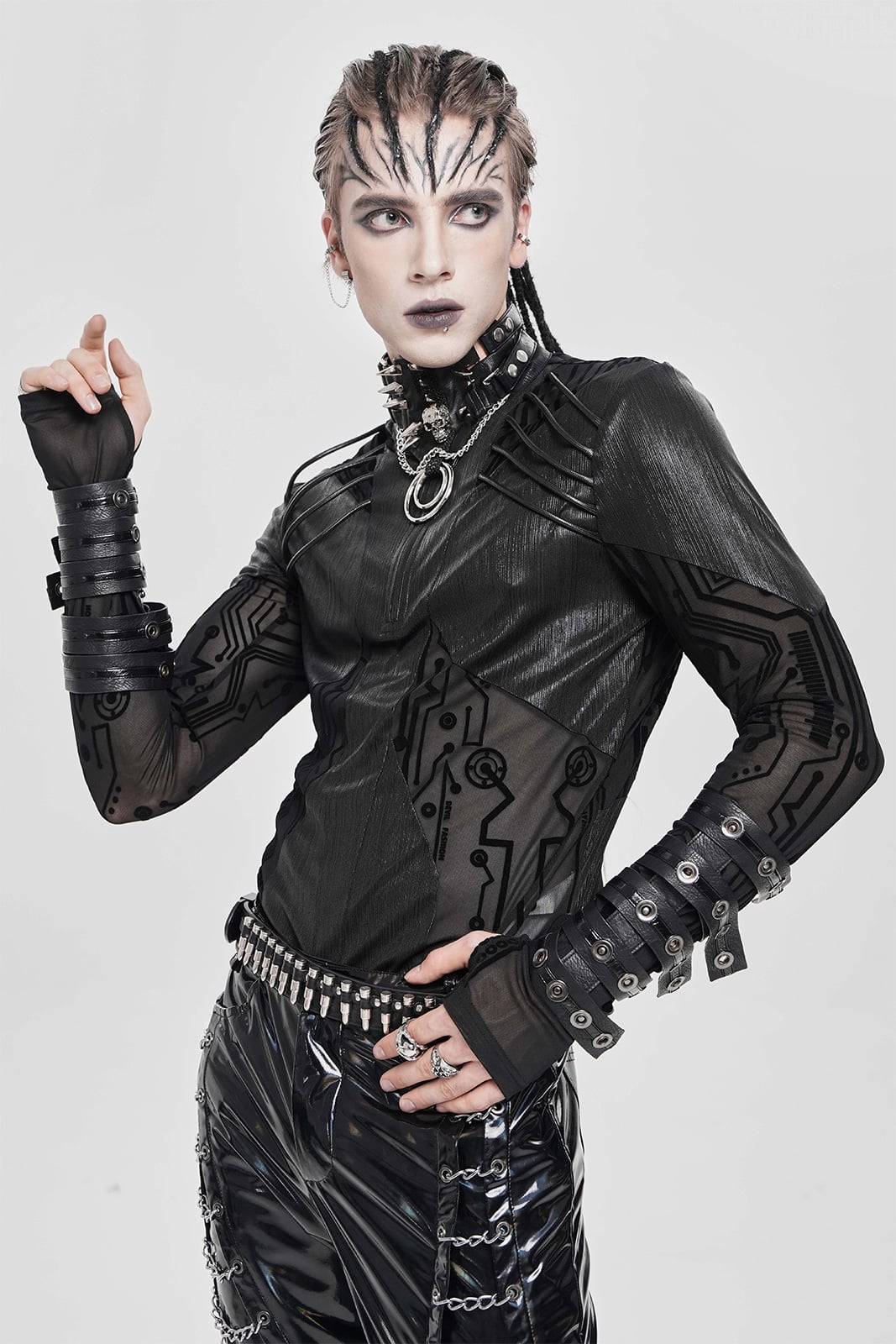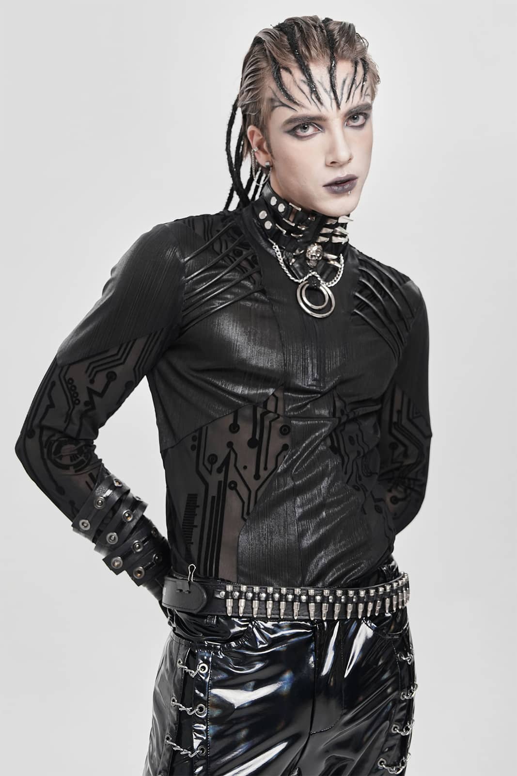 Futuristische Cyber-Ästhetik trifft auf körpernahe Silhouette: Das „Cyborg Raver“-Top kombiniert halbtransparentes Rippmaterial mit technischen Blueprint-Flockprints. Kordel-Details und der markante Stehkragen unterstreichen den kompromisslosen Cyberpunk-Charakter.