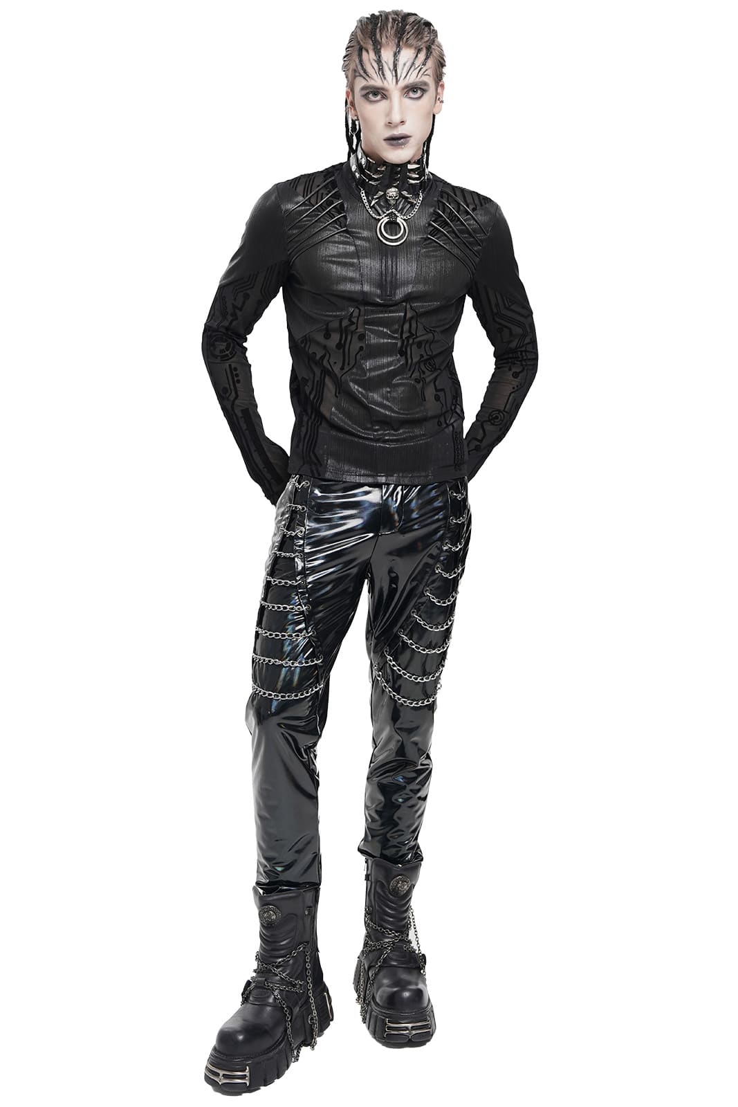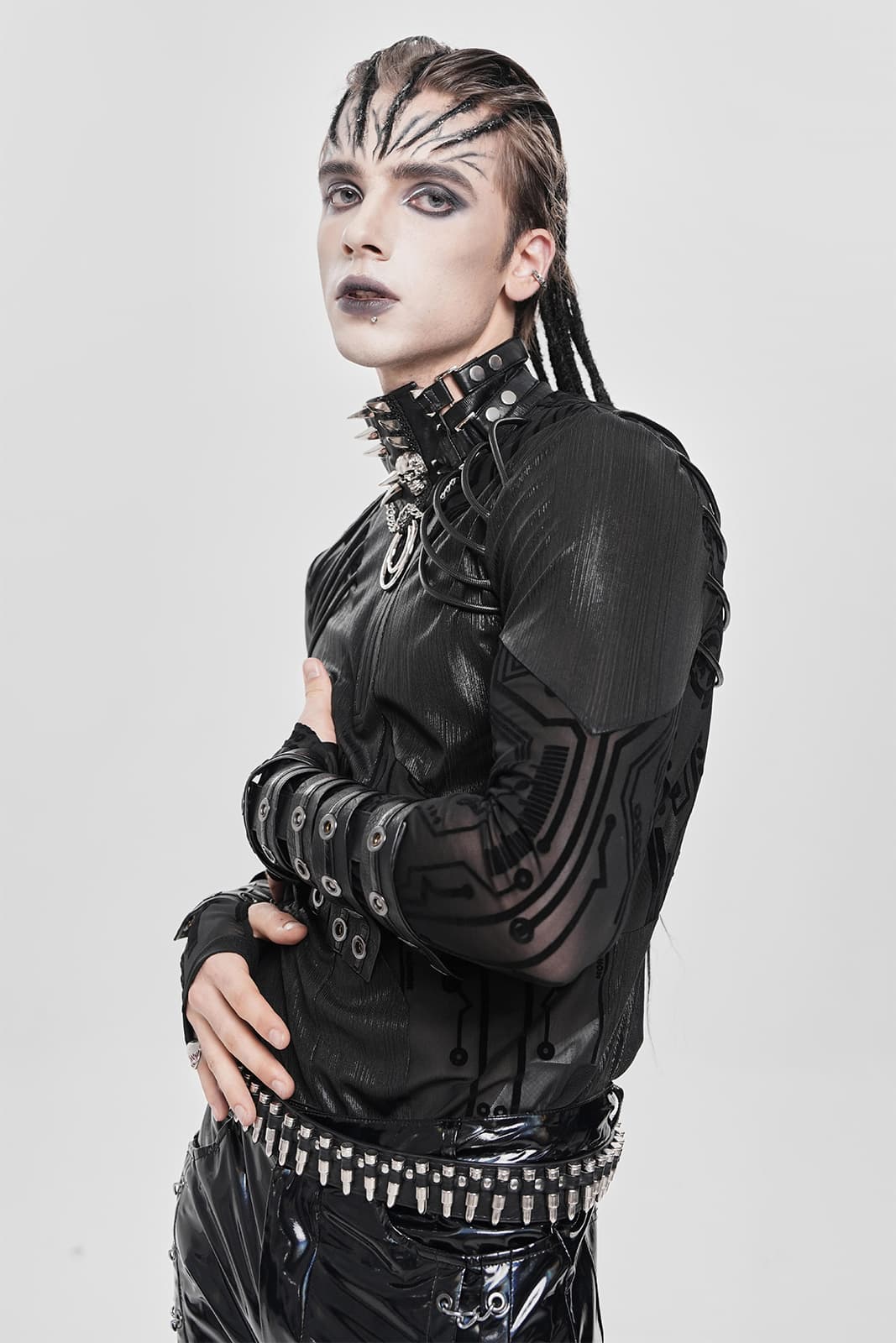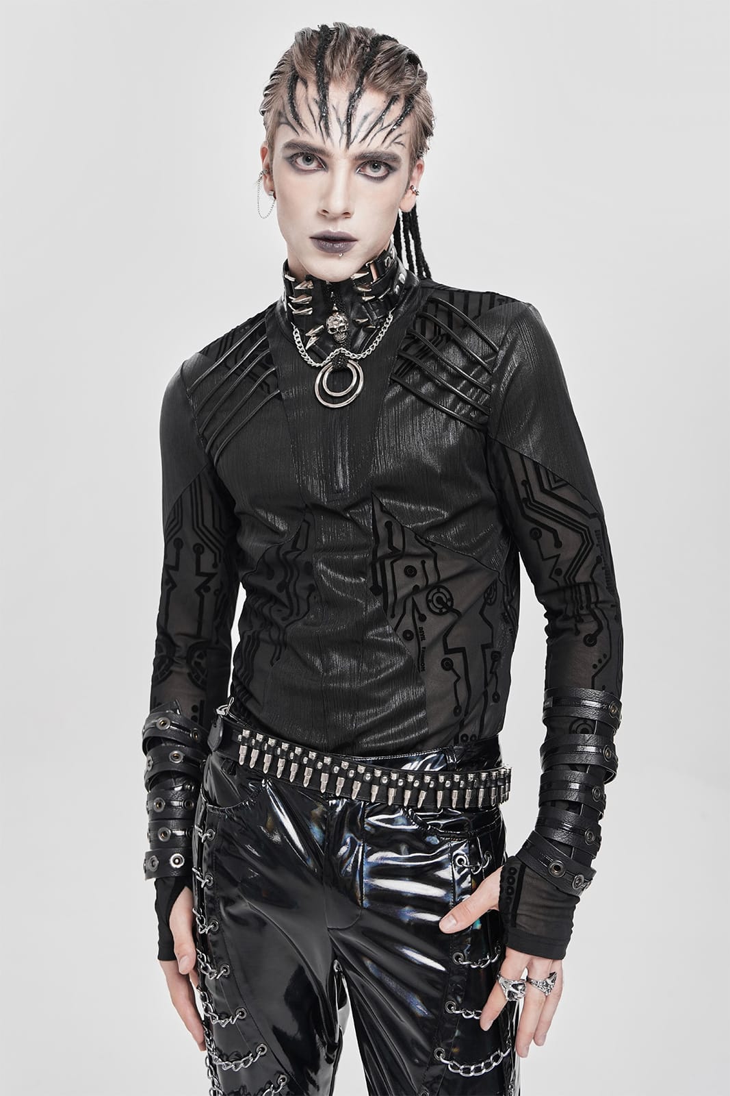 Futuristische Cyber-Ästhetik trifft auf körpernahe Silhouette: Das „Cyborg Raver“-Top kombiniert halbtransparentes Rippmaterial mit technischen Blueprint-Flockprints. Kordel-Details und der markante Stehkragen unterstreichen den kompromisslosen Cyberpunk-Charakter.