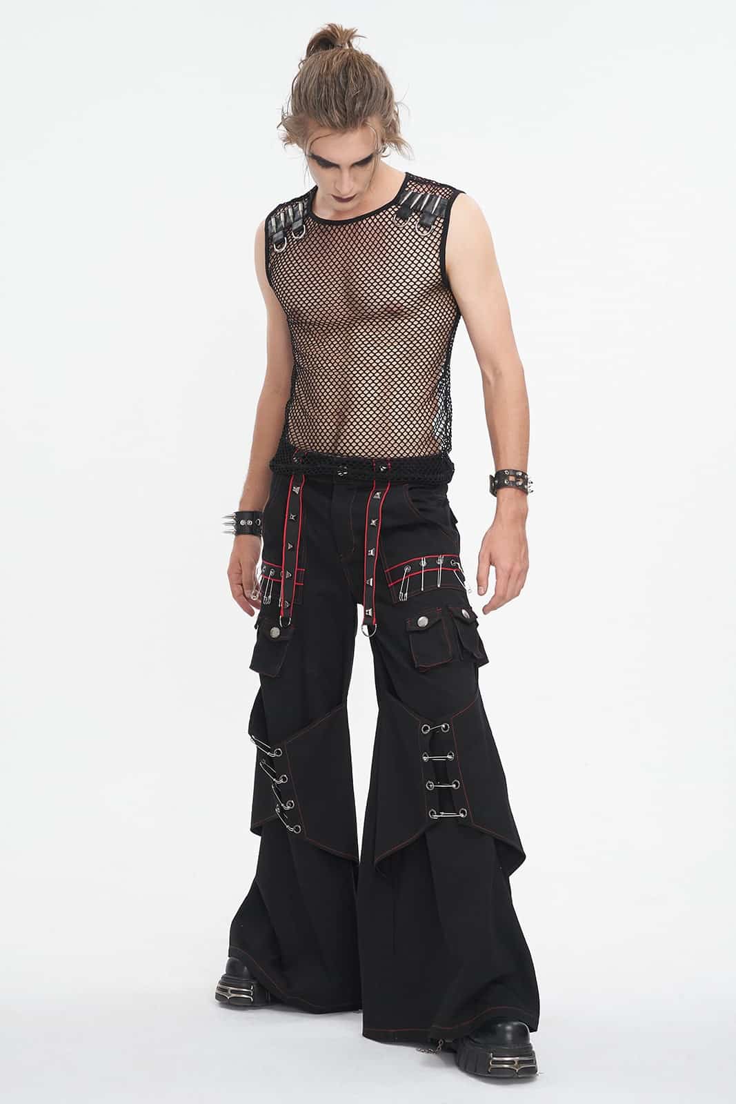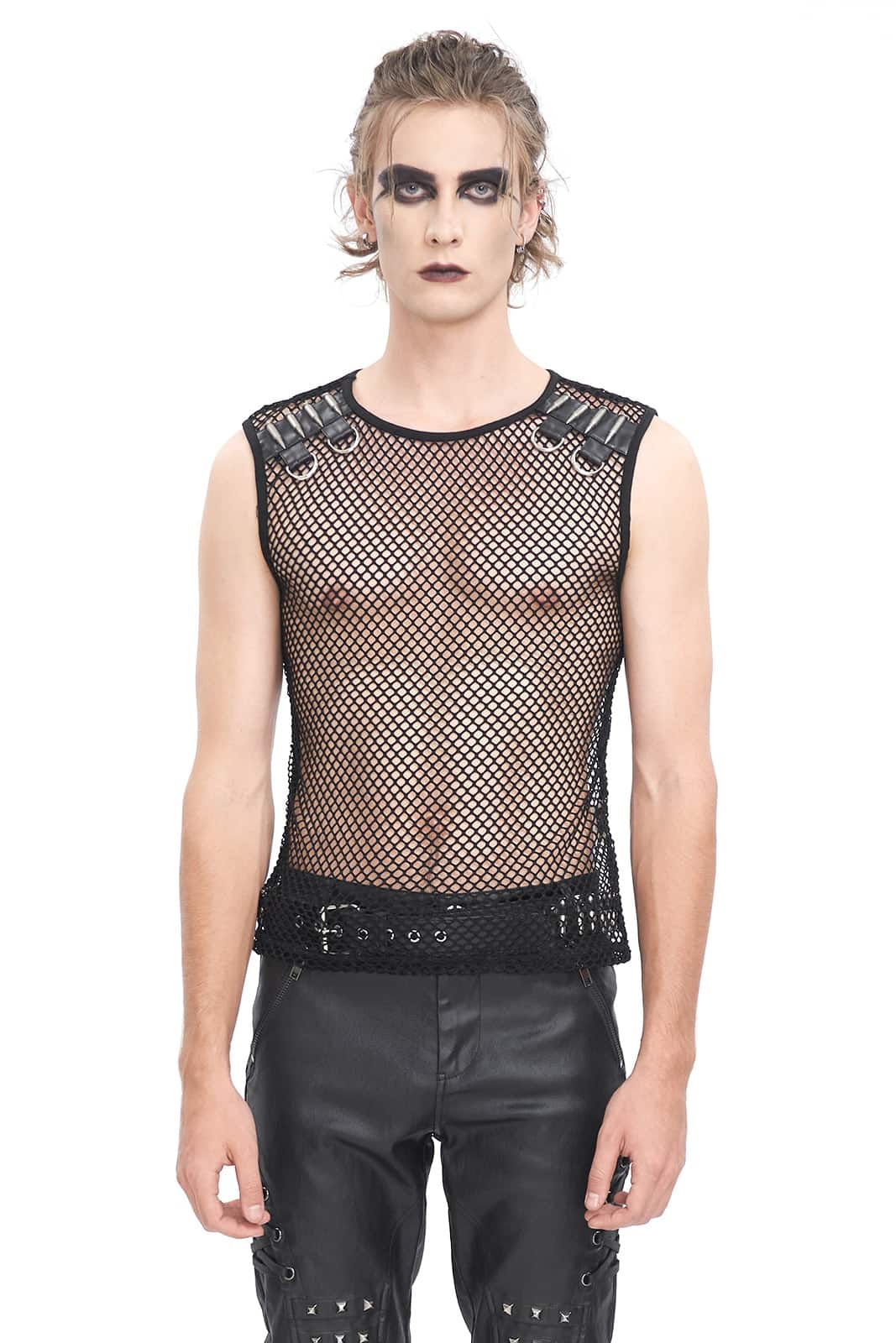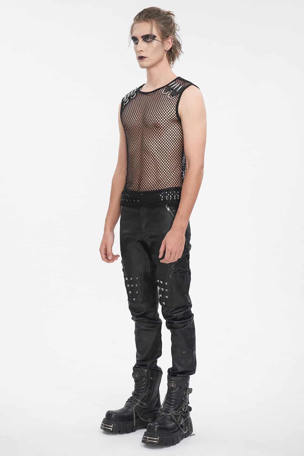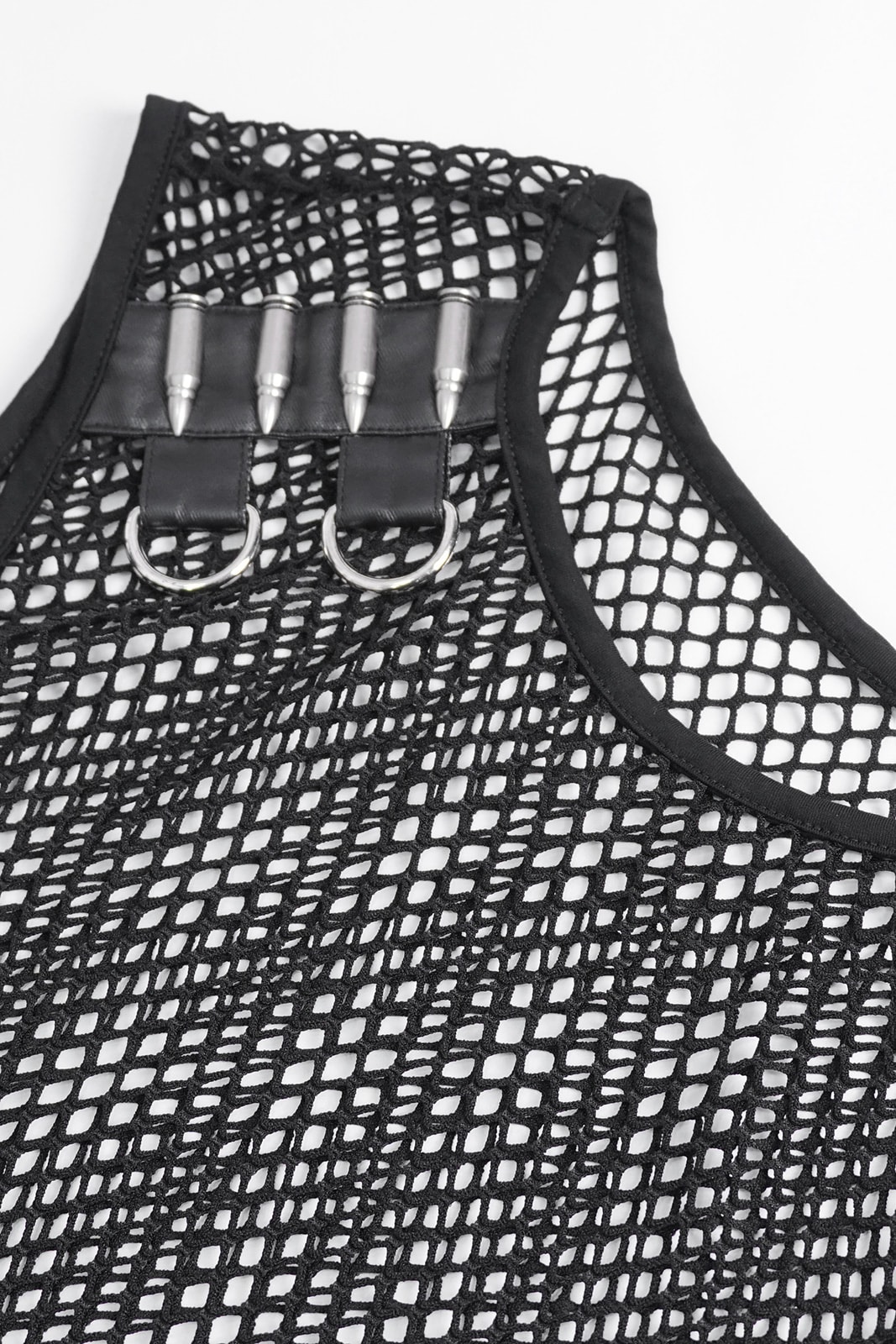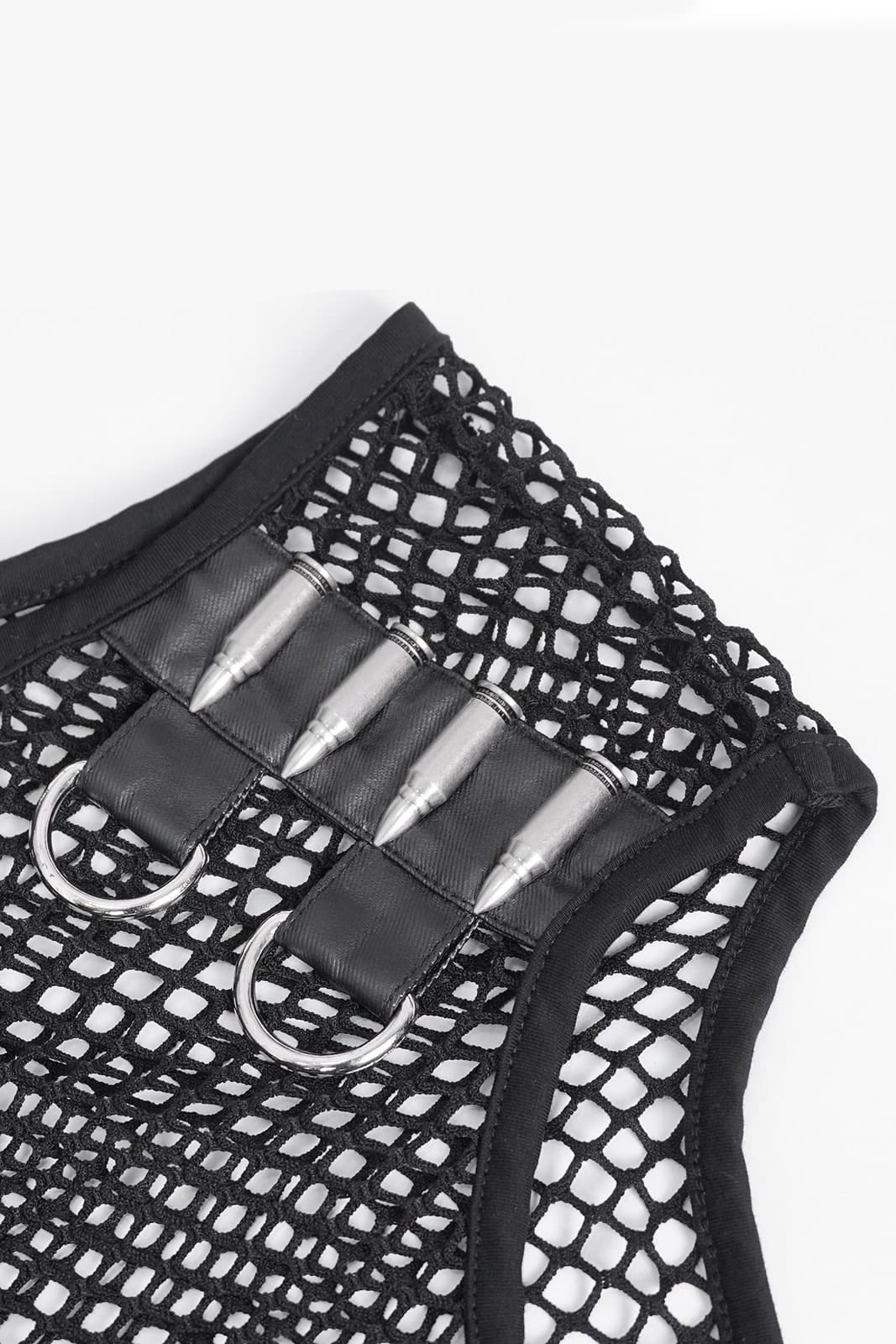Das Mean Machine Shirt ist eine Naturgewalt, entwickelt für diejenigen, die im Chaos des Untergrunds aufblühen. Dieses figurbetonte, ärmellose Oberteil besteht aus schwarzem Mesh-Gewebe und bietet sowohl Atmungsaktivität als auch einen unbestreitbaren Look. Der runde Ausschnitt sorgt für eine klare, stromlinienförmige Silhouette, während die Riemendetails aus Kunstleder an den Schultern für einen markanten Touch sorgen und mit Patronen und D-Ringen imitiert sind. Dieses Oberteil ist eine wahre Mischung aus Robustheit und Stil und spricht Bände, ohne ein Wort zu sagen.