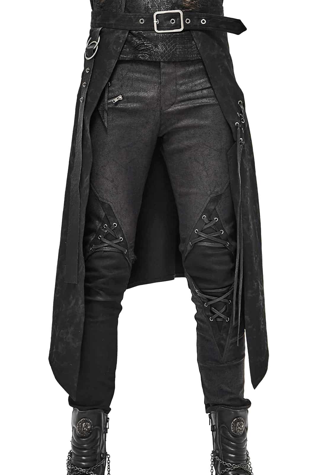 Postapokalyptischer Überrock mit verstellbarem Gürtel und Schnürdetail. Verziert mir Riemen, Pyramiedennieten und O-Ringen.
