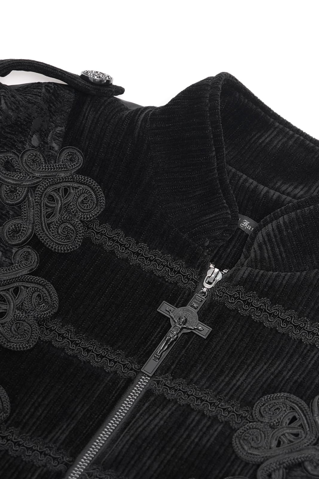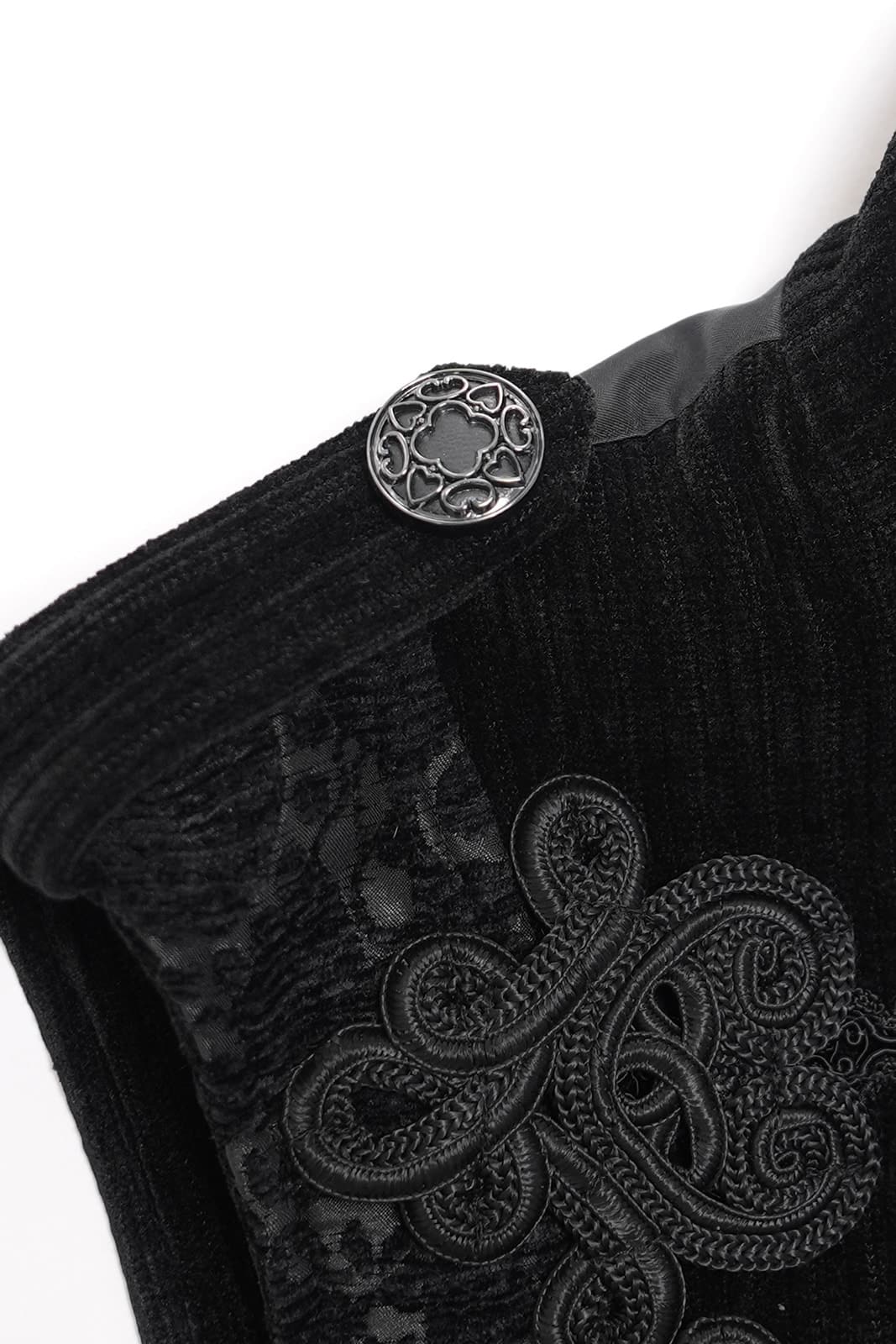 Schwarze Brokat-Weste im viktorianischen Gothic-Stil mit Reißverschluß und Stickerei-Spitzen-Applikationen. Der Reißverschluß an der Vorderseite ist mit einem wunderschönen Kreuz-Zipper bestückt. Neben dem kurzen Stehkragen zieren Klappen die Schultern. Im Rücken mit Riegel zum Einstellen der Taille.