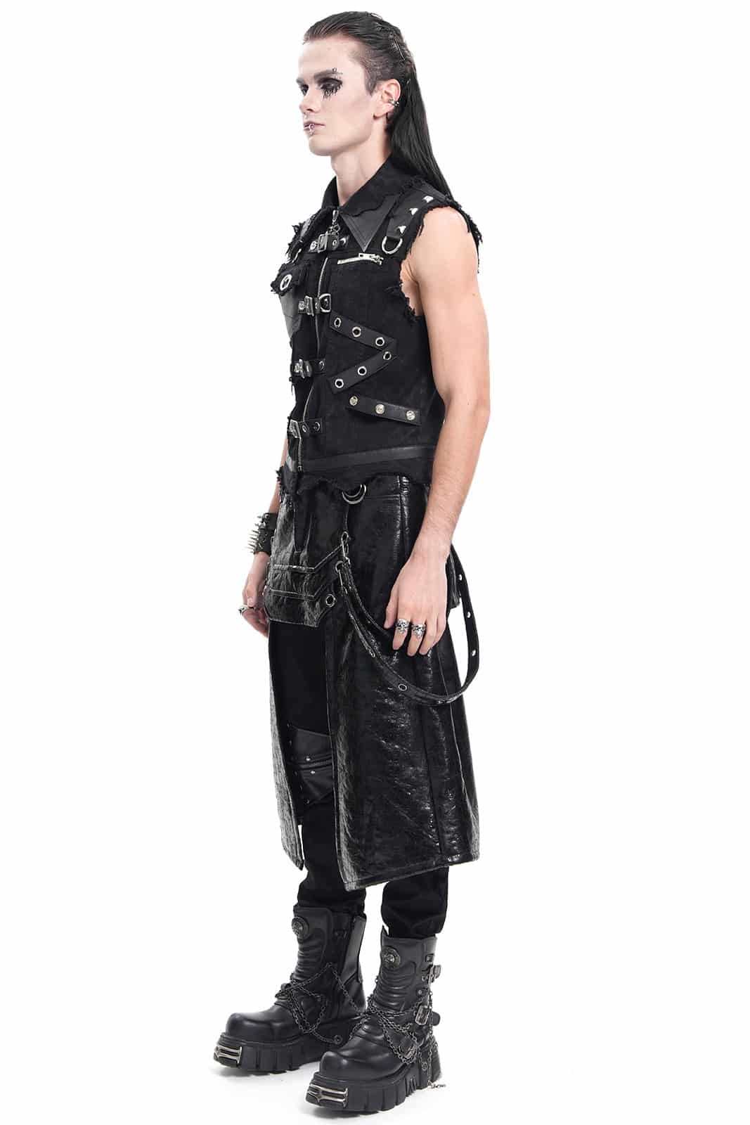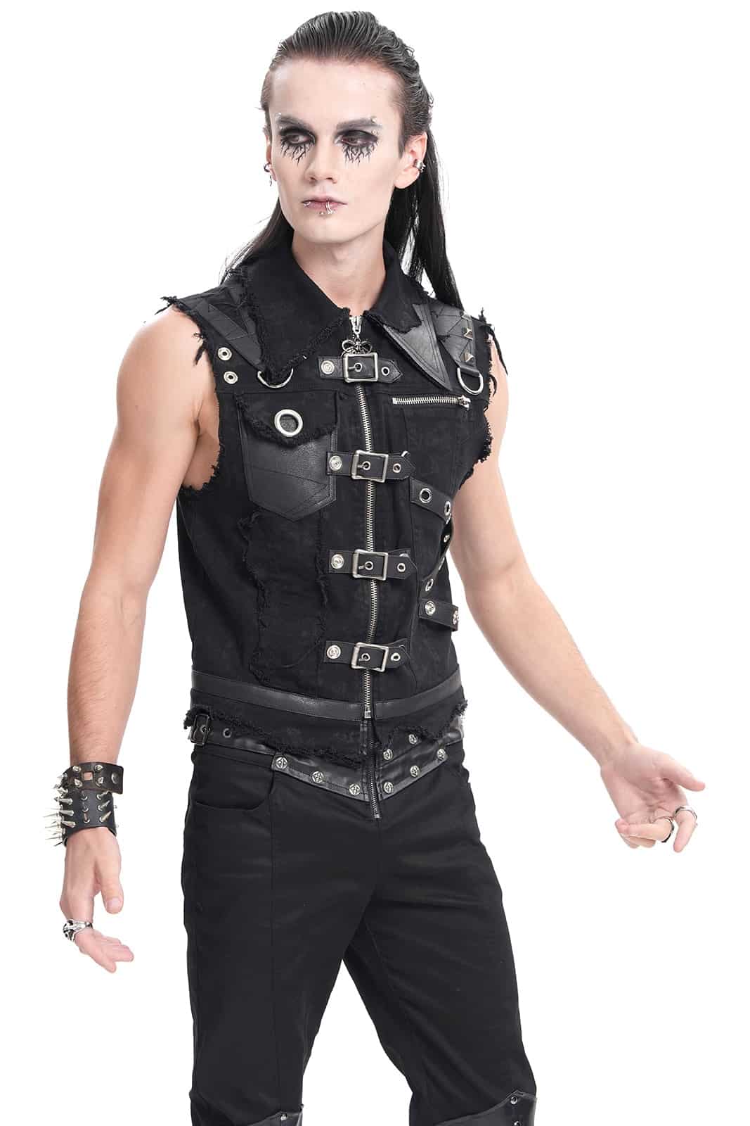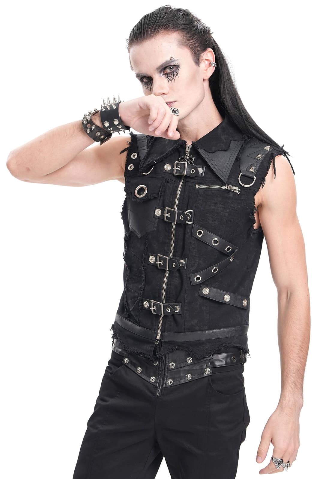 Gothic-Weste mit einem Grundkörper aus hochwertiger Baumwolle, der angenehm auf der Haut liegt. Die Vorderseite ist mit einem durchgehenden Reißverschluß versehen, der mit 4 Schnallen überlagert ist. Kunstlederdetails schmücken die Front, den Kragen und die Schultern.