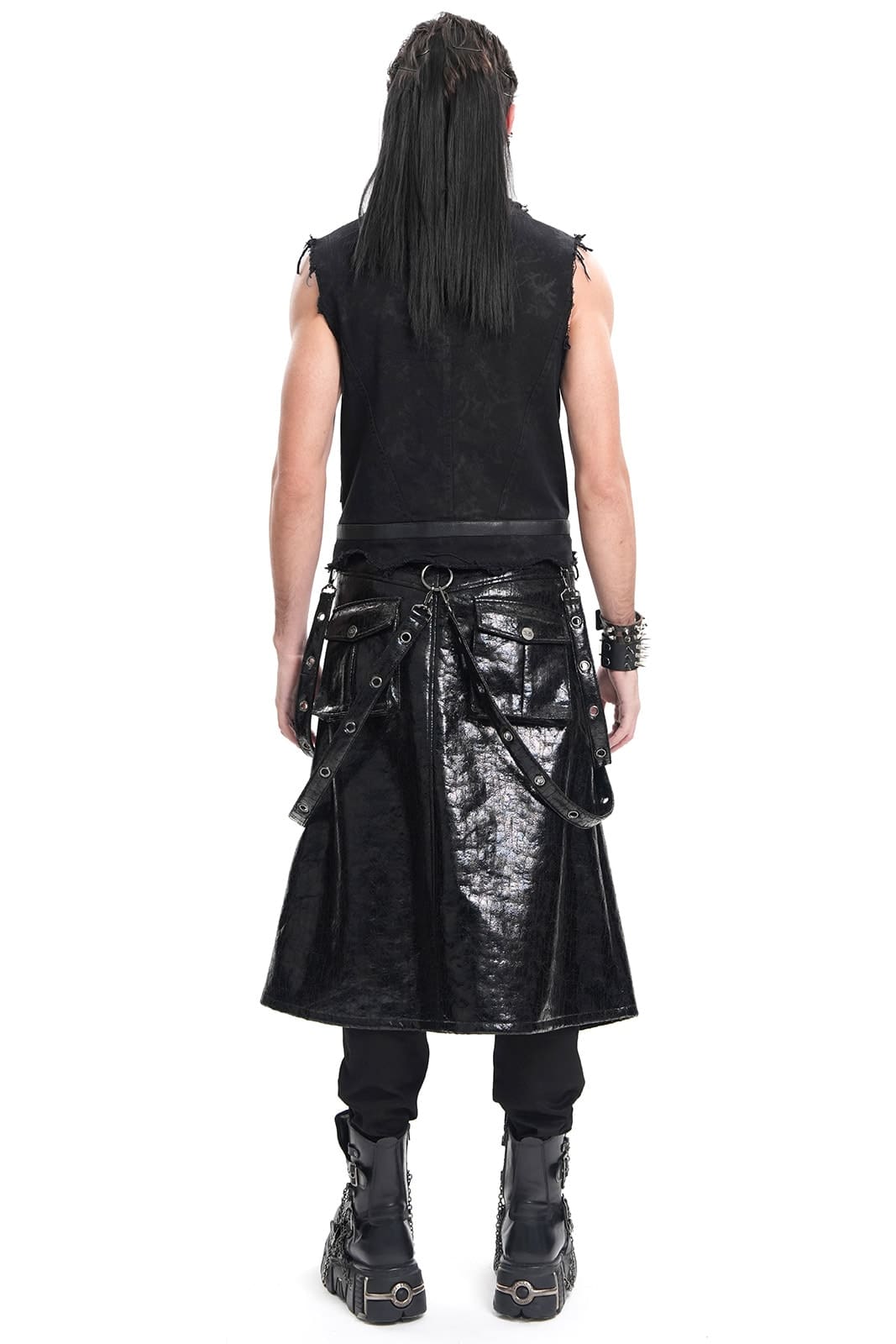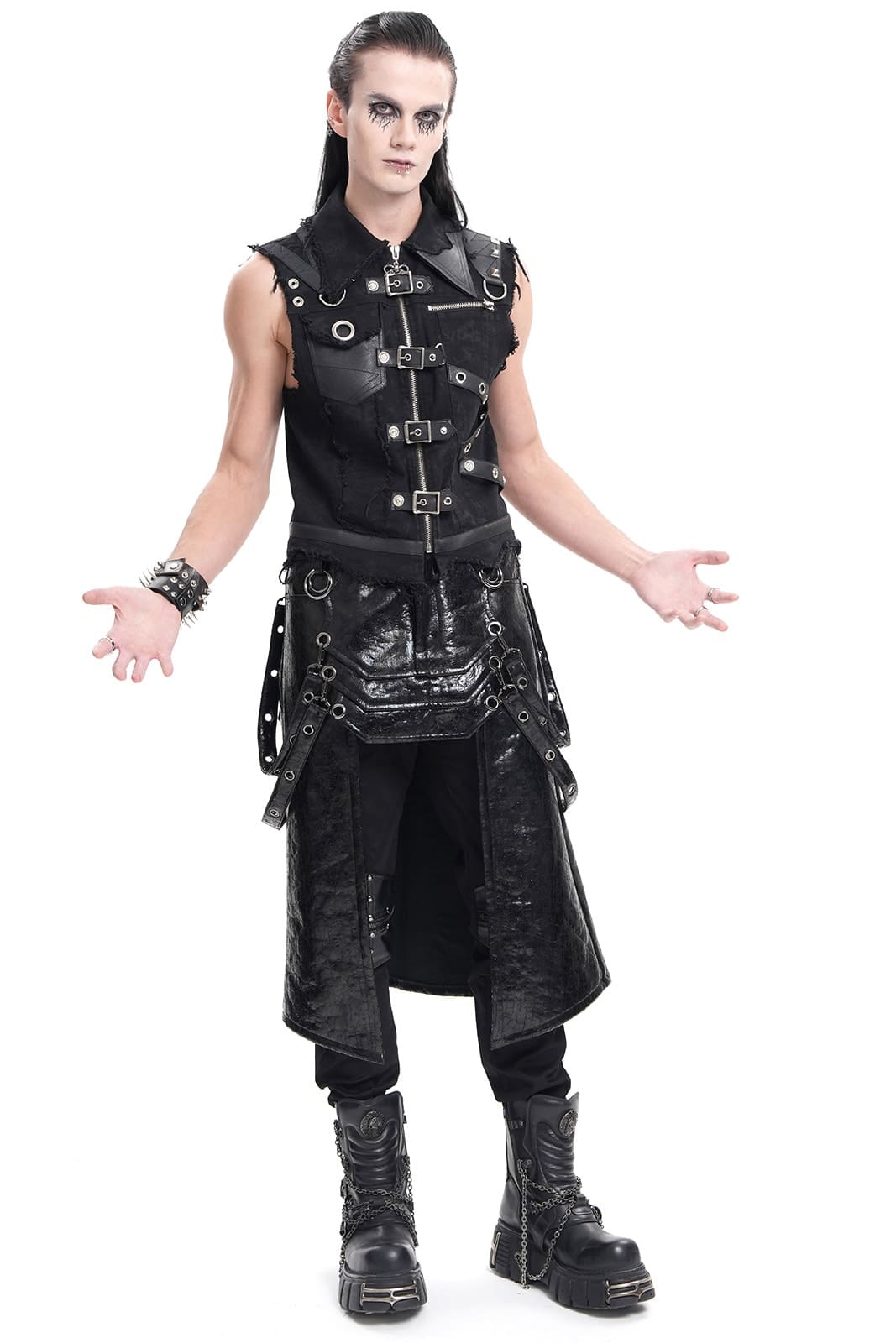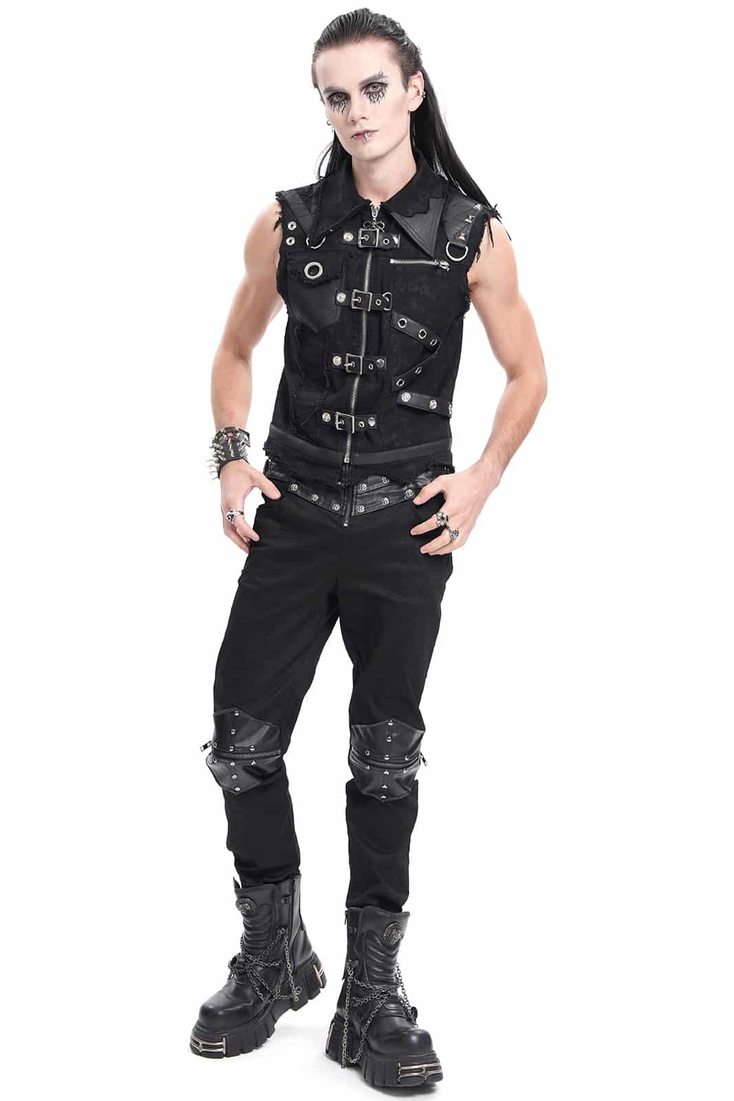 Gothic-Weste mit einem Grundkörper aus hochwertiger Baumwolle, der angenehm auf der Haut liegt. Die Vorderseite ist mit einem durchgehenden Reißverschluß versehen, der mit 4 Schnallen überlagert ist. Kunstlederdetails schmücken die Front, den Kragen und die Schultern.