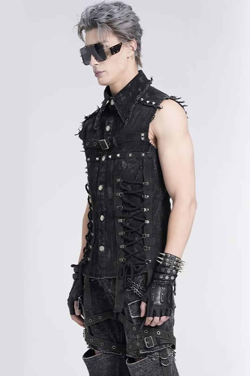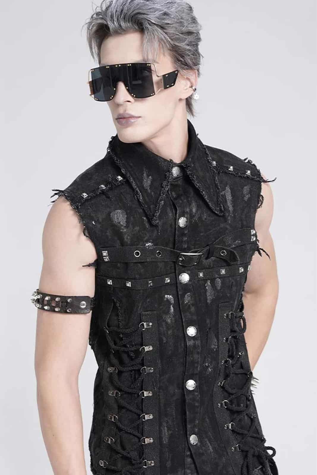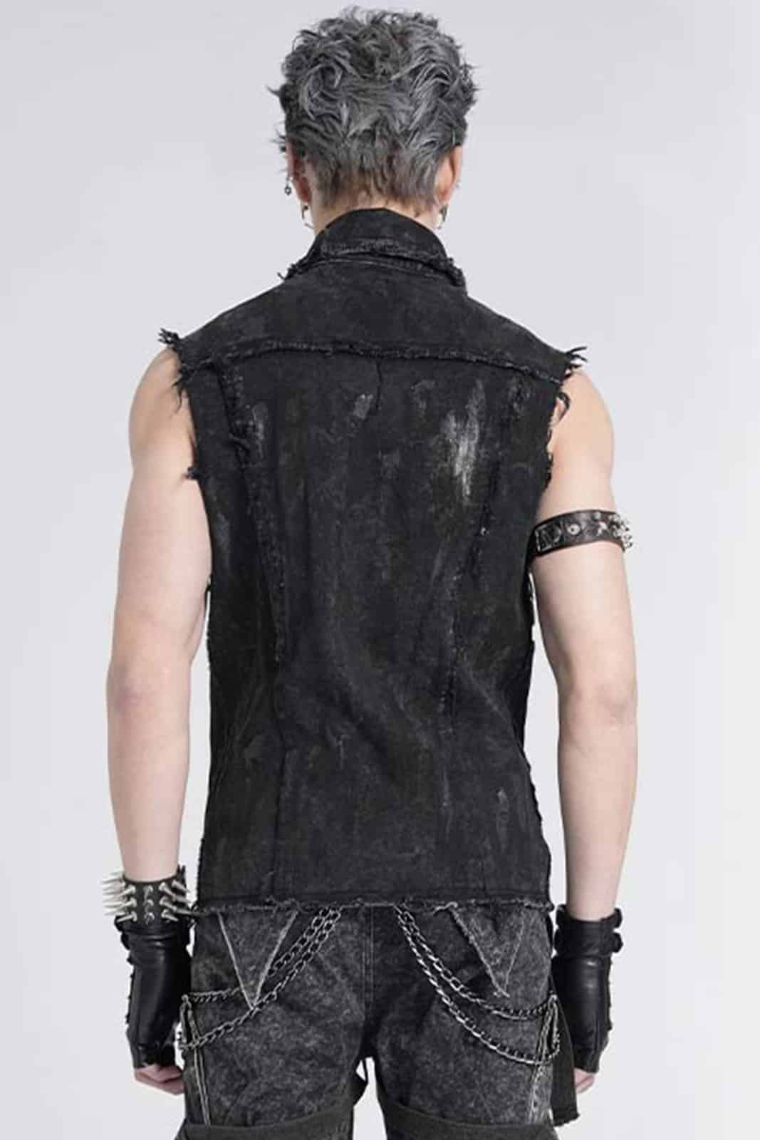 Diese ärmellose Herrenweste im düsteren Punk-Stil überzeugt durch ihren markanten Used-Look und eine kraftvolle, rebellische Ausstrahlung. Das figurbetonte Design wird durch bewusst ausgefranste Kanten und eine unregelmäßige Oberflächenstruktur ergänzt, die der Weste eine authentisch getragene Optik verleihen. Auffällige Schnürdetails an der Front, robuste Nieten sowie ein verstellbarer Riemen mit Schnalle im Brustbereich unterstreichen den industriellen Charakter. Der klassische Kragen rundet das Design ab und sorgt für eine klare, maskuline Silhouette.