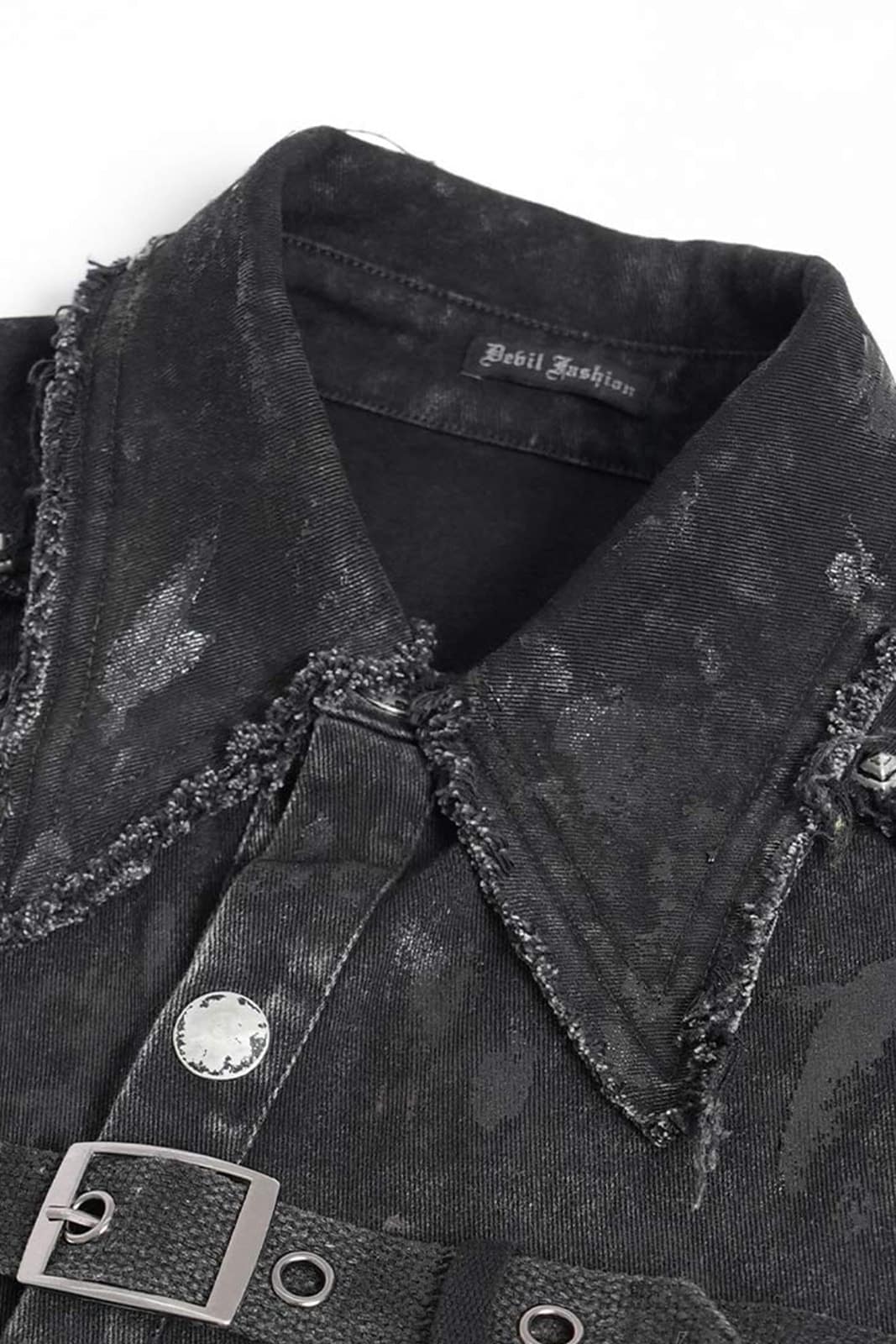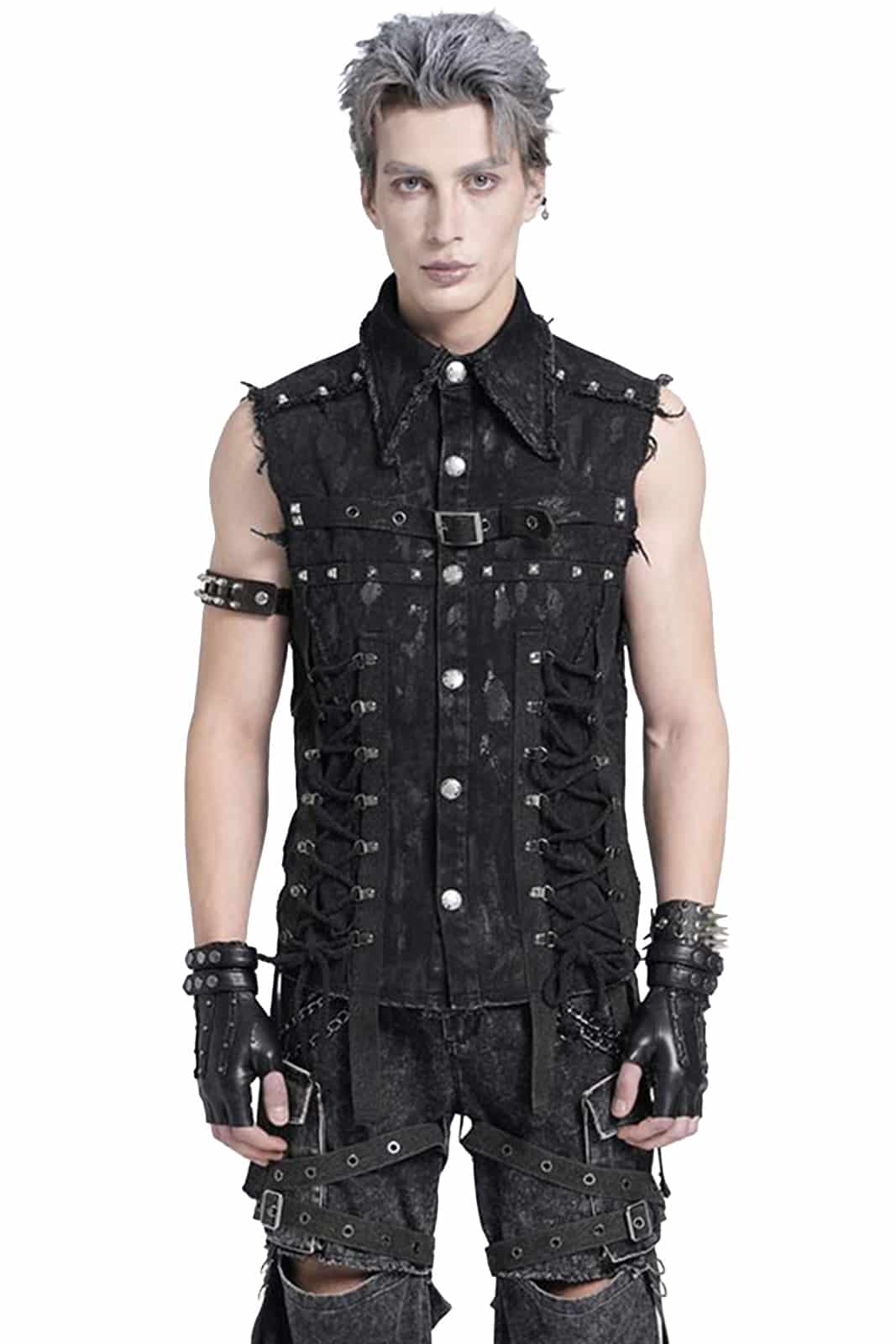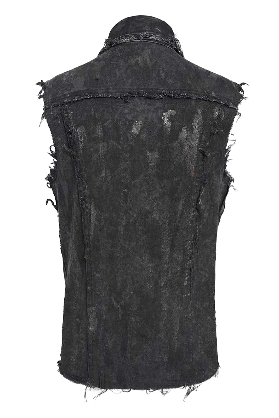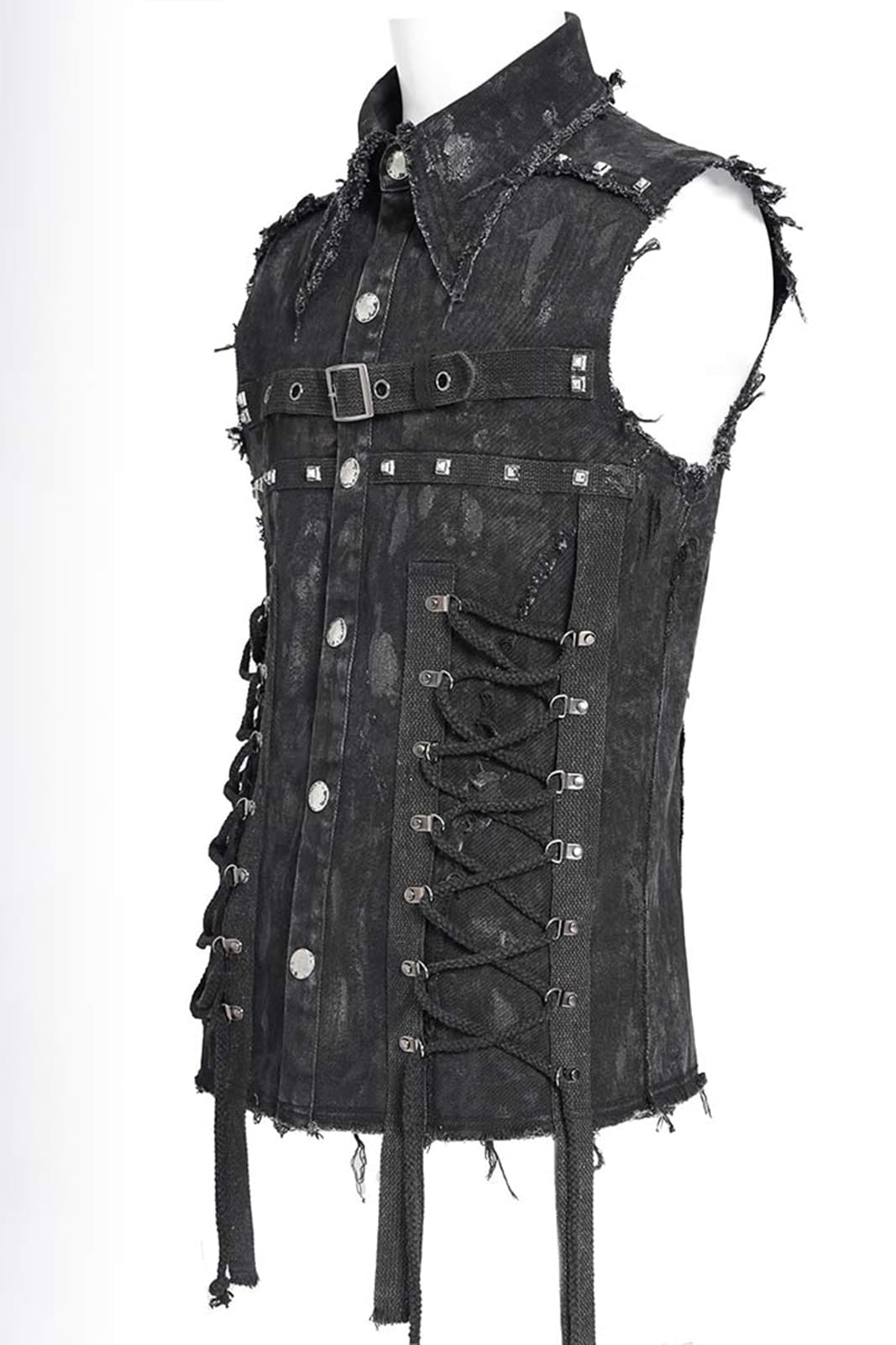 Diese ärmellose Herrenweste im düsteren Punk-Stil überzeugt durch ihren markanten Used-Look und eine kraftvolle, rebellische Ausstrahlung. Das figurbetonte Design wird durch bewusst ausgefranste Kanten und eine unregelmäßige Oberflächenstruktur ergänzt, die der Weste eine authentisch getragene Optik verleihen. Auffällige Schnürdetails an der Front, robuste Nieten sowie ein verstellbarer Riemen mit Schnalle im Brustbereich unterstreichen den industriellen Charakter. Der klassische Kragen rundet das Design ab und sorgt für eine klare, maskuline Silhouette.