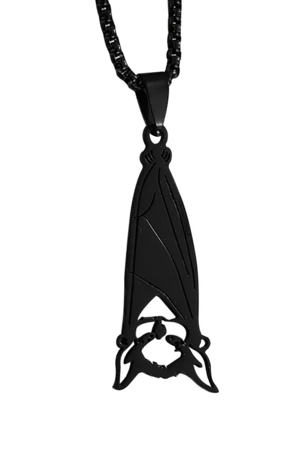 Halskette aus Edelstahl in Form einer auf dem Kopf hängenden Fledermaus.