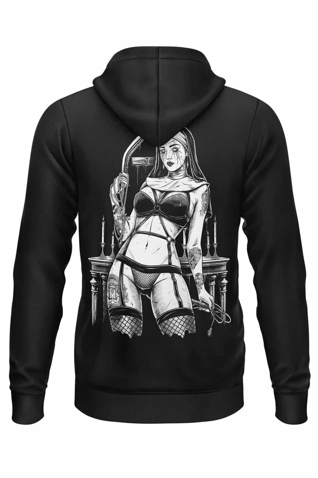 Gothic Pullover mit Känguruhtaschen und großer Kapuze mit Kordelzug.