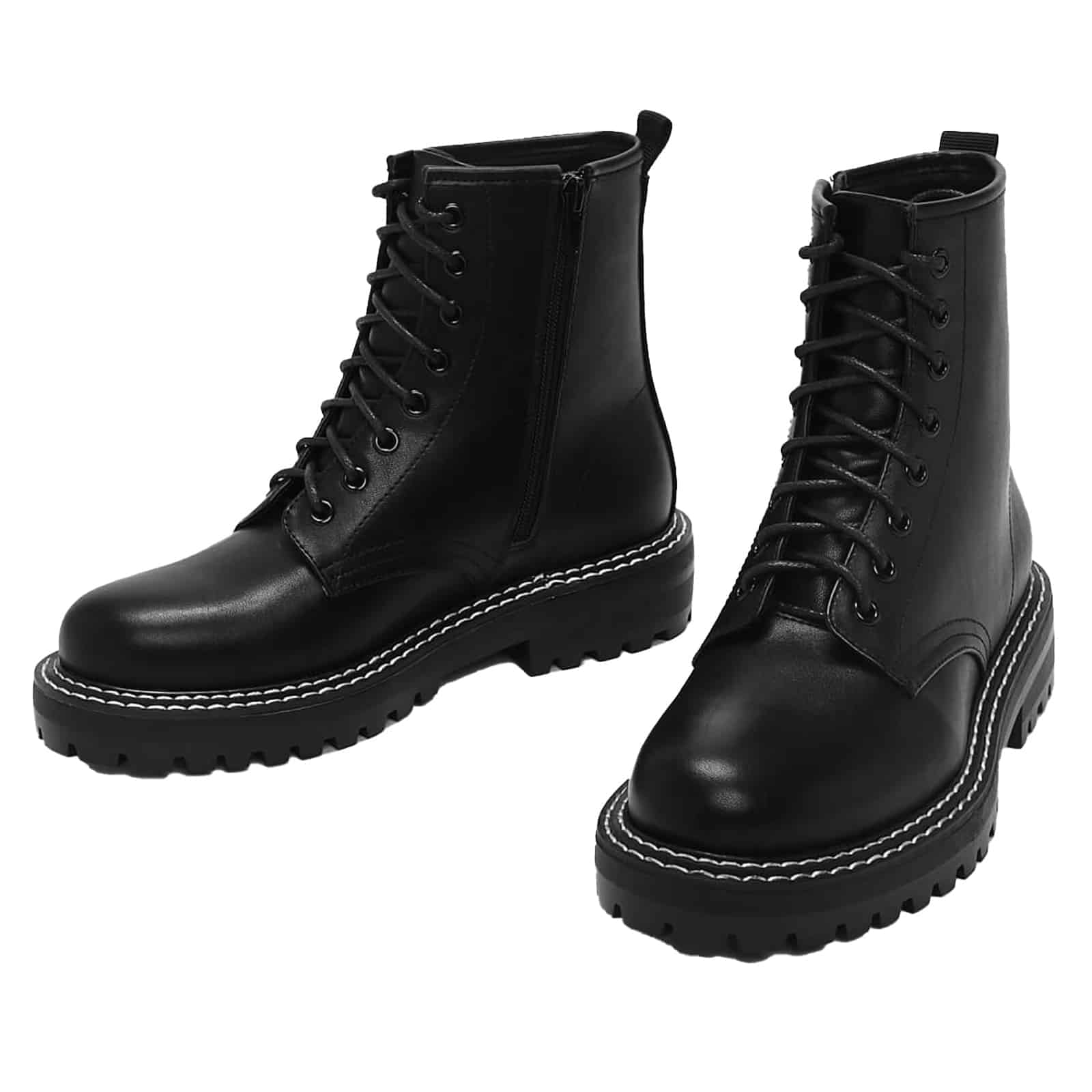 Klassische Ranger mit stabiler Gummisohle, weißer Ziernaht und seitlichem Reißverschluss. Die Front ist mit einer Schnürung versehen. Hinten mit Lasche.