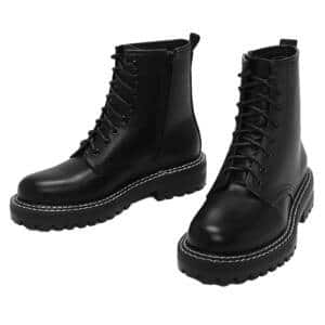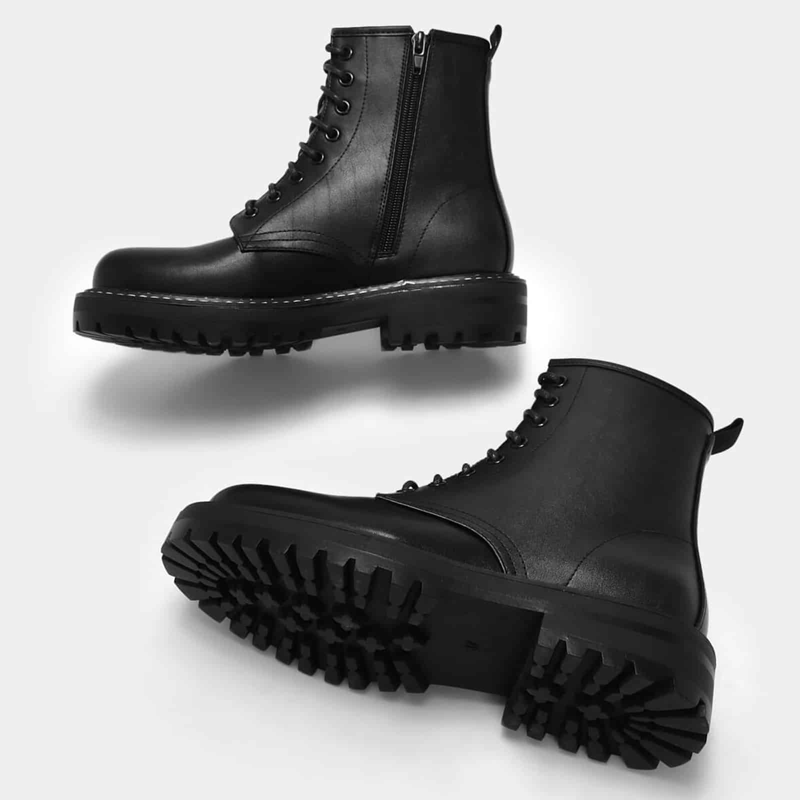 Mattschwarze Stiefel aus Kunstleder mit Plateau und seitlichem Reißverschluss.