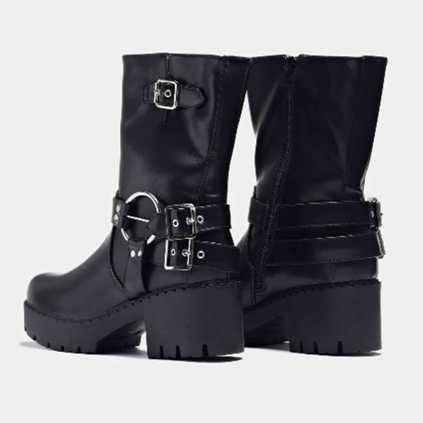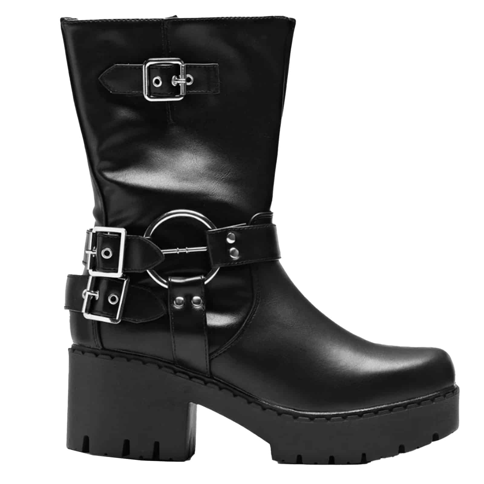 Klassische Stiefel mit hohem Blockabsatz und vorderem Plateau. Für einfaches An- und Ausziehen ist beidseitig Innen ein Reißverschluß verarbeitet. Die Außenseite ist im oberen Bereich mit einer kleiner Schnalle und unten mit zwei Doppelschnallen und einem großen O-Ring verziert.