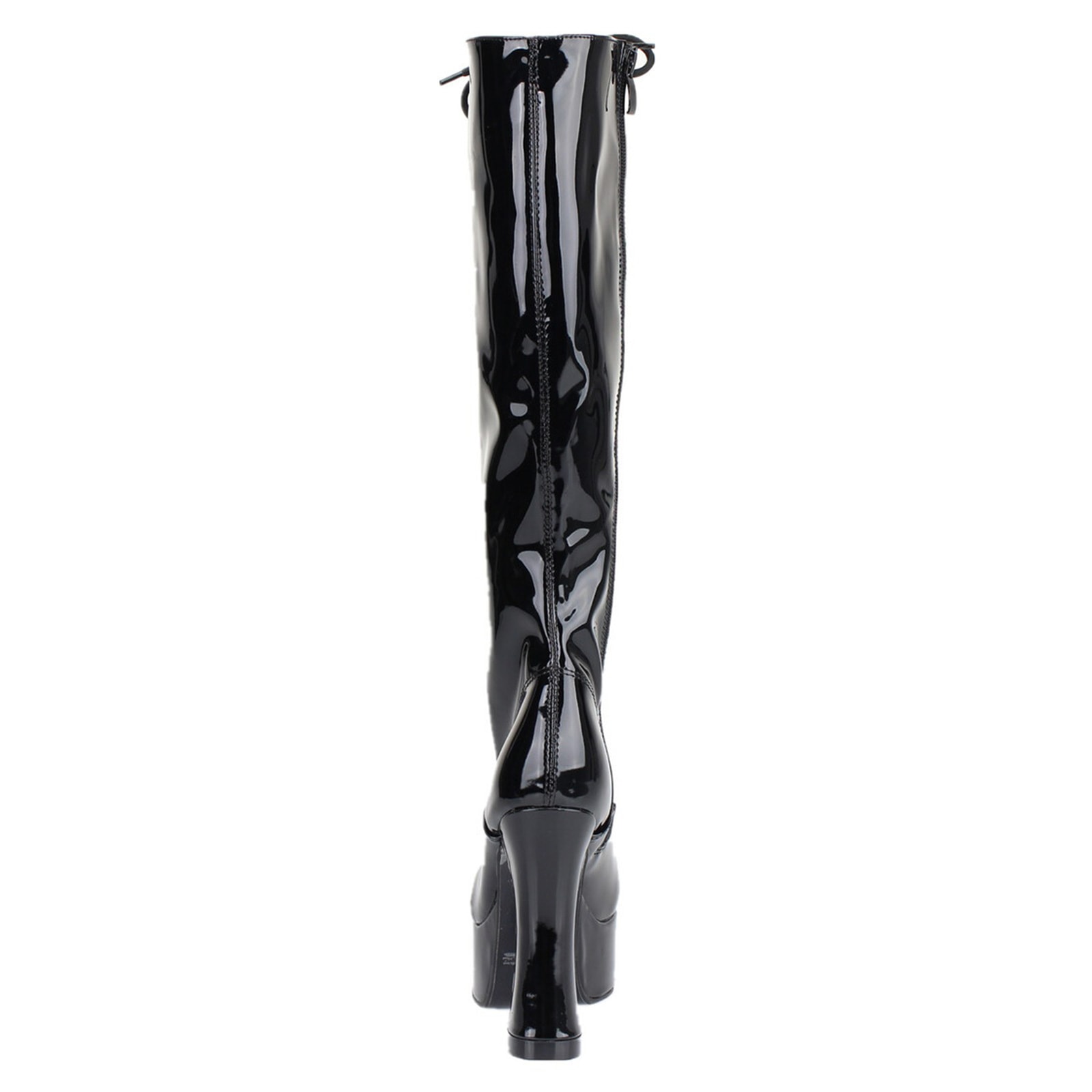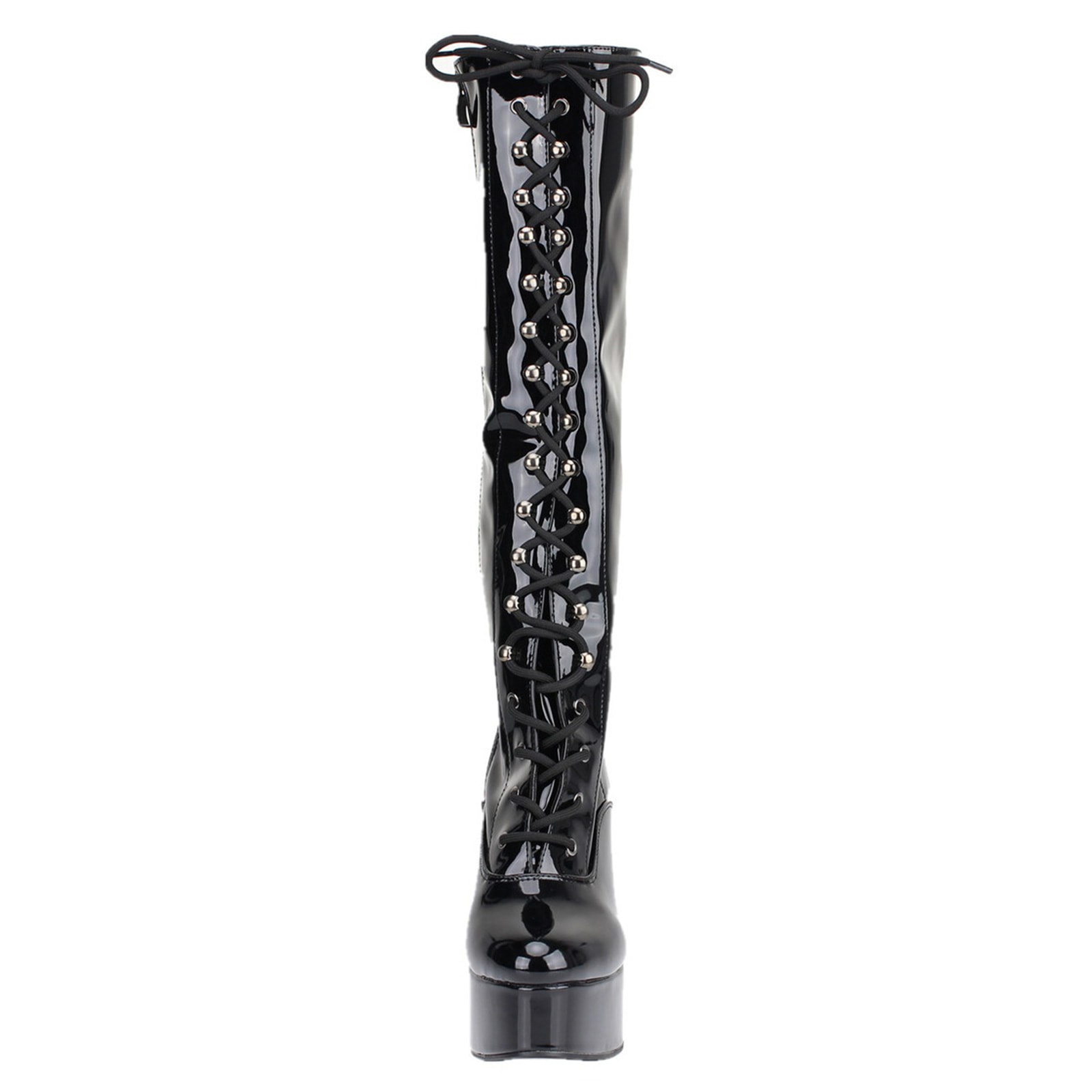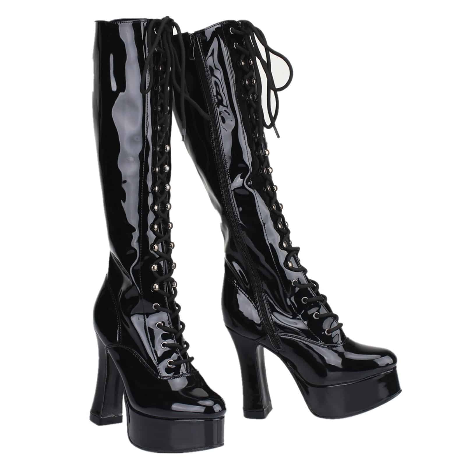 Extravagante kniehohe Lack-Stiefel mit Obermaterial aus Polyurethan und hoher Plateausohle aus elastischem Polymer (EVA).