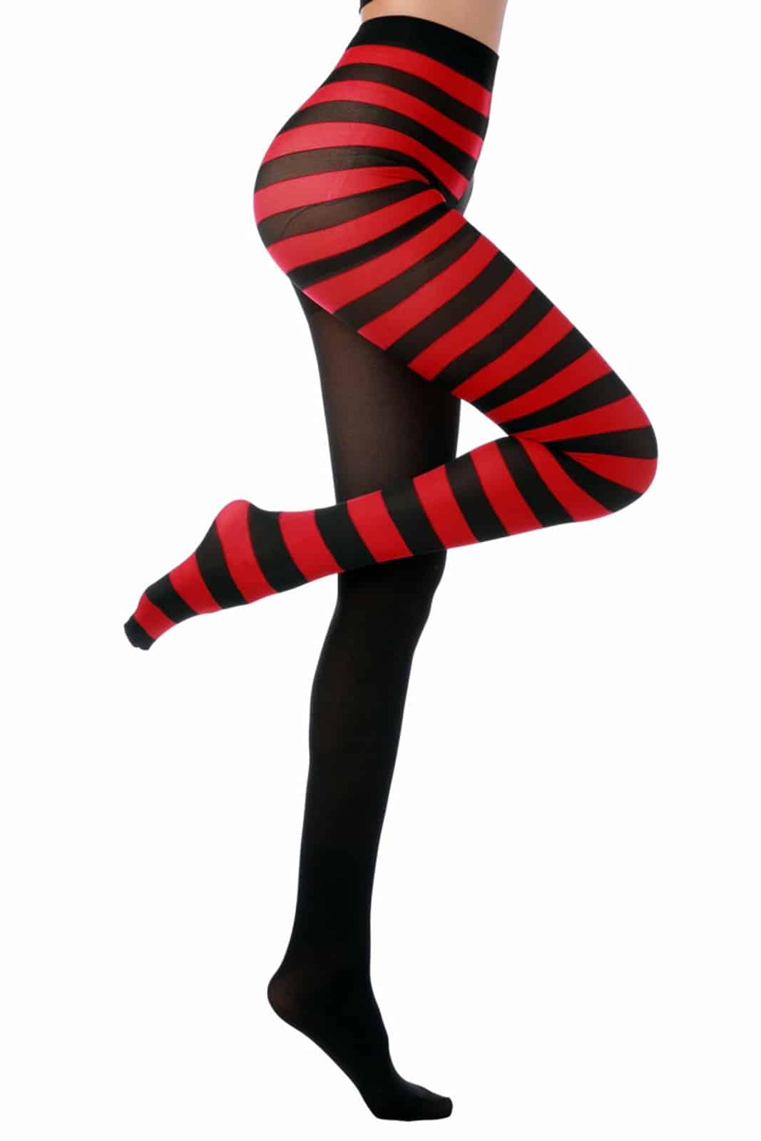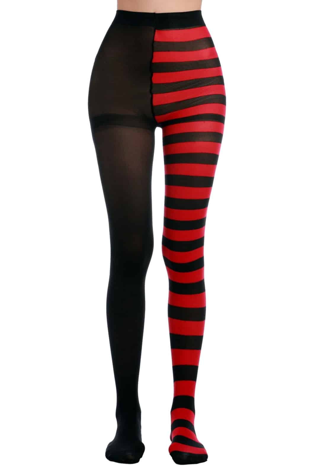 Strumpfhose aus feinmaschigem Netz für alle Gelegenheiten. Ein Bein in schwarz, ein Bein in schwarz/rot gestreift.
