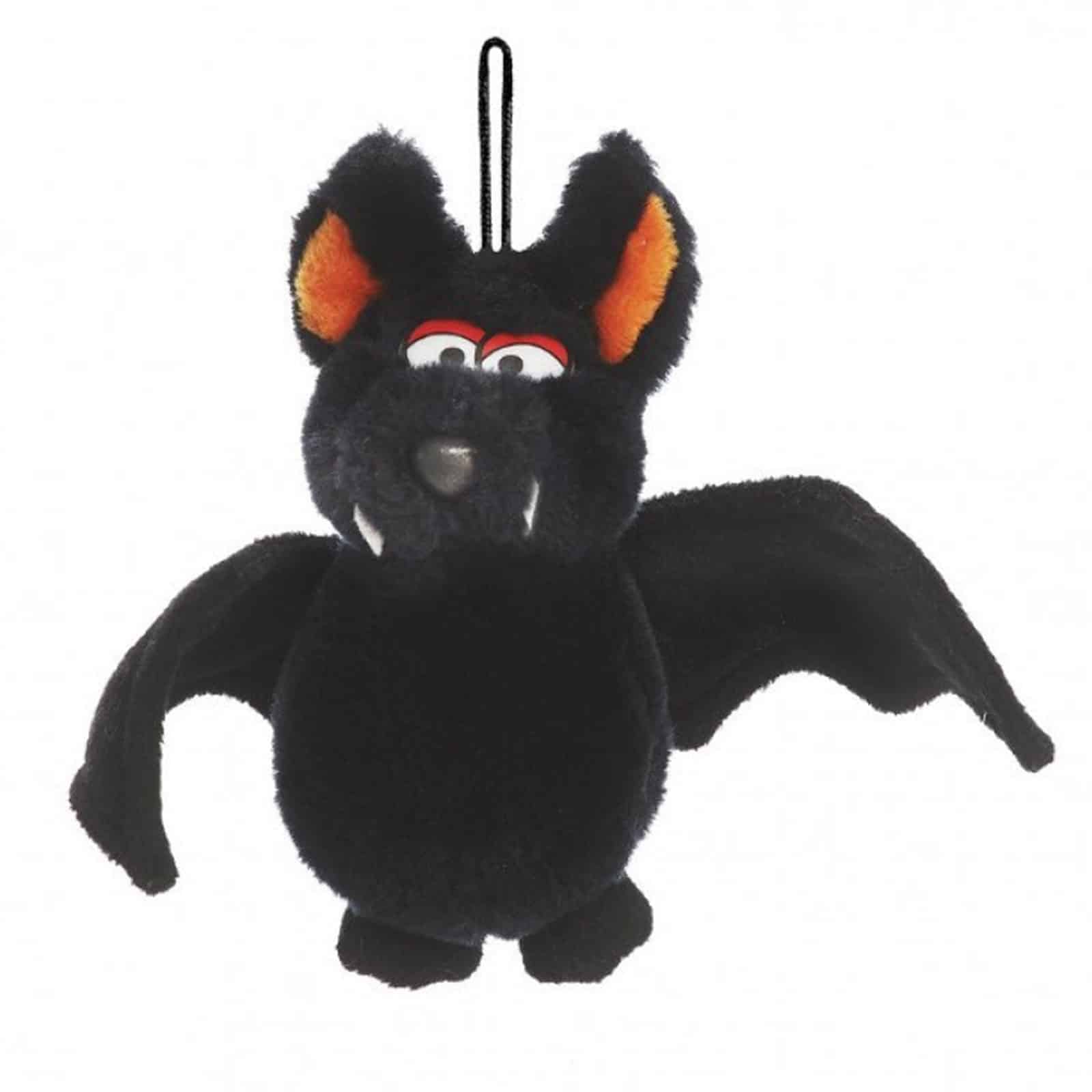 Fledermaus aus weichem Plüsch mit Aufhänger und orangefarbenen Ohren. Mit weichem Plüsch befüllt. Waschbar bei 30°.