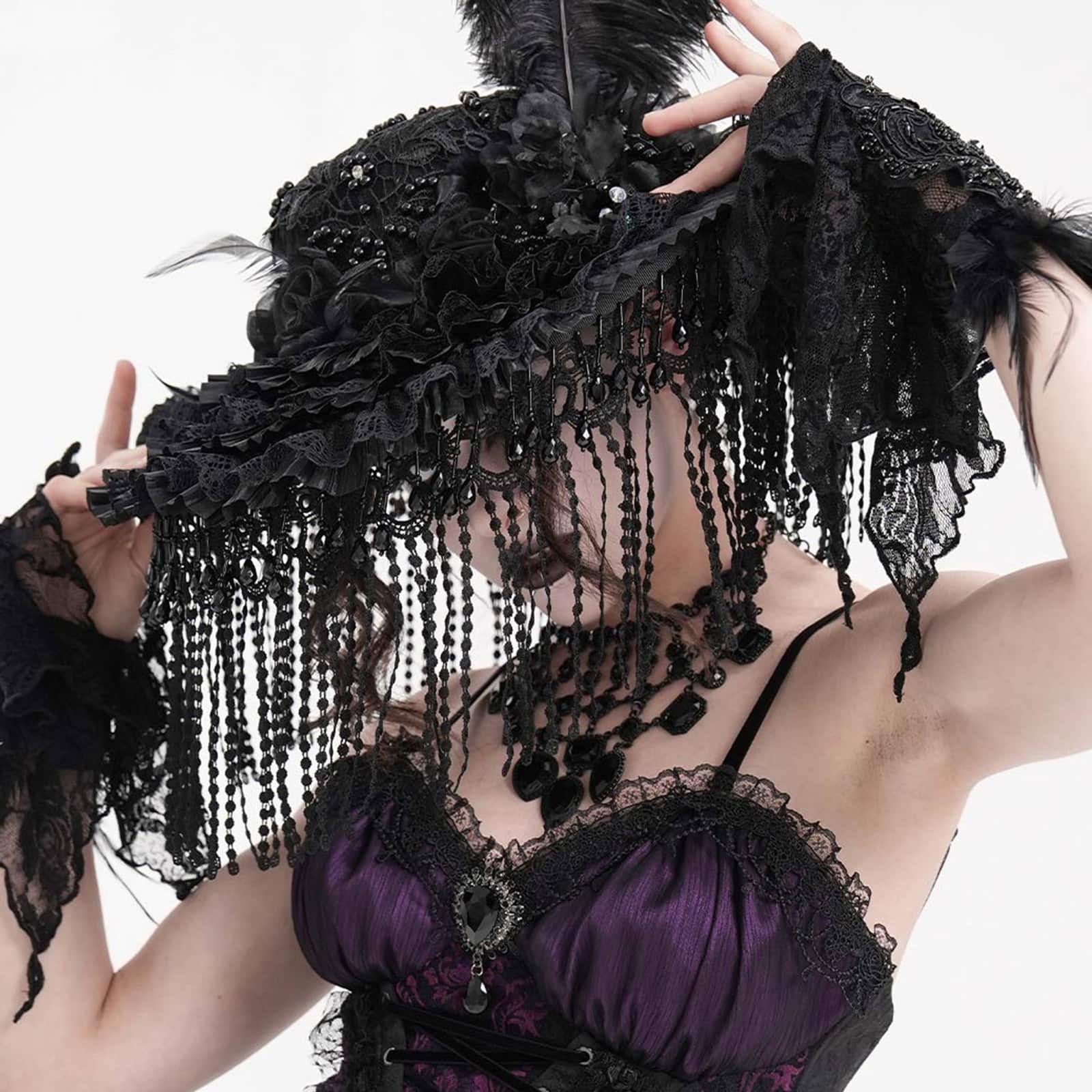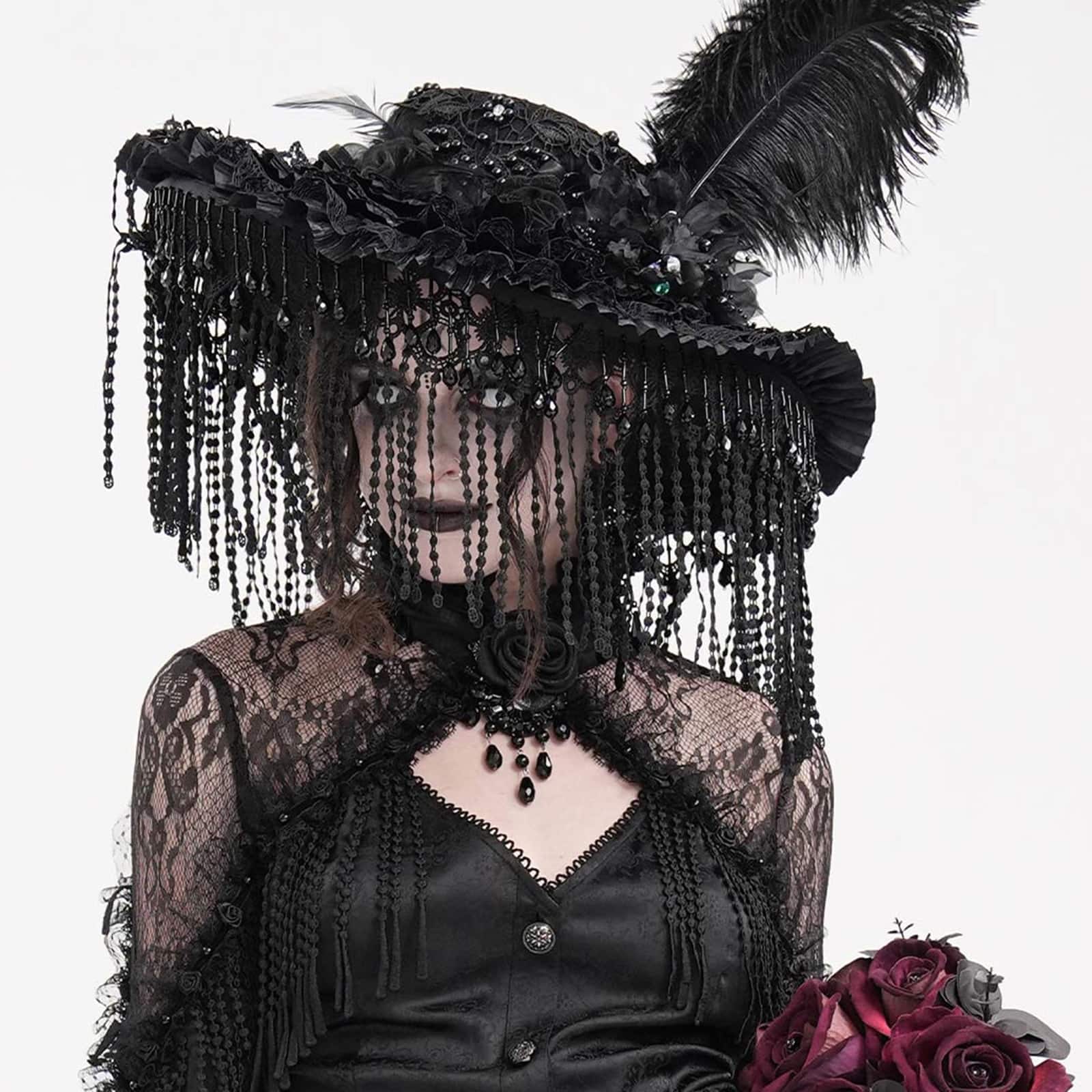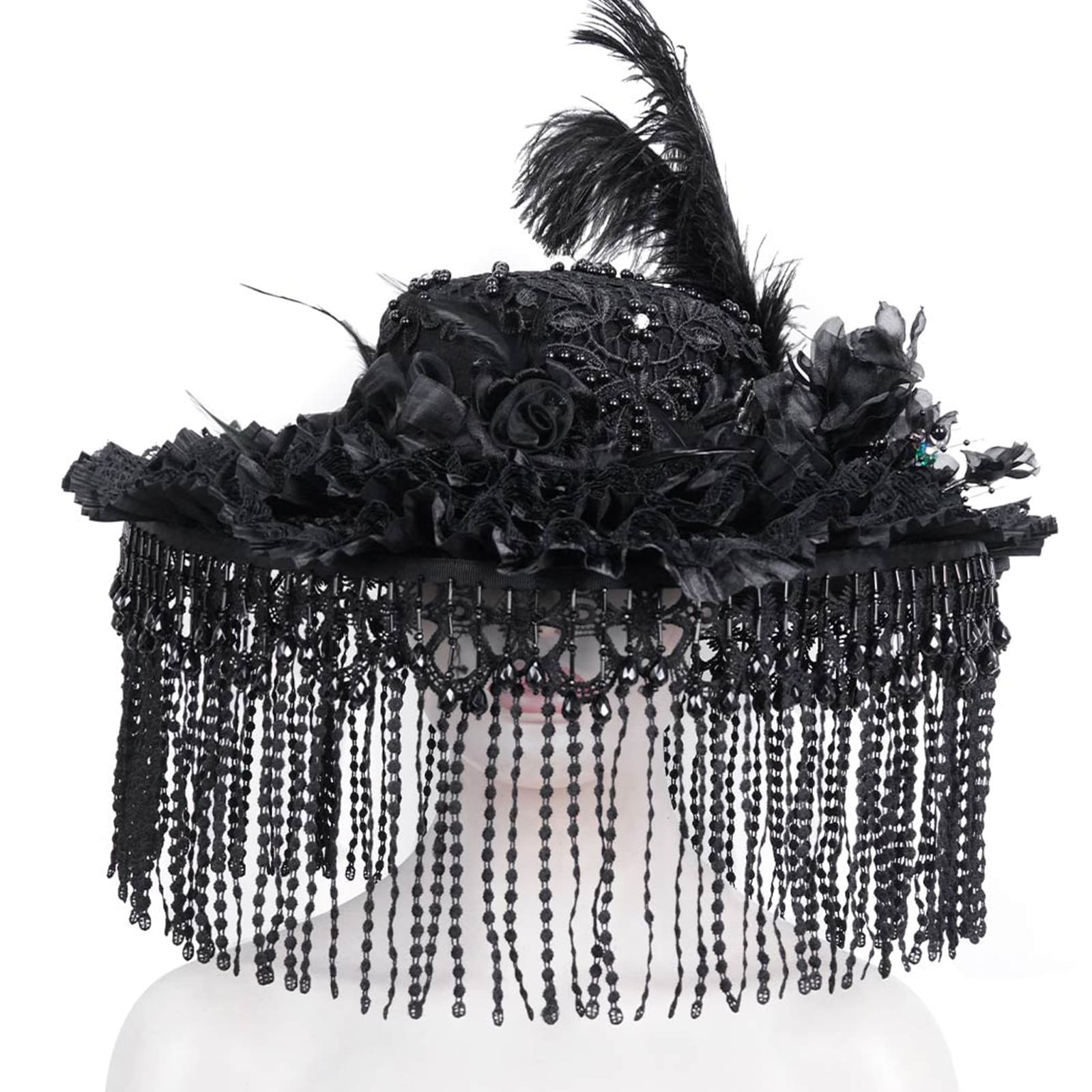 Romantischer Gothic-Hut für Damen mit Rüschen und breiter Krempe und Fransenbesatz