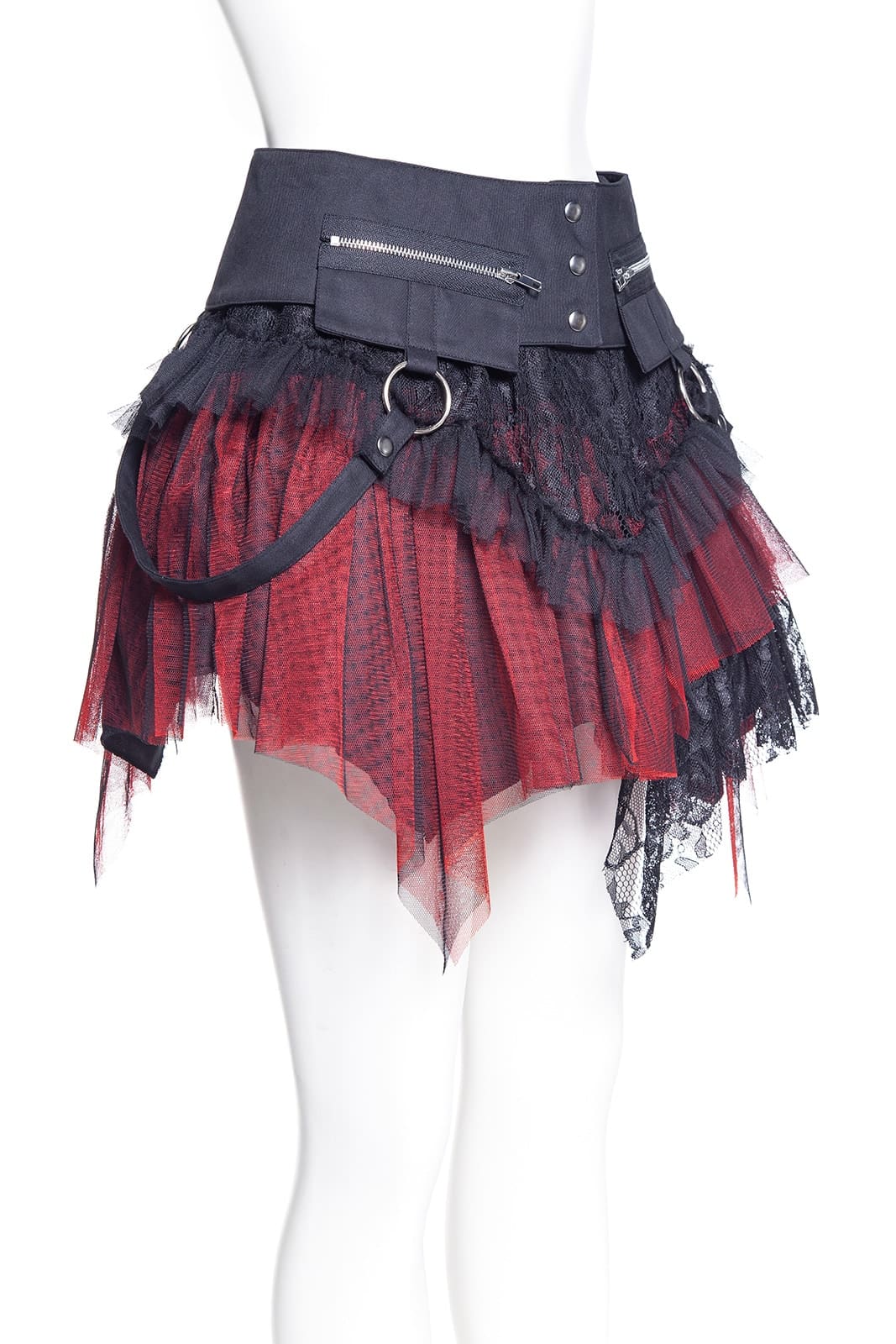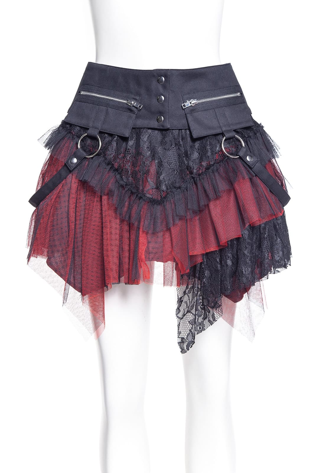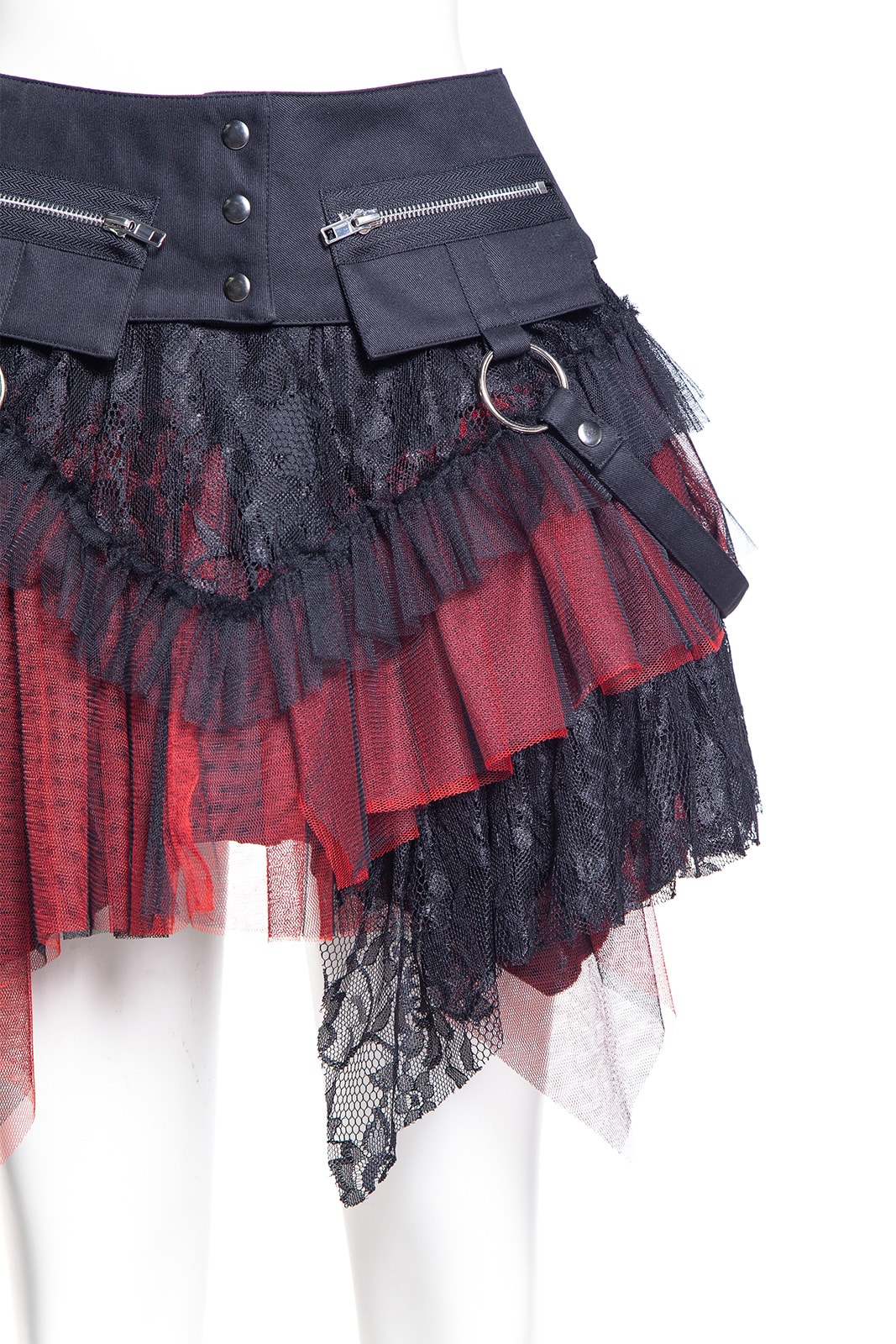 Dieses zweigeteilte Kleidungsstück ist ein echtes Highlight der Gothic-Mode: ein mehrlagiger Minirock mit elastischem Bund und abnehmbarem Overskirt-Gürtel. Der Korsett-inspirierte Bund mit Schnürung, Rüschenlagen, Zipper-Details und Spitze verleiht dem Rock eine auffällige Grunge-Dolly-Note. Beide Teile können separat oder zusammen getragen werden – perfekt für Festivals, Fotoshootings oder ein ausdrucksstarkes Alltags-Outfit. Kombiniert mit Overknee-Socken, Netzstrumpfhosen und Crop Top entsteht ein Look voller Attitüde. Metallringe und der asymmetrische Saum sorgen für zusätzlichen Edge; passt ideal zu Plateauschuhen, Wedges, Chunky Heels oder Combat Boots.