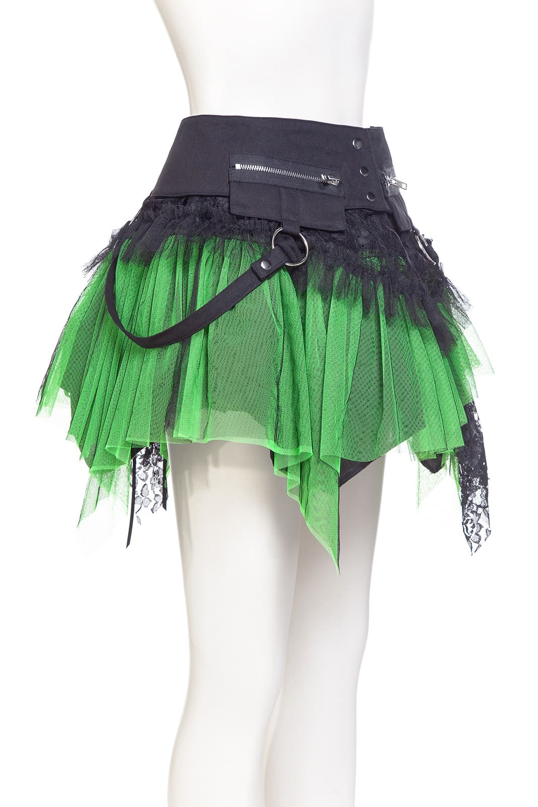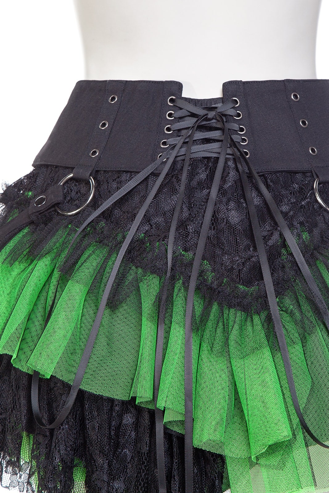 Dieses zweigeteilte Kleidungsstück ist ein echtes Highlight der Gothic-Mode: ein mehrlagiger Minirock mit elastischem Bund und abnehmbarem Overskirt-Gürtel. Der Korsett-inspirierte Bund mit Schnürung, Rüschenlagen, Zipper-Details und Spitze verleiht dem Rock eine auffällige Grunge-Dolly-Note. Beide Teile können separat oder zusammen getragen werden – perfekt für Festivals, Fotoshootings oder ein ausdrucksstarkes Alltags-Outfit. Kombiniert mit Overknee-Socken, Netzstrumpfhosen und Crop Top entsteht ein Look voller Attitüde. Metallringe und der asymmetrische Saum sorgen für zusätzlichen Edge; passt ideal zu Plateauschuhen, Wedges, Chunky Heels oder Combat Boots.